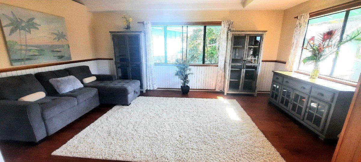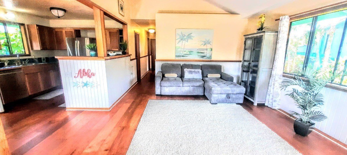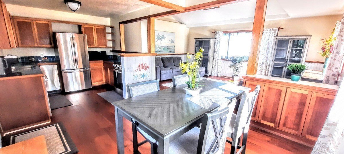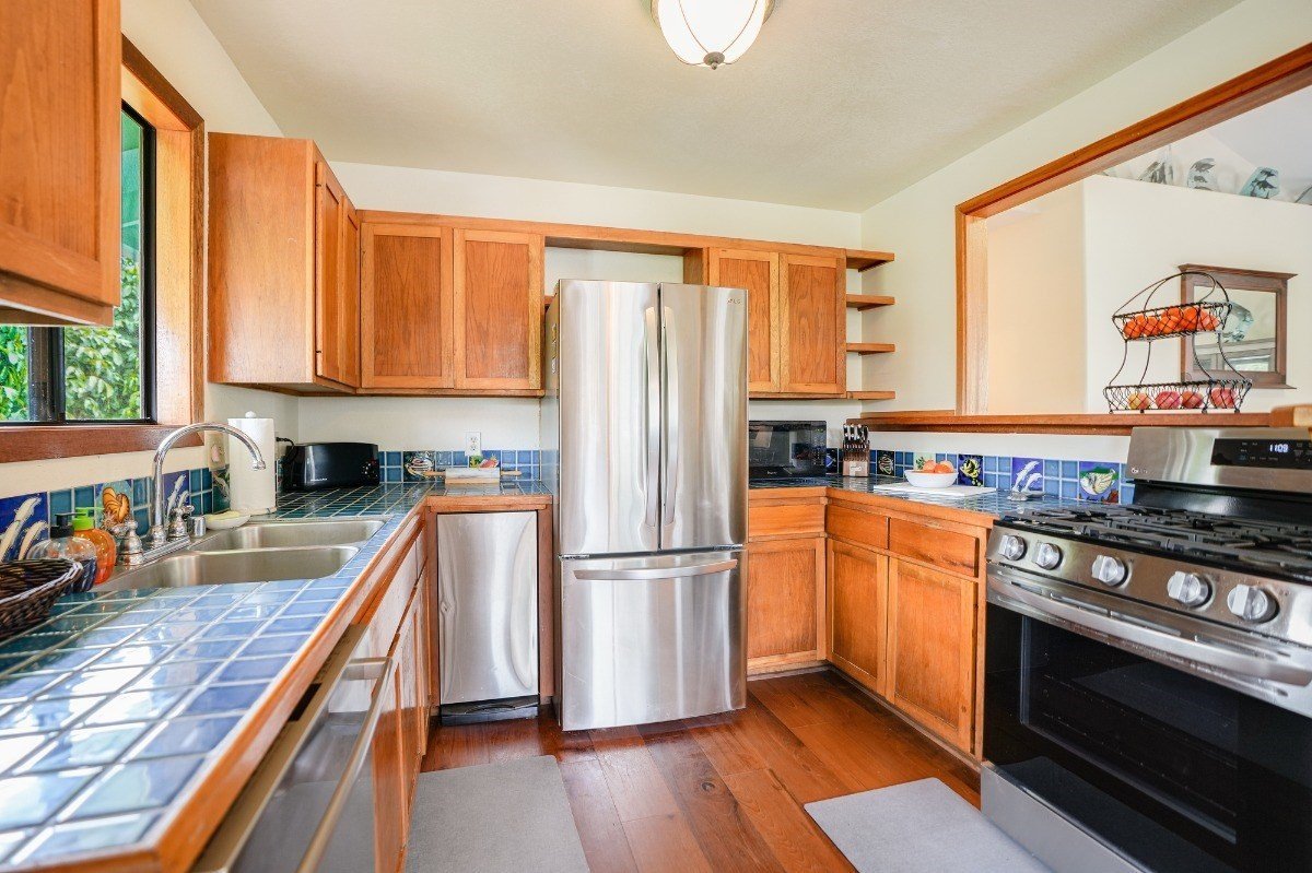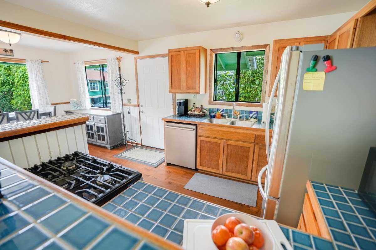 This Hawaiian hale features an open floor plan with vaulted ceilings and all-natural teak wood floors throughout. The beachy blue ceramic tile counters in the kitchen provide a delightful pop of color and blend perfectly with the bright, airy living area. The kitchen holds a Bosch dishwasher and recent upgrades of state-of-the-art stainless steel appliances, including an LG oven, refrigerator and trash compactor.
