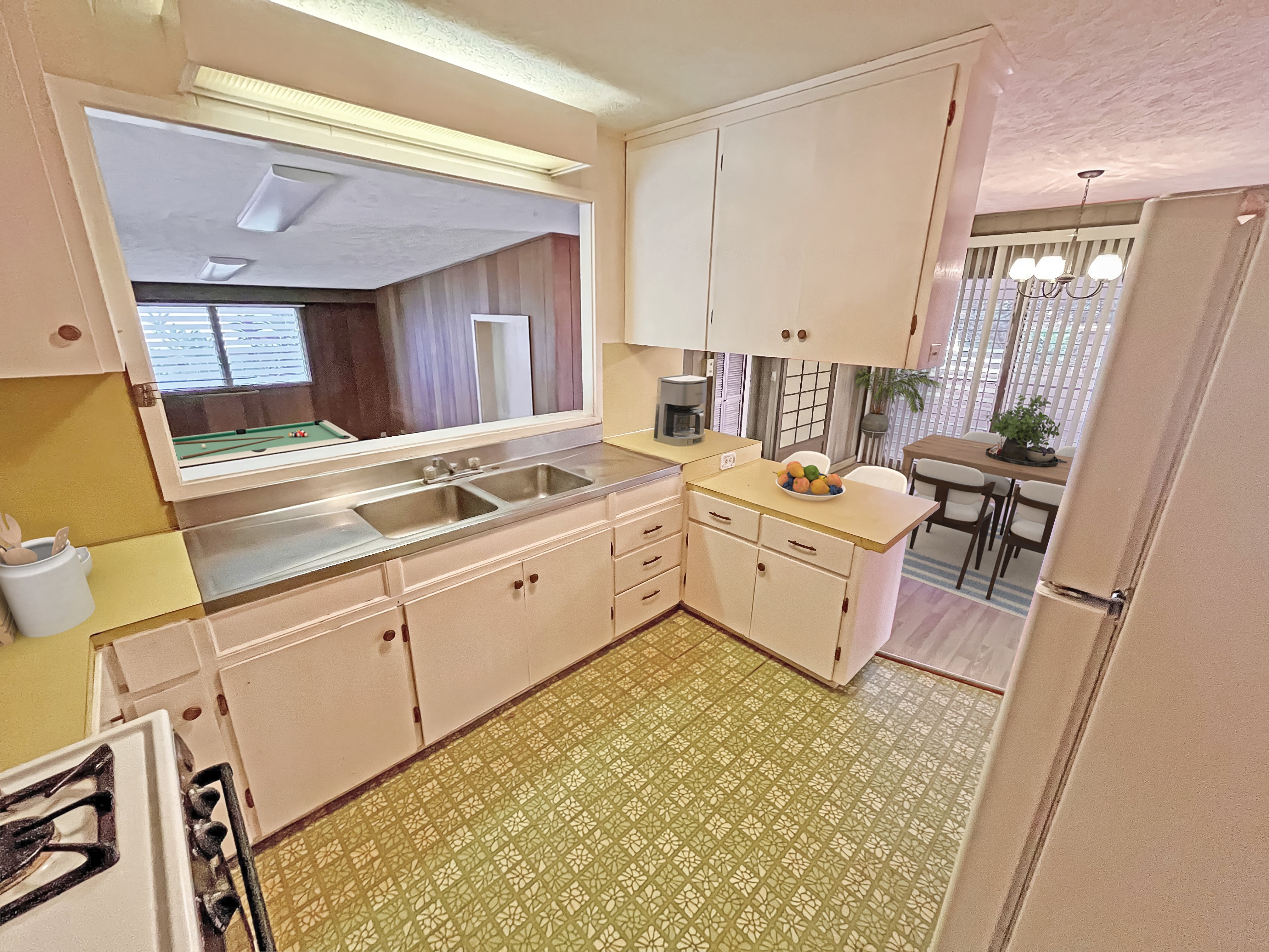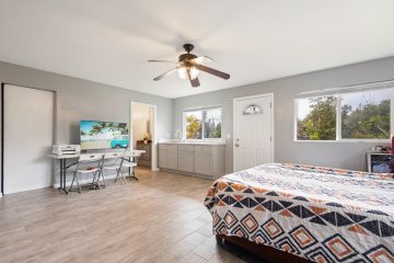 The home features a spacious bonus room with access to a larger covered lanai, offering great space for indoor-outdoor living and entertaining. The enclosed laundry room is conveniently located off the kitchen/dining area and includes a full bath with a traditional Japanese furo soaking tub, providing the perfect place to unwind and relax after a long day.