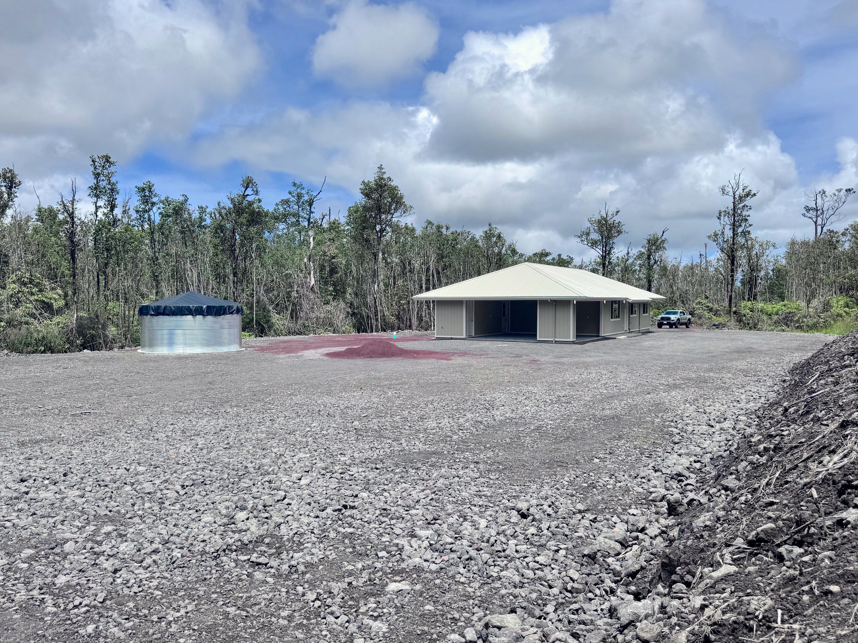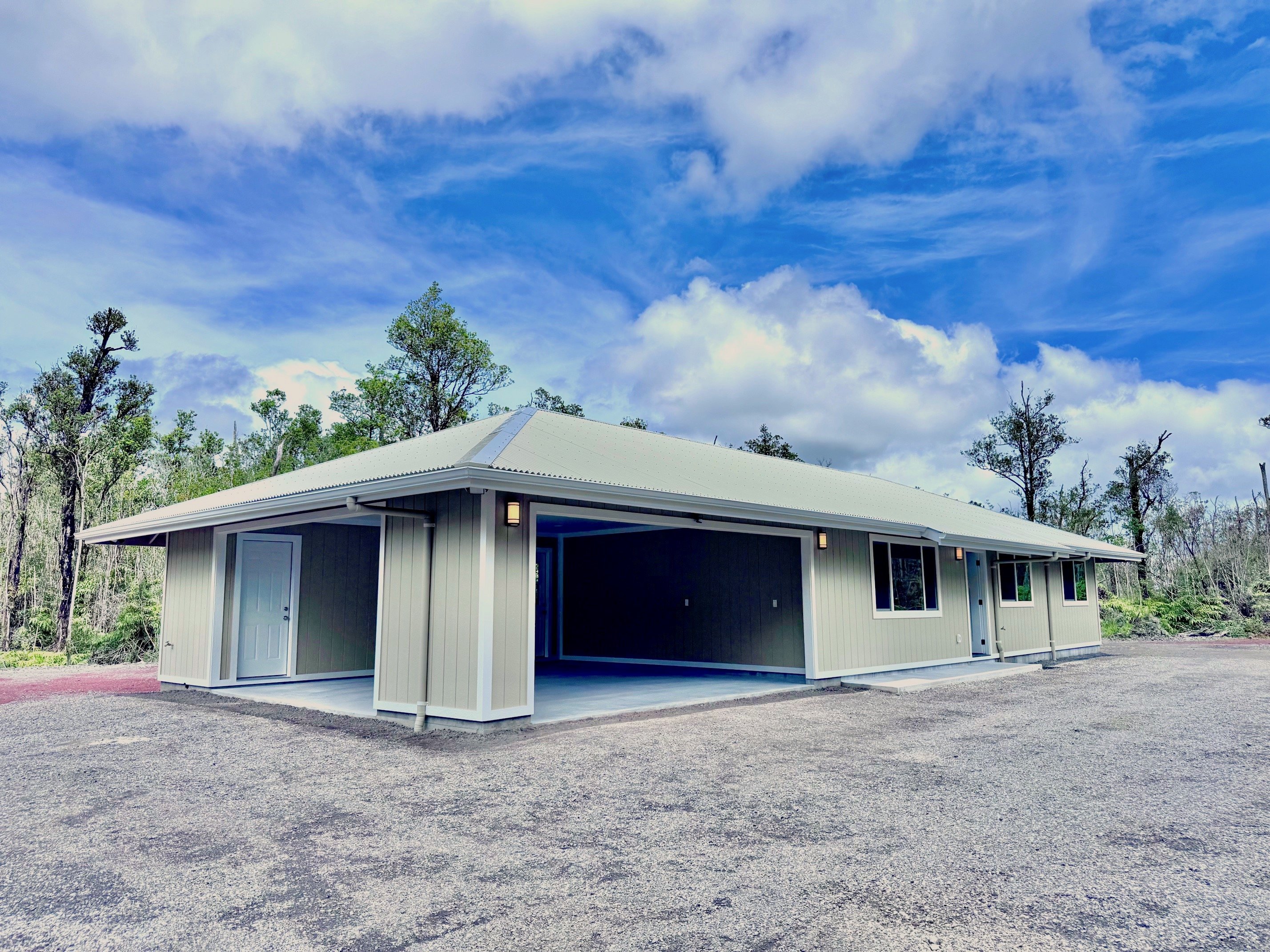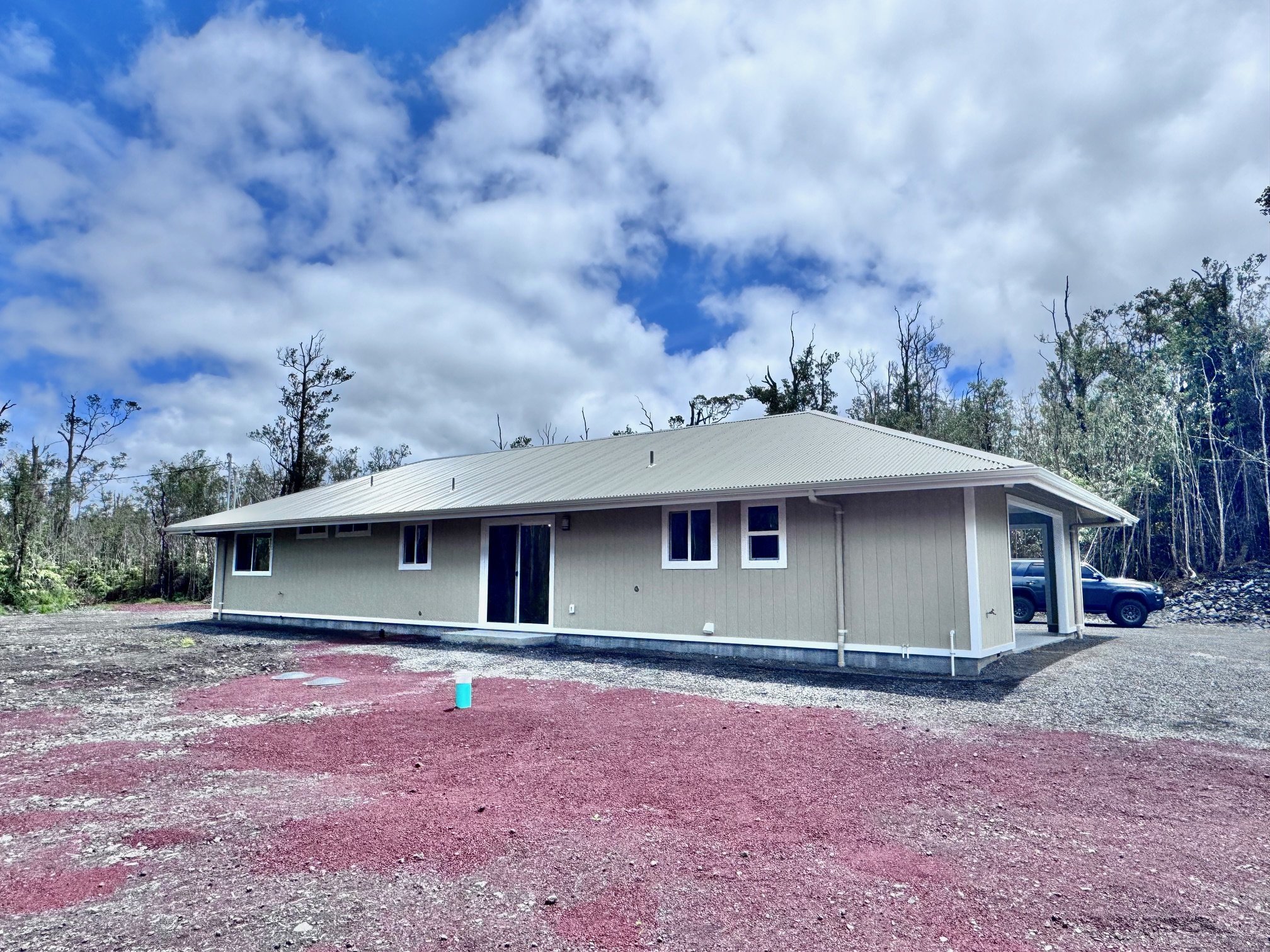 Brand new 2025 build on 3 acres! Three bedroom three bath home located on pavement in cool Fern Forest. Thoughtfully set back from the road, nestled in the Ohi'a forest, the space is quiet and private. The house location was carved out be an easily maintainable yard area but with the sized of this parcel the opportunities are there for farming, orchard or endless creative ideas. Enjoy the temperate climate and this on pavement, low traffic location. This home design is functional and Hawaiian style, with the 3rd full bath and laundry located just behind the carport and off the living area. The three bedrooms and 2 baths located at the other end of the home. There is a spacious open concept living, dining and kitchen area with sliding door to access the back side of the home. Tons of lighting, fans and natural light. This home boasts all the latest amenities and features including: custom tiled showers quartzite counters recessed lighting top of the line new appliances sink disposal lifeproof flooring closet lighting utility sink 3rd full bath new 10k gallon catchment tank custom built in shelving pantry and ample cabinetry and more... Fern Forest Vacation Estates sits at about the 2500 foot elevation and is just a short drive from Volcano Village with access to restaurants, stores, hiking and the Hawaii Volcanos National Park. This is a growing subdivision nestled in the native forest. Enjoy the carefree feeling of a brand new home along with the privacy and space 3 expansive acres can provide!