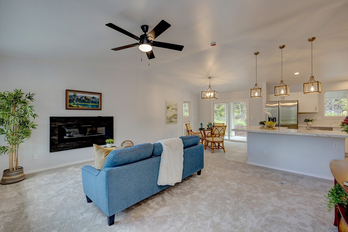 This brand new 3-bedroom, 2-bathroom home is situated on nearly half an acre toward the front of Royal Hawaiian Estates on Alii Koa St, offering easy access to Hwy 11. Whether you're heading up the hill to Volcano Village and Volcanoes National Park, or down to Keaau and Hilo, you'll enjoy quick and convenient travel.Inside, the open-concept design with vaulted ceilings adds a touch of luxury, while the glow of the electric fireplace and soft carpeting in the living area provides warmth and comfort during the cooler Volcano evenings.The kitchen and dining area are designed for effortless entertaining, featuring a spaciousv L-shaped island where friends and family can gather and chat while the host prepares meals. Down the hallway, you'll find two guest bedrooms, a bathroom, and two linen closets, leading to the private primary bedroom with an en suite bathroom. The en suite boasts a generous shower, a stunning double-sink vanity, and a large walk-in closet.Surrounded by lush, natural foliage, the back lanai is perfect for hosting friends and family for get-togethers or simply relaxing in the serene environment.Property taxes are based on vacant land assessment.