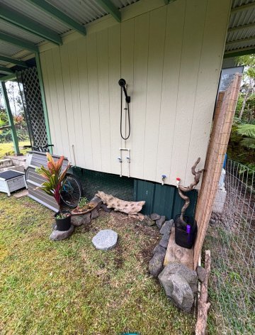 Rarely available beautiful turnkey off grid 3-acre property located at the very front of the Fern Forest Vacation Estates subdivision on paved Ala Kapena (no need to drive 15 minutes on unpaved roads to get home!). With a recently renovated cabin offering approximately 528 sq ft of living space, this cozy retreat features 2 comfortable bedrooms (each with its own half bath), an inviting entry/living area with a functional kitchen space, and a full bathroom (with separate shower). The home comes with its own new compact and sufficient solar system with panels and inverter; a complete water catchment system with water pump, pressure tank and filtration; and an efficient on demand propane water heater. Another bedroom was recently ingeniously built near the home, under a tent on top of a solid wooden platform, and tastefully furnished. This guest suite also boasts its own solar system for all its electrical needs. Nearby is a large nursery recently used to grow tomatoes and a very large tent cover in front of the house, ideal for parking or multiple projects. There is an incredible cave entrance in the back of the property with lava tubes! Most of the 3 acres is forest with ohia trees, ferns, and orchids, with several mature fruit trees (citrus, avocado).The property front entrance is landscaped, with an entry gate and fencing for added privacy, and a winding road, surrounded by lush vegetation, accessing the house. Should you need to connect to the grid, electricity is available through Hawaiian Electric Special Subdivision Project Provision (SSPP), with an estimated fee of $2,844. Fern Forest Volcano Estates is located higher up the mountain with cooler temperatures, between quaint Volcano and convenient Keaau. For complete subdivision details and documents, visit htttps://fernforestcommunityassociation.com.