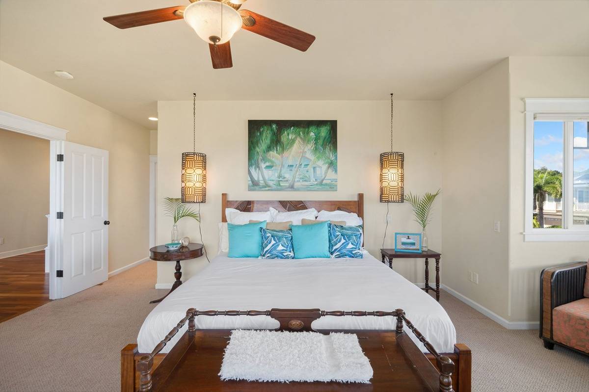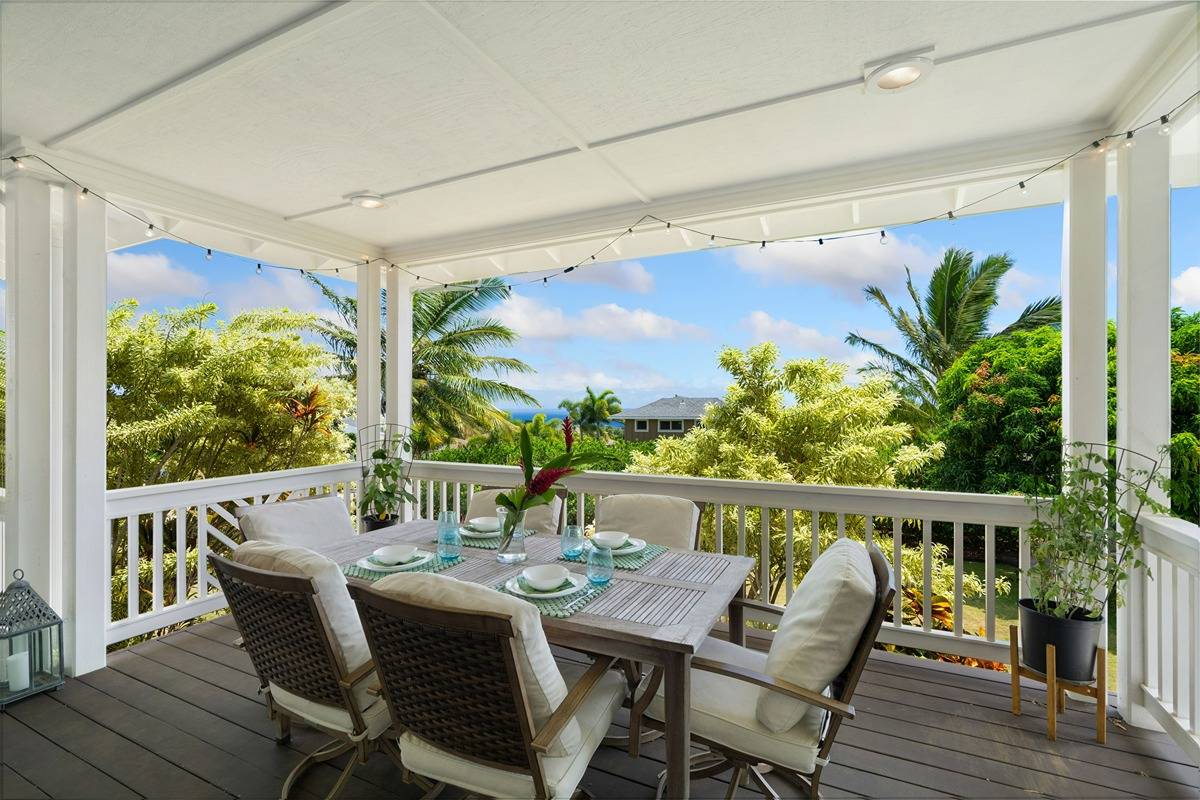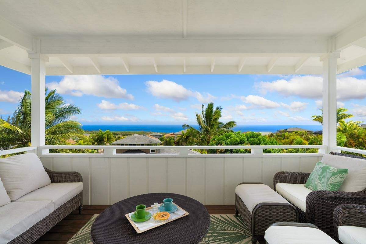 Elegance, a perfect word to describe your arrival as you walk up the front steps and onto the spacious covered, wrap around lanai (+1000 Sq ft) of 1161 Nohea Street. The open floor plan allows for easy access inside and outside with three sets of large French doors overlooking lush landscaping and the ocean beyond. Built and designed by Brent Olson, this exceptional property has custom finishes that include Australian hardwood floors, crown molding, wainscotting, pillars/posts accents, numerous closets, and built-in shelves, as well as canned lighting, wrought iron interior fixtures, and enough DeWils kitchen cabinets, counter and storage space to make any chef smile. The 1st floor office or living suite, with a private entrance off the lanai, has Plantation shutters and ADA compliant bathroom with zero entry shower for any family member needing their own space. The 2nd floor master suite has oversized windows that bring in abundant light and ocean views, along with a deep soaking tub, shower, walk-in closet, and double sinks with granite countertops. Two bedrooms on the 2nd floor each have closets with organizer shelves, Plantation shutters, ceiling fans, and share a deluxe bathroom with dual sinks, granite countertop, and two extra storage closets. As a bonus, the 2nd floor covered lanai offers breathtaking views of the ocean, sunrises, coffee fields, and Poipu. The exterior grounds have a notable selection of native species that enhance the home’s natural beauty. * Kakela Makai Oceanview Subdivision has a unique homeowner’s recreation center with a swimming pool, jacuzzi, and fitness center. Homeowners can reserve the party room for private events with association approval. Kalaheo has easy access (15 minutes) to either Poipu Beach and the southside, or the westside towns of Eleele and Hanapepe, along with entry to Waimea Canyon and Kokee State Park. If you’re a golfer, a little gem awaits at the 9-hole Kukui’olono Golf Course sitting just above Kakela Makai.