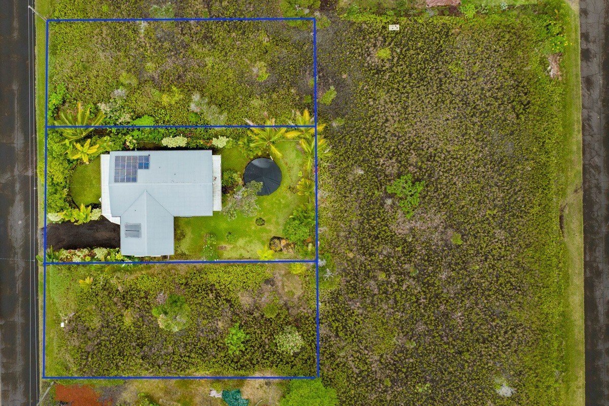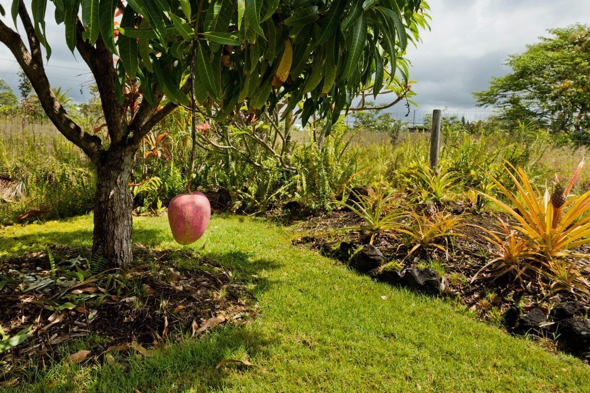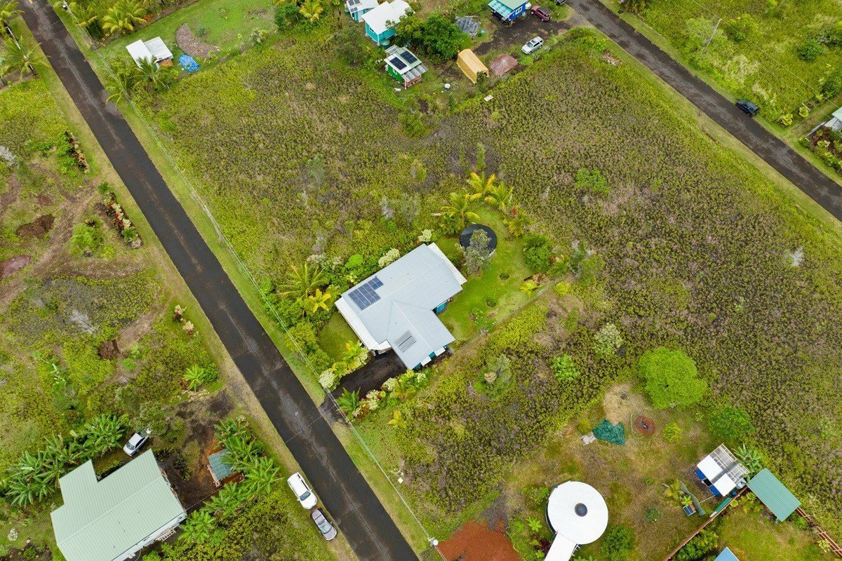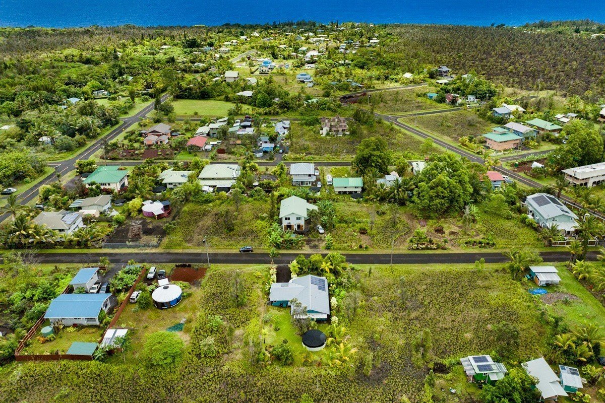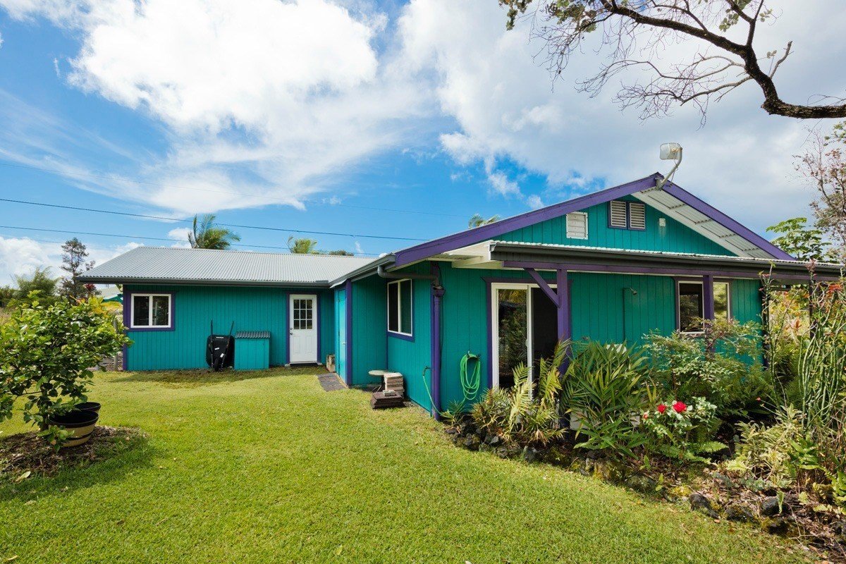 Best of Seaview! You will fall in love with this beautifully furnished, TURN KEY, 1,596 sq ft PRIVATE OASIS, with gardens and fruit trees! Welcome home, through your 260 sq ft screened and sunshine-filled lanai looking out to the colorful gardens. You will be impressed by how meticulously maintained the home is! The kitchen, dining, and living room areas are open, promoting a relaxed, easy flow Hawaii lifestyle. The kitchen features ample cabinet/counter space and an extra wide breakfast bar. The kitchen and bath cabinets were remodeled in 2017 with solid wood and custom tile. The home is kept cool with attractive slate flooring throughout, AC units in the living room and primary suite, and an insulated attic. All 3 bedrooms are comfortable and enjoy pretty views through large picture windows promoting ample airflow. The fenced-in backyard is stunning! Enjoy your spacious and lush backyard, eating delicious and freshly harvested mangos, white pineapples, citrus, and avocado. Be delighted with the variety of tropical flowers and palms. The home is buffered on each side with vacant lots that are also listed for sale for $39,000 each (MLS , so you can plant your orchards, extend your gardens or keep them all natural. Situated in the middle of the block, with very little traffic and so much peace and quiet. Low carbon footprint and monthly power bills! Power is via solar (Sun Run lease, Buyer to qualify). Hot water is via a separate solar system, and owned outright. The rainwater catchment tank is 10,000 gallons, and has a UV light with 3 phase filtration for pure, delicious water. Close to Kehena Beach, and the popular “Seaview Lawn” where you can relax under the gently swaying coconut trees overlooking the Pacific Ocean with your neighbors for whale watching, sunrises, sunsets, picnics, or solo meditation in nature. Life is good!