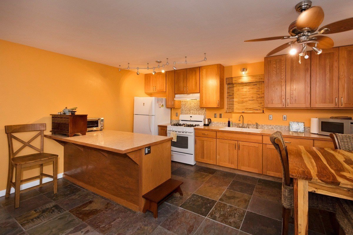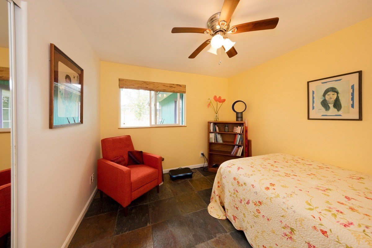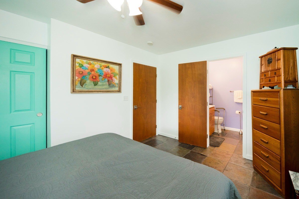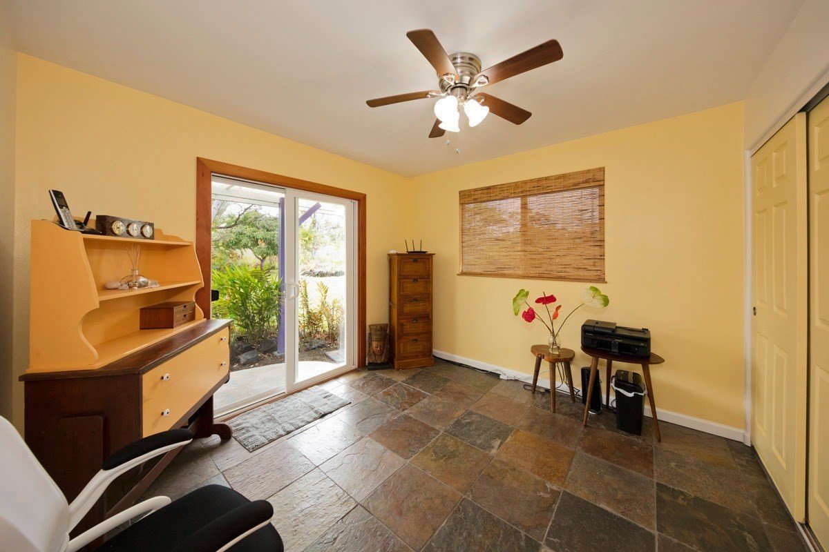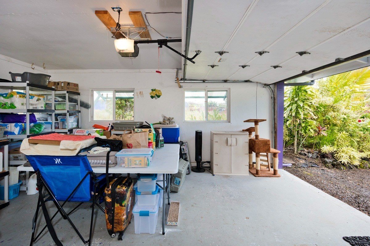 Best of Seaview! You will fall in love with this beautifully furnished, TURN KEY, 1,596 sq ft PRIVATE OASIS, with gardens and fruit trees! Welcome home, through your 260 sq ft screened and sunshine-filled lanai looking out to the colorful gardens. You will be impressed by how meticulously maintained the home is! The kitchen, dining, and living room areas are open, promoting a relaxed, easy flow Hawaii lifestyle. The kitchen features ample cabinet/counter space and an extra wide breakfast bar. The kitchen and bath cabinets were remodeled in 2017 with solid wood and custom tile. The home is kept cool with attractive slate flooring throughout, AC units in the living room and primary suite, and an insulated attic. All 3 bedrooms are comfortable and enjoy pretty views through large picture windows promoting ample airflow. The fenced-in backyard is stunning! Enjoy your spacious and lush backyard, eating delicious and freshly harvested mangos, white pineapples, citrus, and avocado. Be delighted with the variety of tropical flowers and palms. The home is buffered on each side with vacant lots that are also listed for sale for $39,000 each (MLS , so you can plant your orchards, extend your gardens or keep them all natural. Situated in the middle of the block, with very little traffic and so much peace and quiet. Low carbon footprint and monthly power bills! Power is via solar (Sun Run lease, Buyer to qualify). Hot water is via a separate solar system, and owned outright. The rainwater catchment tank is 10,000 gallons, and has a UV light with 3 phase filtration for pure, delicious water. Close to Kehena Beach, and the popular “Seaview Lawn” where you can relax under the gently swaying coconut trees overlooking the Pacific Ocean with your neighbors for whale watching, sunrises, sunsets, picnics, or solo meditation in nature. Life is good!