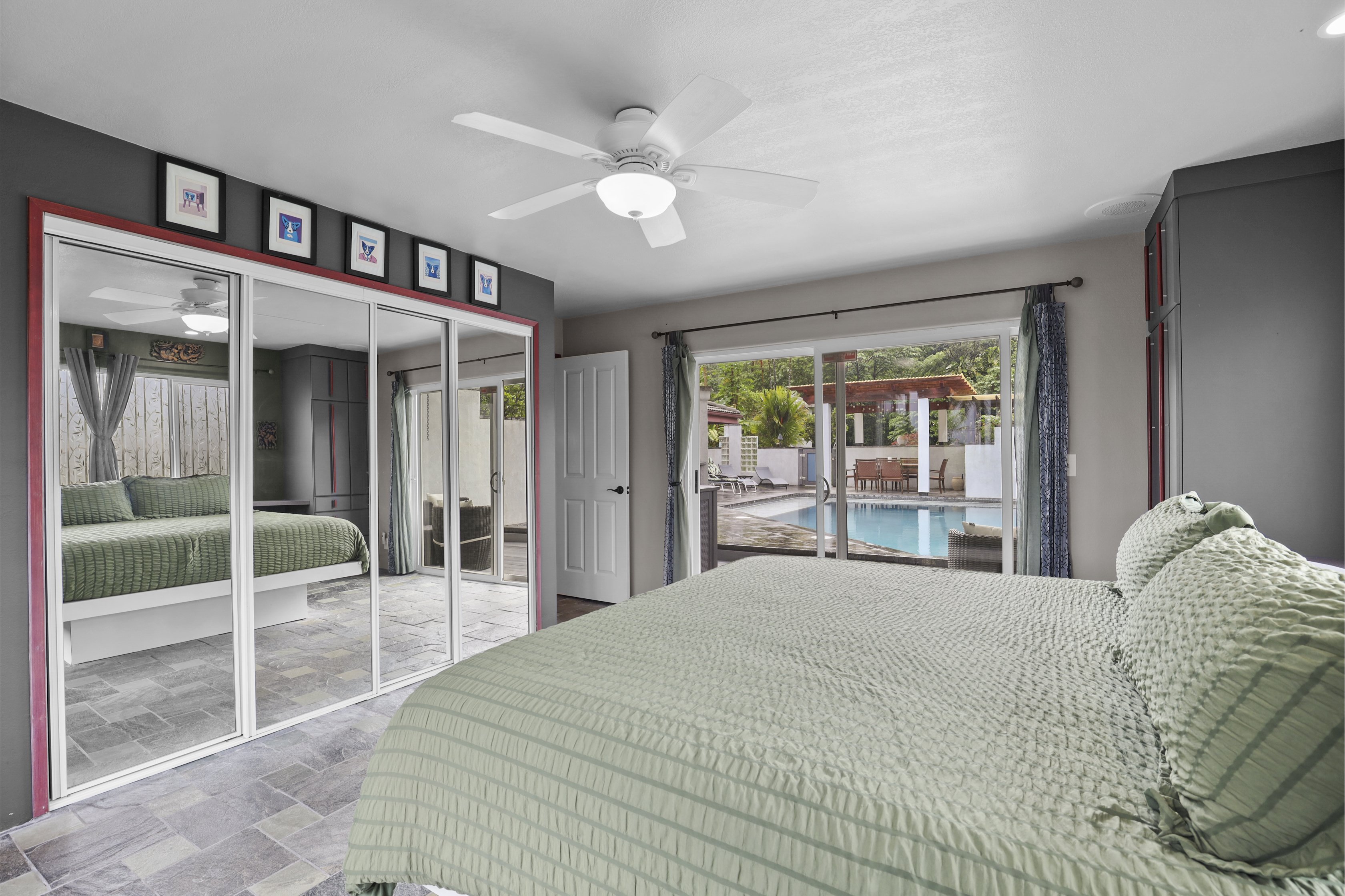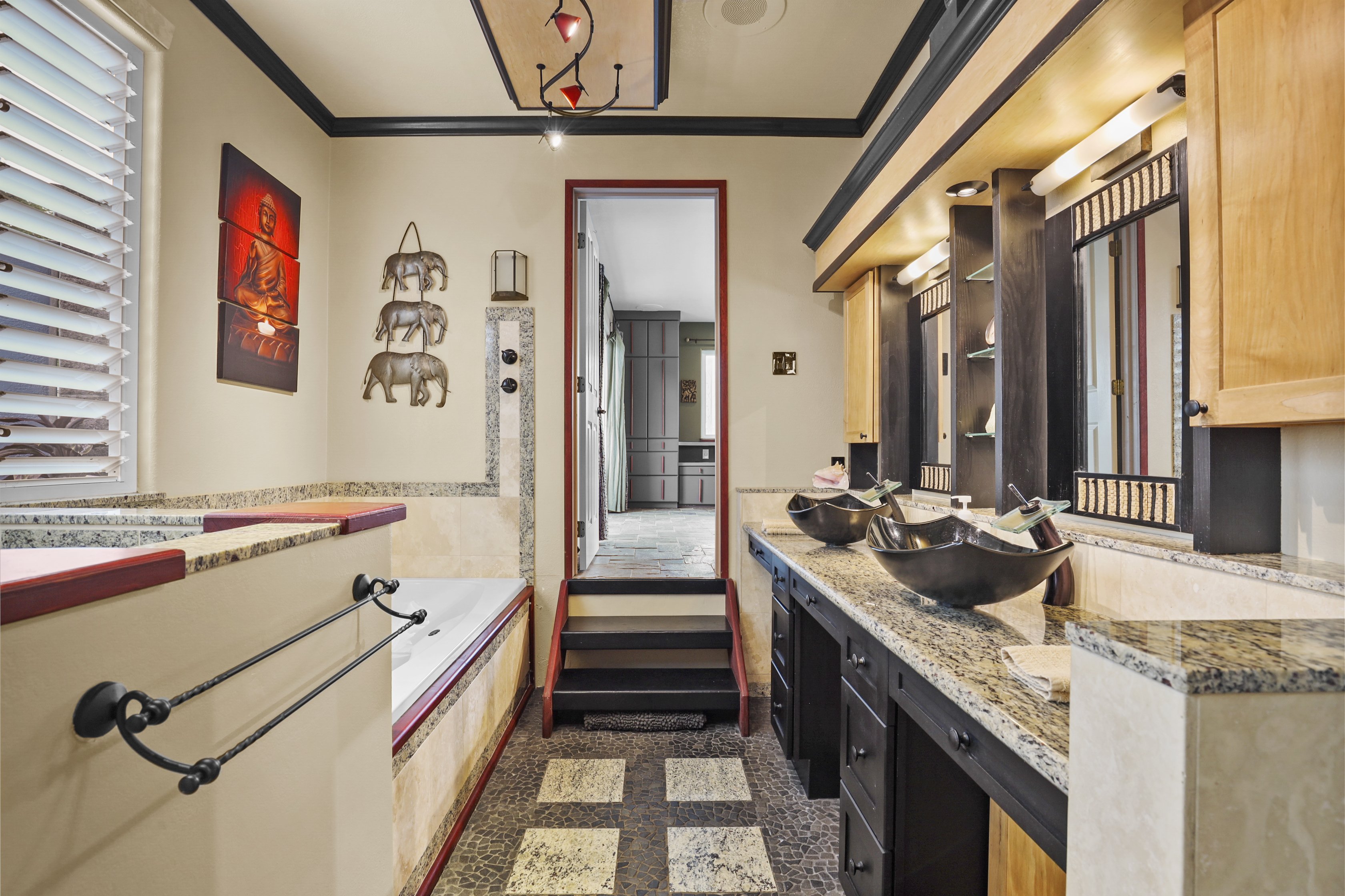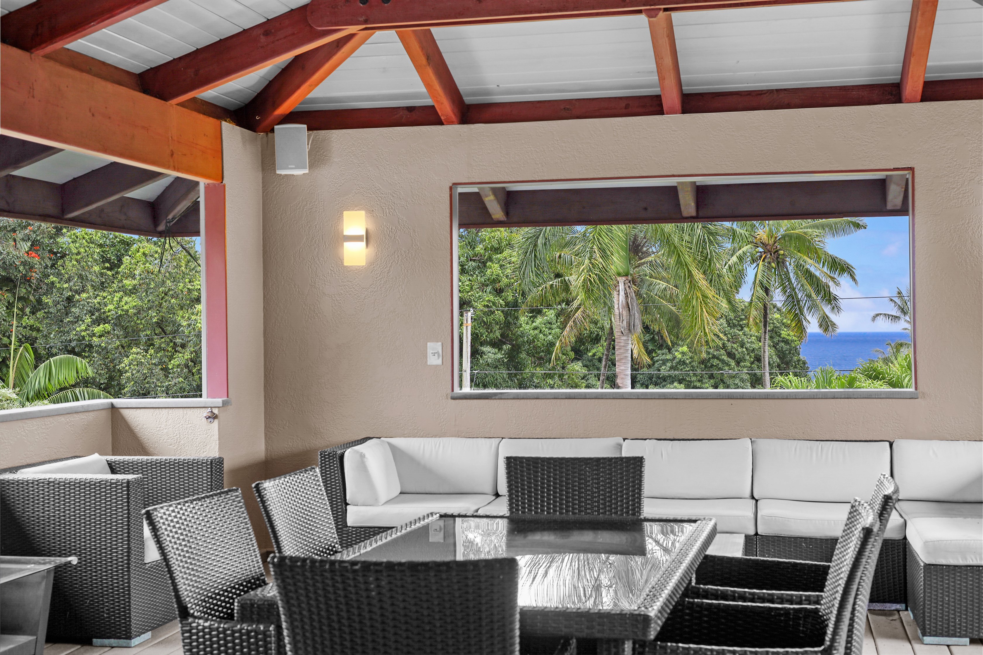 Custom Details and Amenities: • Natural stone flooring (black slate, quartzite, and granite) compliments solid granite countertops. • Stainless steel kitchen appliances with custom fixtures. • Hand-crafted cabinetry and built-in storage throughout • Luxurious master bath with walk-in shower and soaking tub • Built-in speakers in master bedroom, master bath, living room, dining room, and lanai. • On-demand hot water heating. • Tiki torch lighting on the exterior. • Front and back security cameras.