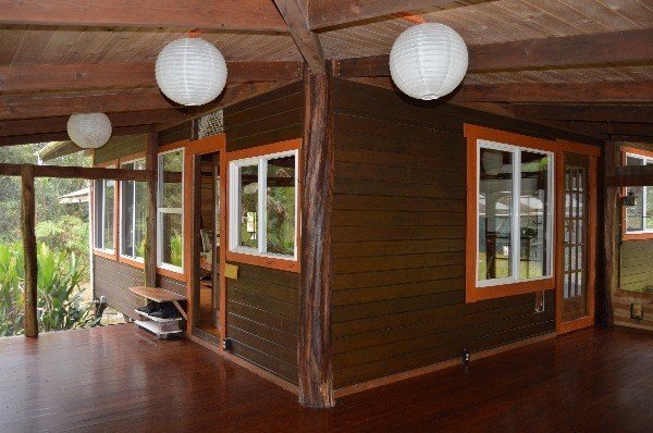 Back Up offers welcome! Gorgeous open plan, custom home with pine cathedral ceilings, wooden floors throughout, and a wrap around screened lanai. This house was designed by a long time home builder, ideal for anyone who appreciates high ceilings, a massive walk-in closet with an attached laundry room. It sits on a rarely available square lot in increment 1, with no CCR's, of upper Leilani Estates on Malama St. This property includes a residence that consists of approximately 1,350sqft of living area, 1 large bedroom with Monkey Pod and Redwood shelving, 1 bathroom with a 2 person corner Jacuzzi tub and copper shower heads. Nestled in the Hapuu ferns and Ohia forest sits an adorable 96sqft "writer's" cabin with hardwood floors and coconut windows. There's also a detached carport for easy covered parking. This single wall wooden home was artistically built using native hardwood Ohia Posts from the property throughout the lanai, living room, and carport. Slabs of Monkey Pod wood steps with an ili'ili stone landing welcome you into the covered, screened in, wrap around lanai designed for outside living and socializing. Every touch inside this home is fully custom with hand built pine cabinets, a wooden bar in the kitchen and a built in wooden desk with overhead storage. Many large double paned vinyl windows and 2 glass paned wooden doors open up to the covered lanai allowing plenty of natural light and cool trade wind breezes to come through. This is an unpermitted home that operates on overhead electricity, a propane stove, propane on demand water heater and a UV light filtration system with potable water throughout the house. There's a small greenhouse ready for your delicate produce and plenty of yard space for outdoor gardening. The home is tucked away behind a gated, private winding driveway and the grounds offer a variety of fruiting and ornamental trees including citrus, avocados, bananas, bamboo and more.
