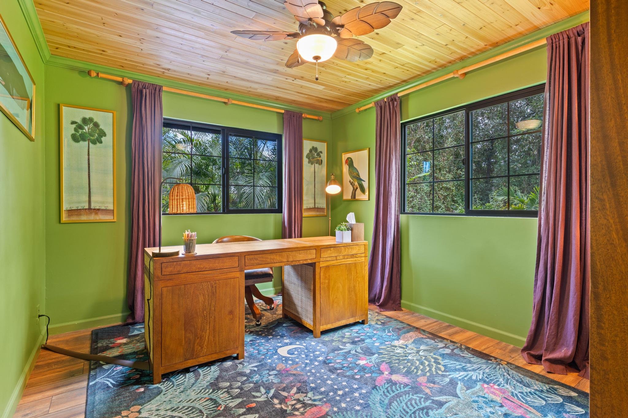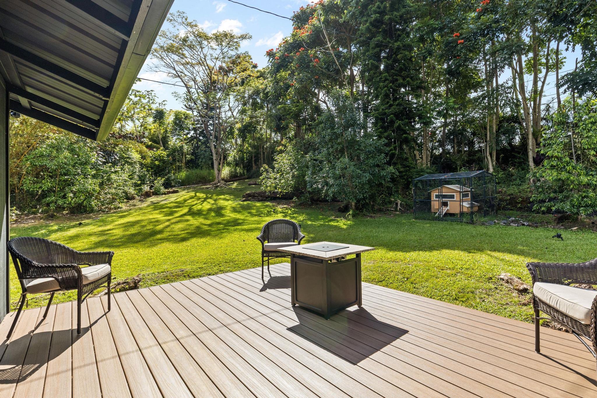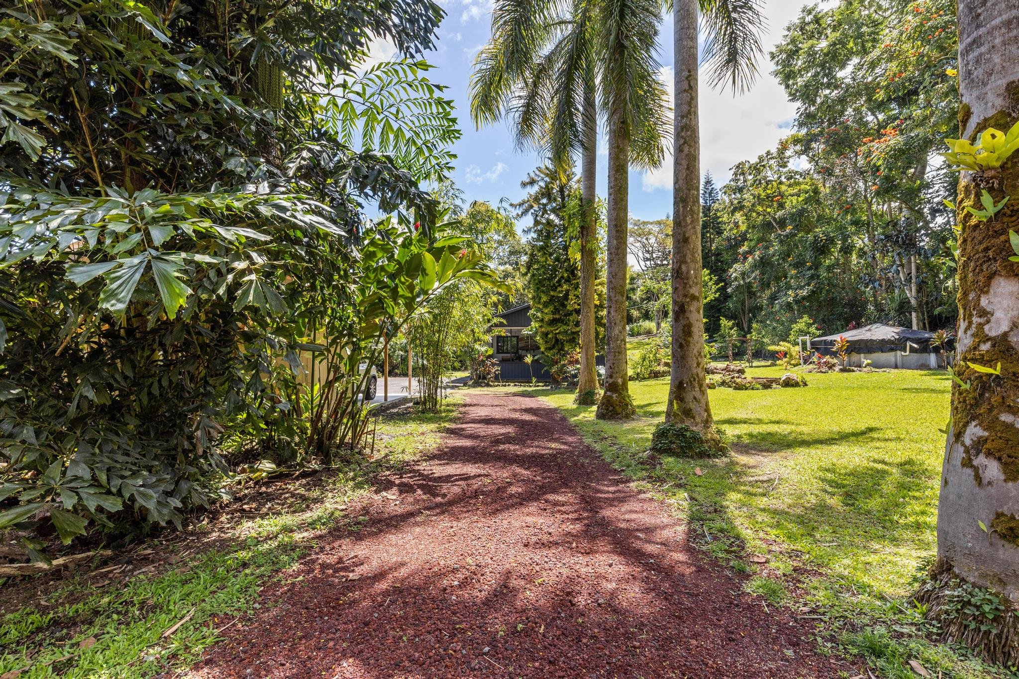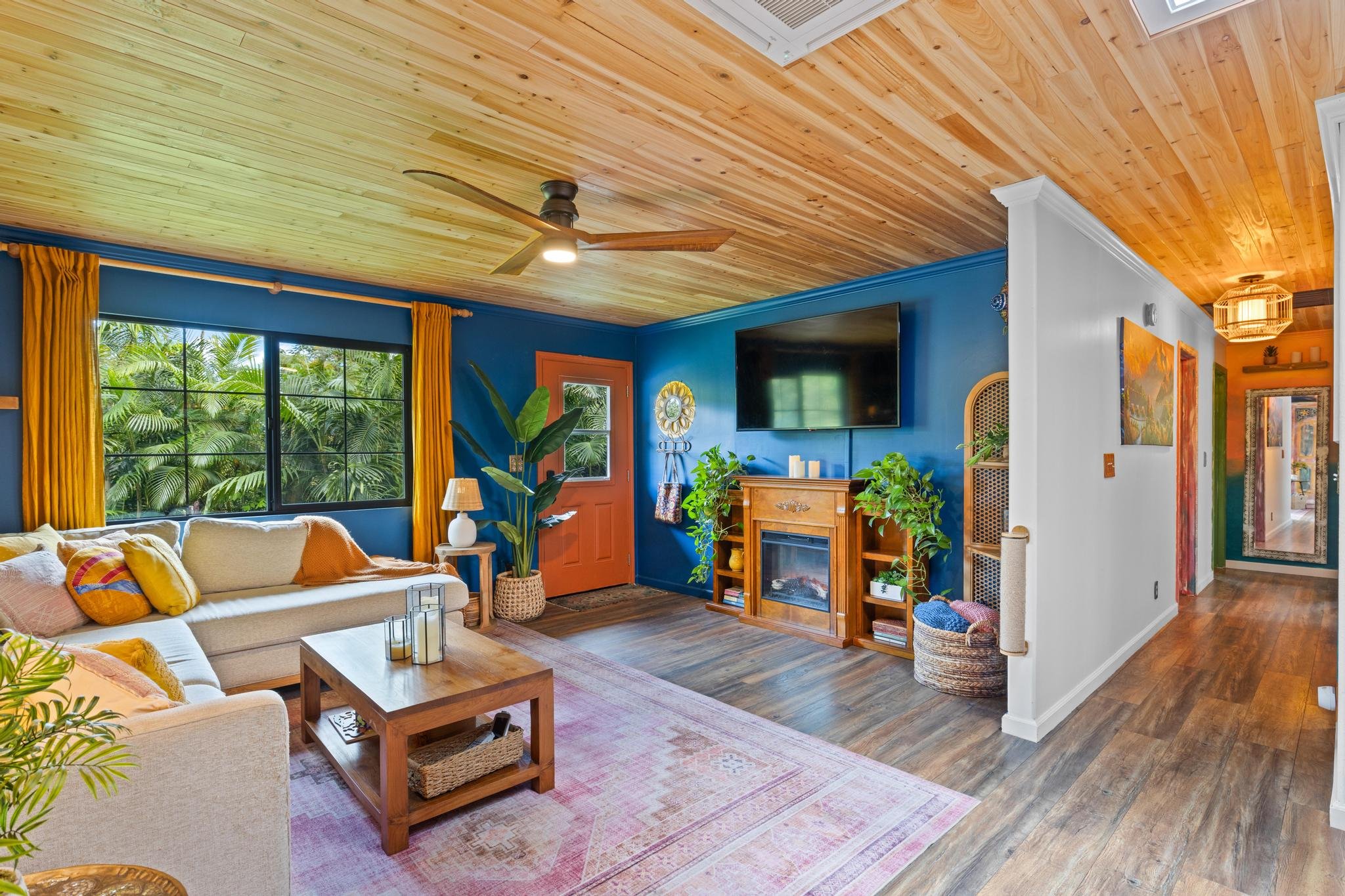 2021 Entire 1.3 Acres fenced and electric privacy gate installed; drain rock installed. 2022 New ROOF & Insulation 2022 New Whole house fan 2022 New Front door 2022 New Acacia Kitchen Countertops 2022 Wall mounted smart TVs 2023 Exterior house painted. 2023 New Washer/Dryer 2024 New $30,000 AIR CONDITIONING SYSTEM, Cassette A/C Ultra quiet & each room individually controlled. 2024 All New Appliances! Cafe Fridge, electric range/oven, microwave and dishwasher with gold handles. All new gold cabinet hardware too. 2024 New WATER system new pump, UV light and pressure tank. 2024 Leased SOLAR system Installed. 2024 All New Double Paned Insulated WINDOWS. 2024 New Cedar Ceiling 2024 New Crown Moldings 2024 Totally New BATHROOMS with new large soaking tubs and custom floor to ceiling tile surround, New Vanity, New floors. 2024 New Glass Closet Doors 2024 Backyard Deck 16' x 12.5' 2024 New 24' x 30' Carport and workshop plus a storage area of 24' x 9' for lawn mowers, ect. 2024 Electric Fireplace for heat or just romance. * With a full-price offer, Sold TURNKEY FULLY FURNISHED! *Landscaping: besides all the privacy plantings along all the boundary lines, many fruit trees including Breadfruit, navel orange, mulberry, Myers lemon and Eureka lemon, Tahitian Lime, Lychee, Rollinia, sour sop, 4 types of Avocado to bear fruit in different seasons, tangerine, blood orange, mountain apple, rambutan, cacao, dwarf apple banana, and other bananas! * Pie shaped lot feels much larger than the 1.3 acres. * Besides the Solar system with the Tesla Power Walls, there is regular grid power. * Paved roads and mail delivery!