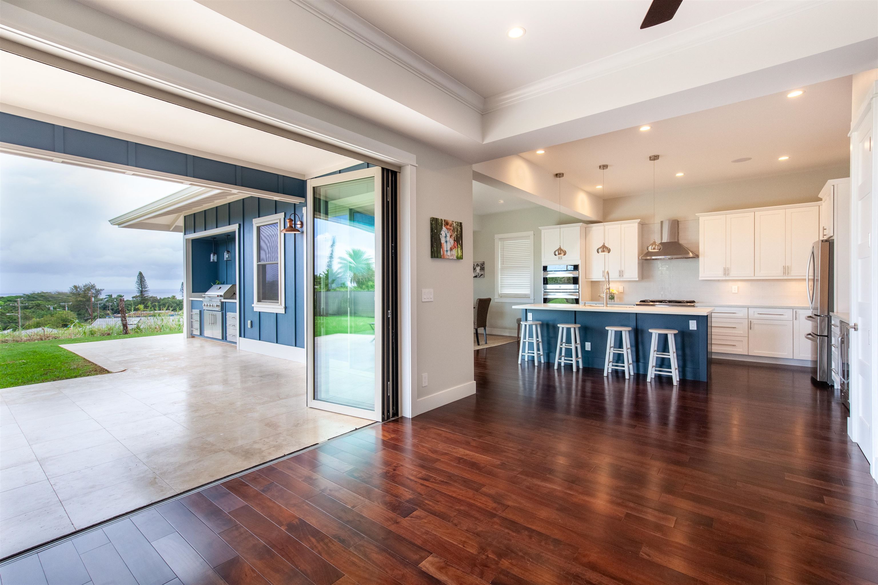 Location, Luxury, and Quality Construction with Ocean Views! This outstanding Haiku property features a main home, a detached 800 square foot workshop/ garage, and a separate 700 square foot cottage all built within the last 36 months. The main home has 3 bedrooms, 4 bathrooms, 2 living rooms and 2 huge bonus spaces (one upstairs and one downstairs) that would provide the owner with valuable flexibility and opportunities. Large downstairs bonus space currently being used as a gymnasium and home office. The main home boasts 10 foot ceilings on the first floor, 9 foot on the 2nd floor. Eight -foot doors, walnut stained acacia engineered hardwood, marble, and travertine flooring, quartz and marble countertops, shaker cabinets, stainless steel appliances, and custom made closets. Smart home automation for lighting, cameras, locks, 6 zone sound system, and split AC units. Large, open concept dining, kitchen, and living make this home perfect for entertaining. Accordion doors off the living area bring the indoor/ outdoor living to life. There is a separate living area on the second floor that opens up to a beautiful 310 sf lanai with breathtaking ocean views. The 2 bedroom/ 1 bath Ohana has ocean views, mature landscaping for privacy, a separate gated entrance and address, and a fenced in yard. The Ohana features vinyl wide plank flooring, shaker cabinets, quartz counters, and marble in the bathroom. The property is a short walk to either Haiku Town or Haiku School, less than a 5 minute drive to Hookipa Beach Park and close to Paia, Makawao, and the airport. This property has everything you could want and more! Showing by appointment only. Listor is owner.