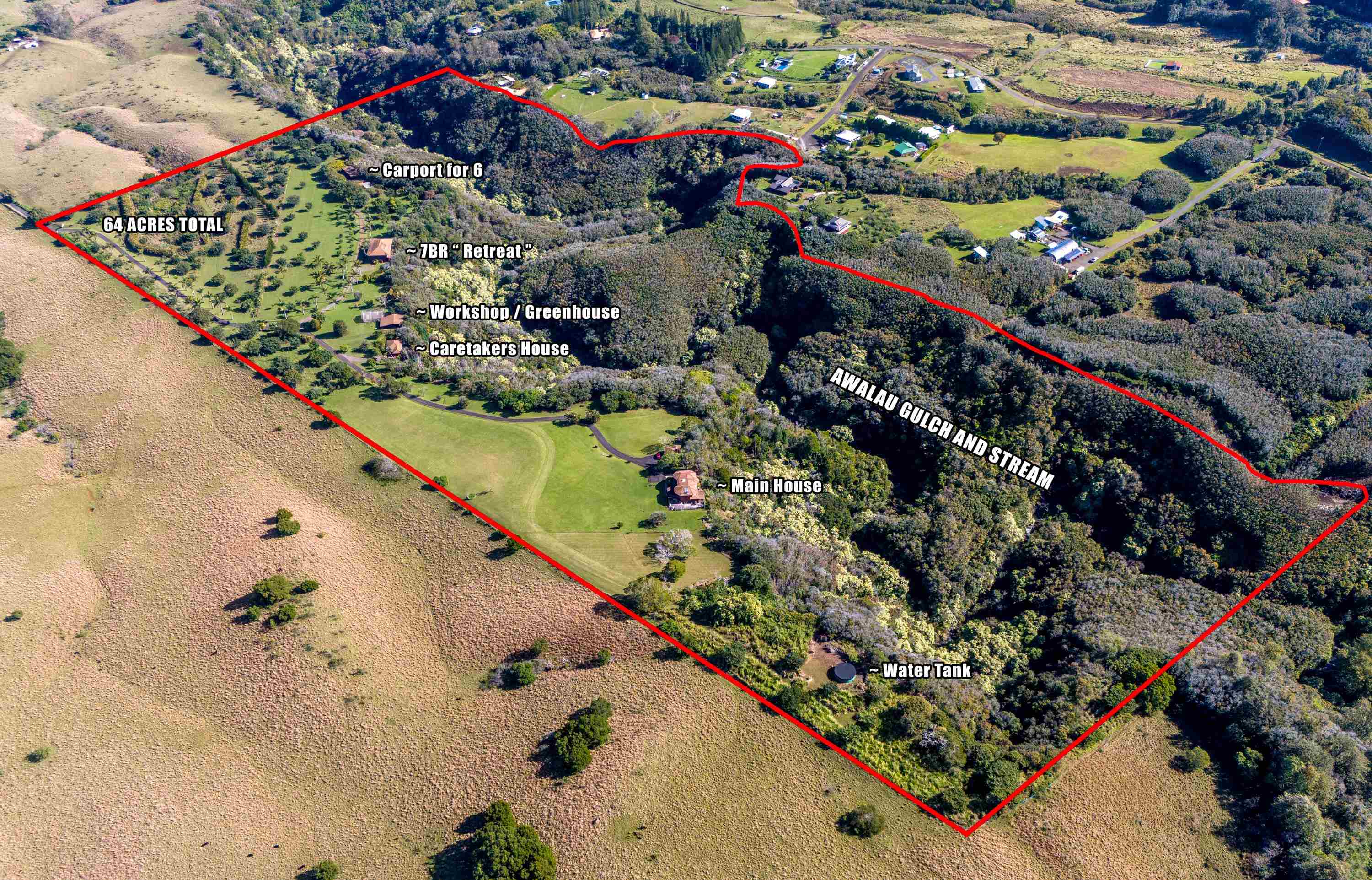 'Majestic' describes this 64 acre estate with stunning ocean, Haleakala, West Maui mountains, and Molokai views, featuring 2 large homes with 4 additional buildings including a 6 car carport, 2 car garage, farm building and workshop. The gated, private, paved 1 mile drive winds through open pastureland, giving you a true sense of 'Maui No Ka Oi' and being one with nature. You'll love strolling through numerous fruit orchards and gardens, or exploring the lush, tropical Awalau gulch, stream, and pools--all within this amazing property. During the day all you'll hear are the sounds from the stream, birds, and occasional cattle; at night, there are no lights other than from the moon, planets, and stars. Only your imagination will limit your enjoyment of this pastoral setting with a 4+ bedroom main home, 7+bedroom 'retreat', and other buildings, plus a glassed in view deck with 3 showers. Electricity is public; water is via a private line, pump and storage tank (a catchment system could also be easily added). Call your favorite agent to view this brilliant & rare legacy property; buyers must use due diligence to fully appreciate this offering.