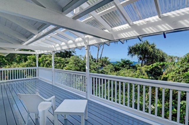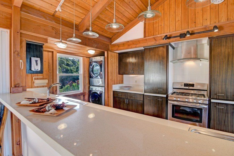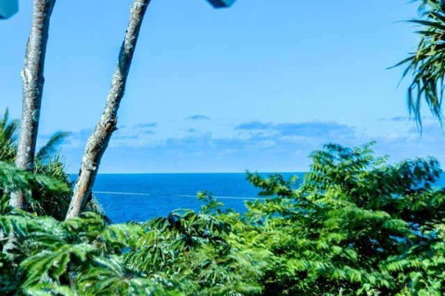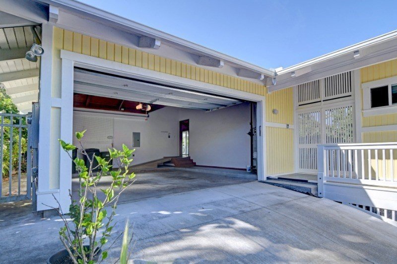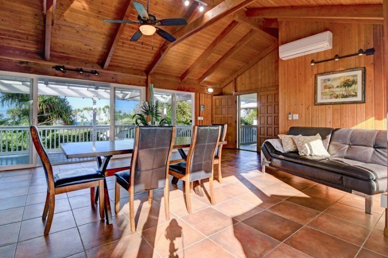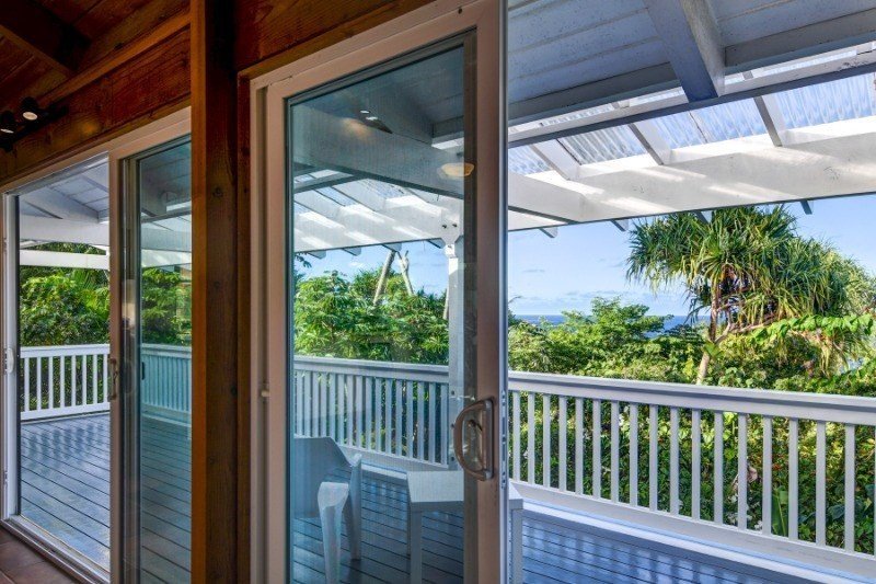 Custom designed by the owner architect, this Hawaiian Shores Rec home is being offered for the first time. The home is exquisitely sited on the lushly landscaped lot to maximize ocean views and sea breezes. The unique design utilizes the indigenous architecture of the Islands with vaulted ceilings, cross breezes and open covered spaces. Large covered lanai on the makai side of the house with ocean view/breeze and generous lanai seating on the mauka side of the home. Hand cast concrete tiles grace the walkway through the tropical vegetation on the path around the house. Handmade Italian porcelain tile flooring throughout the entire home for beauty and easy care. The living area opens to the kitchen with pull up seating to the long open counter space. Kitchen cabinets are mahogany with walnut stain. Double kitchen sinks with plenty of room for two cooks. Disposals for each sink. Generous cabinet storage and two unique slide out cabinets to house spices and provide easy access to the prep cook spaces. Stacked washer and dryer included and housed conveniently in the corner of the kitchen. Heavy timber construction was used to create vaults in every room and the construction quality is top of the line. Grade 316 stainless steel hardware was used along with rim shank nails to create a structural masterpiece by this talented architect. The home features two large master bedrooms and two full baths. The first bedroom is in the main structure with walk in closet with full built in features, a comfortable bath area and tiled shower. A covered breezeway connects the main structure to the second master bedroom, privately designed as a master sanctuary retreat, a guest bedroom or mother-in-law unit. Large corner windows for lovely ocean views from this bedroom. The ensuite bath and walk in closet closet complete this retreat. Attached oversize two car garage and a third parking area on the street level below. 35 PV panels are fully owned and net metered to HELCO.