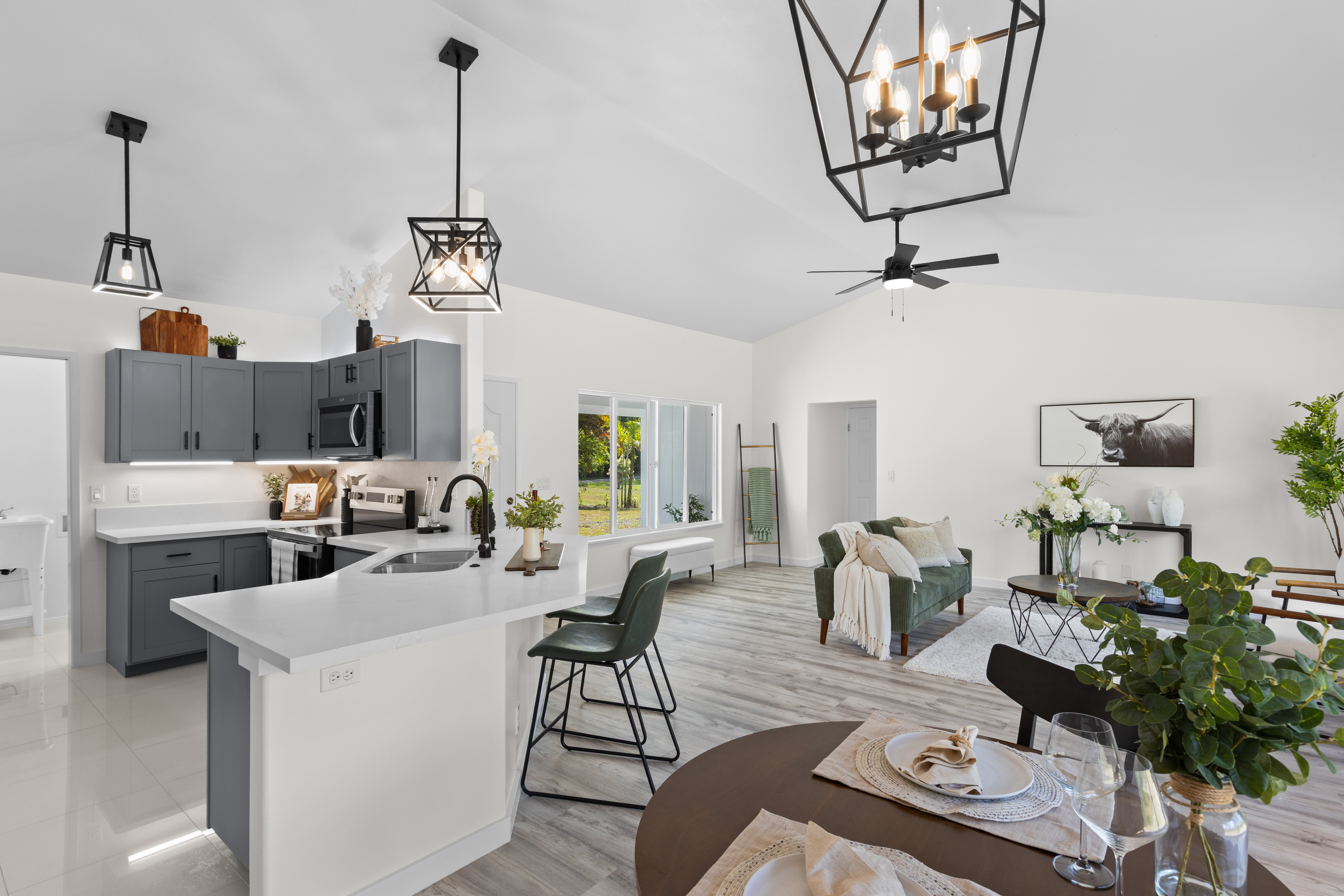 Step inside to an open-concept living space filled with natural light and vaulted ceilings, enhanced by custom hardware and multi-function lighting fixtures that allow you to set the mood for any occasion. The heart of the home is the beautifully renovated kitchen, featuring sleek solid surface counters, striking grey custom-built cabinetry, stainless steel appliances, and unique glassy white tiles that continue seamlessly into the bathrooms for a cohesive, modern design.