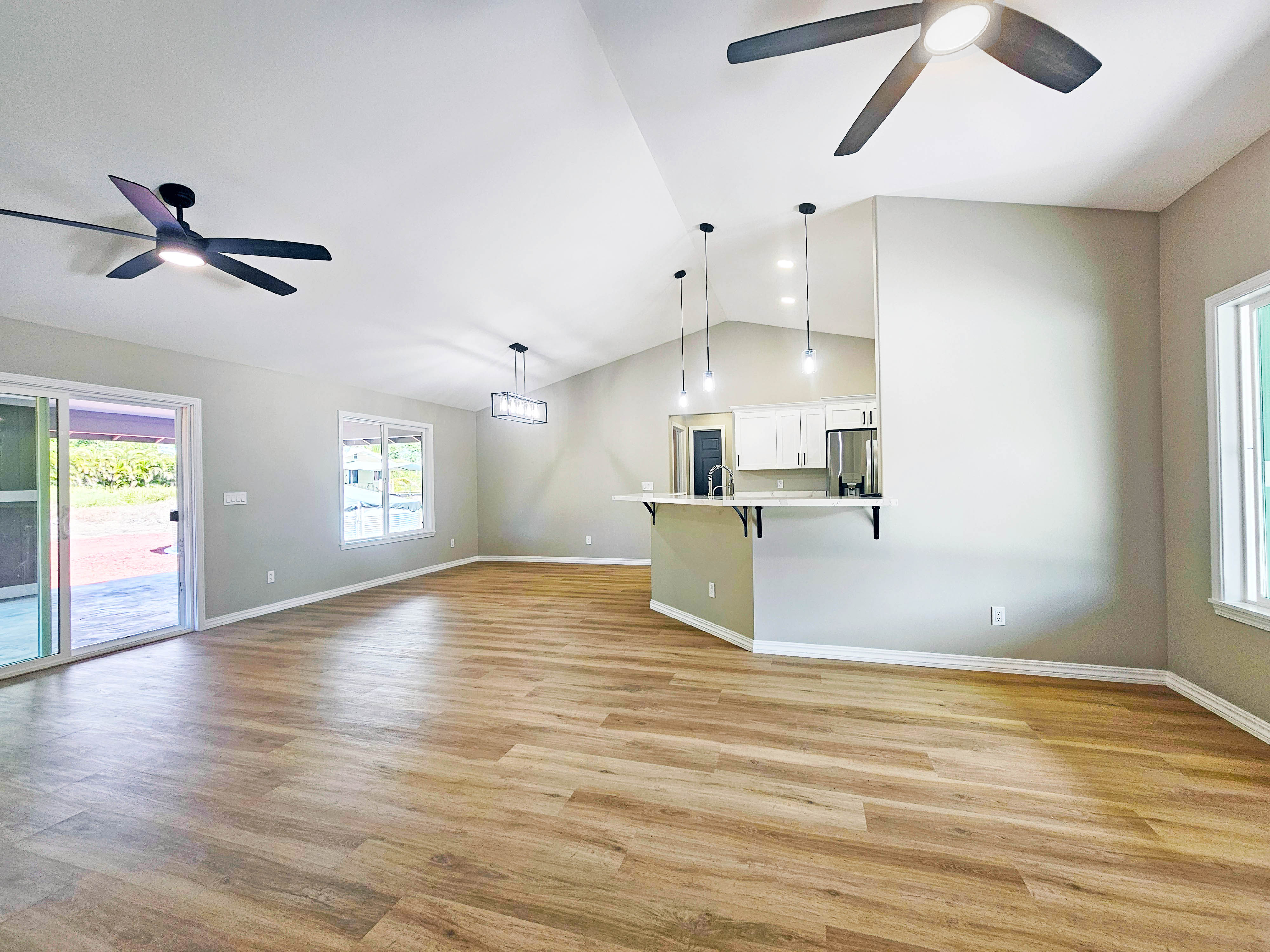 Sleek and modern feel with this 3 bedroom / 2 bath, brand-new home just one lot away from Paradise Drive. Living areas have vaulted ceilings to open up the space with kitchen that is fitted with new LG appliances. Master suite has it's own side of the house with large walk-in closet, double-sink vanity, and a floor-to-wall tiles shower. Spacious living areas and waterproof, premium vinyl flooring is great for easy maintenance. Bedrooms are located on the other side of the home with a hallway bath. Large back lanai opens up views to the backyard area where you can create your own vegetable garden or landscape to your heart's desire on the blank canvas that awaits! Spacious garage area with room for storage. Solar water heater to save on energy and there's a UV water filtration system for the entire home.Hawaiian Paradise Park is located in the lower Puna district and is about a 10-15 minute drive to Keaau town where you can find shopping, hardware, restaurants, pharmacy, fast food, schools, offices, post office, etc. There's an active association and road maintenance fees are currently $435/year. There's more closer options for your last-minute needs in the Orchid Land center area.