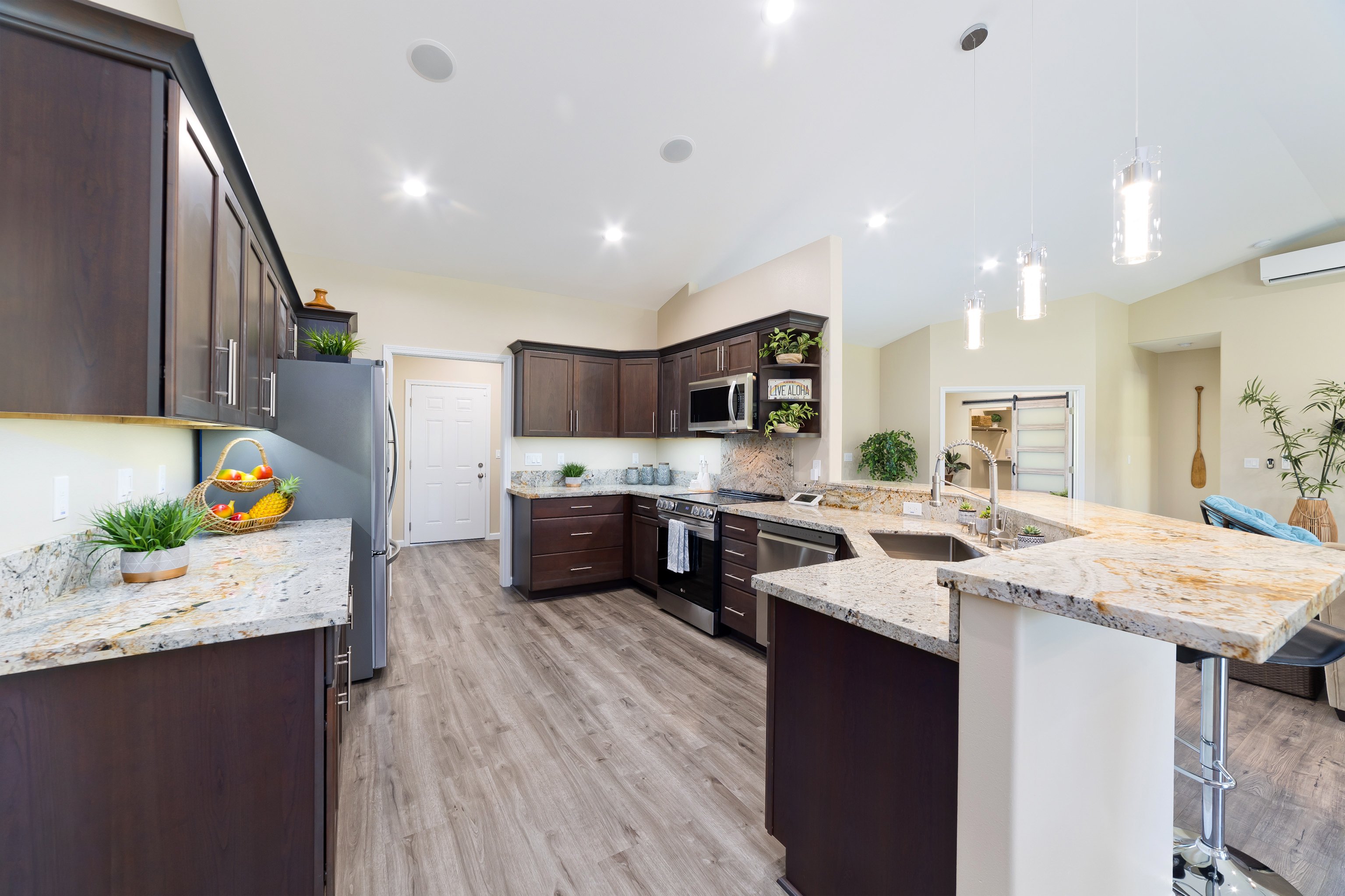 Enjoy true island living with all the modern necessities conveniently located minutes from dining and shopping in Hilo or Pahoa. Own your piece of paradise with this custom-designed, split-floor plan featuring 2,760 square feet of spacious indoor-outdoor living that seamlessly flows. This 4-bedroom, 2-bathroom home boasts impressive amenities, including 9-foot walls throughout, 2 split AC units, a generous 576 square foot garage, solar hot water, a security system, and a built-in sound system.The home is fully insulated for comfort and efficiency, and the primary bathroom offers a luxurious walk-in tiled shower. A covered walkway connects the primary suite to the back lanai, perfect for enjoying the outdoor space. Exterior concrete lanais and walkways are finished with durable epoxy paint. For reliable water, the property includes a Grundfos on-demand water pump, a large dual filtration system, and a UV light.The entire 1-acre property is fully cleared, fenced, and gated, providing privacy and security. Beautifully landscaped privacy hedges surround the entire acre, creating a serene and secluded oasis.Check out the video at https://player.vimeo.com/video/1112462279