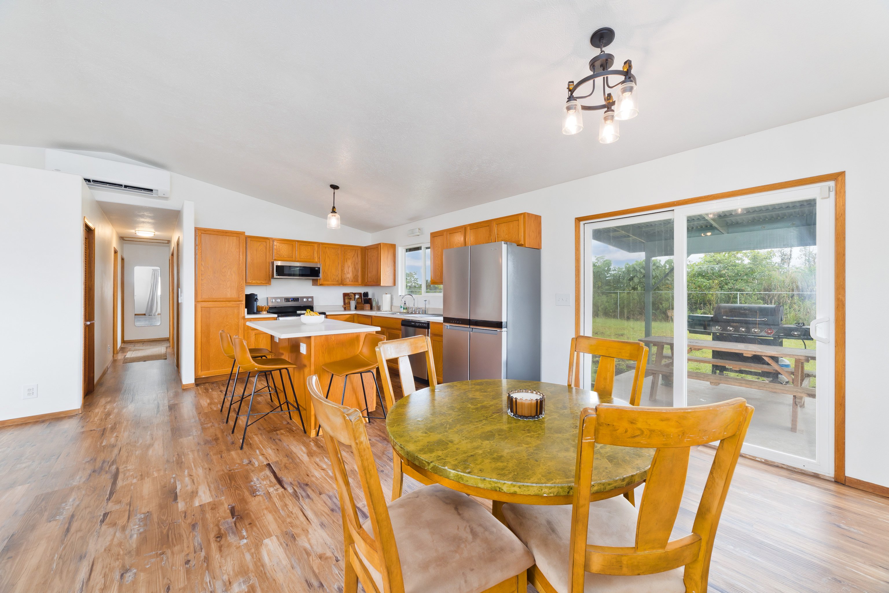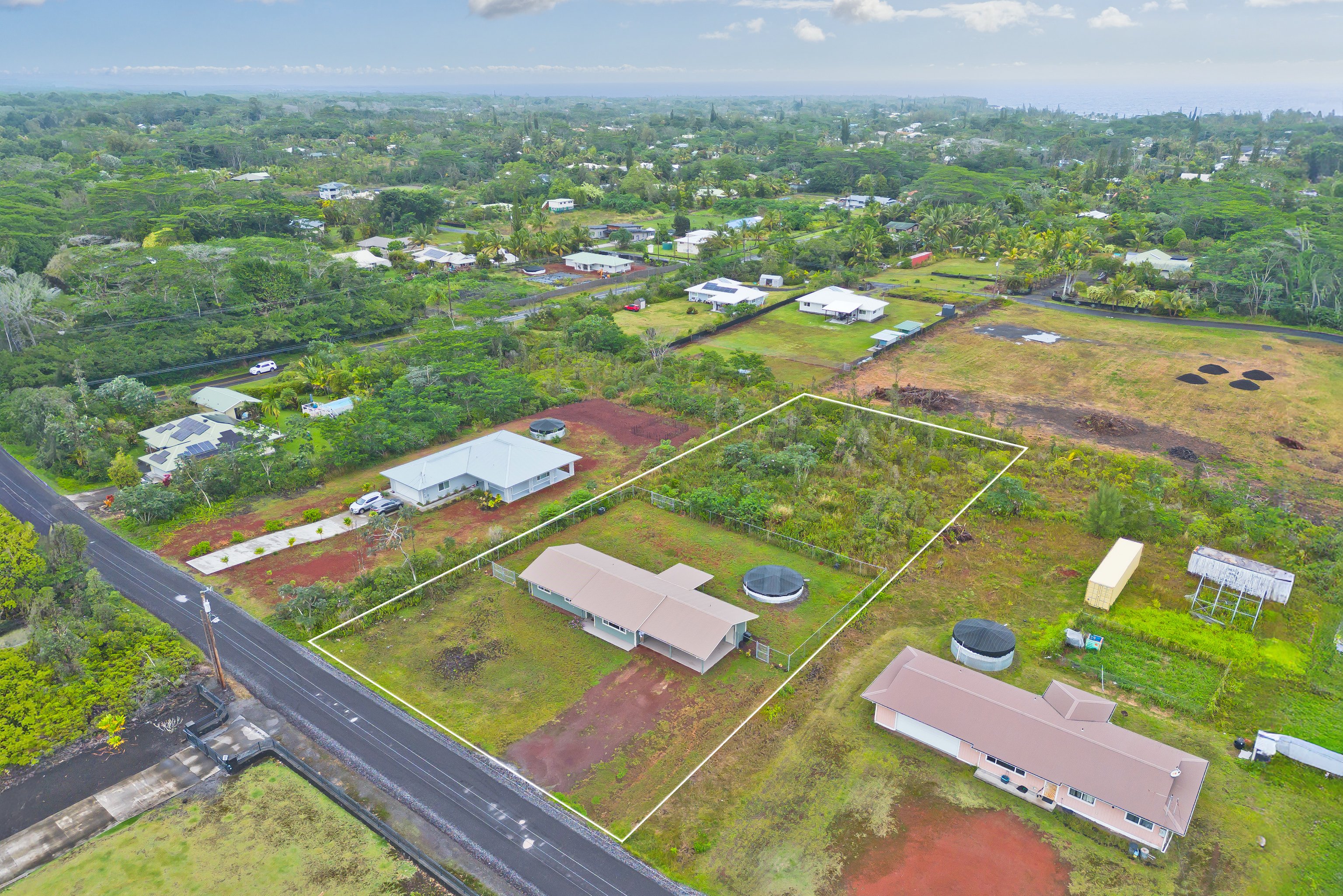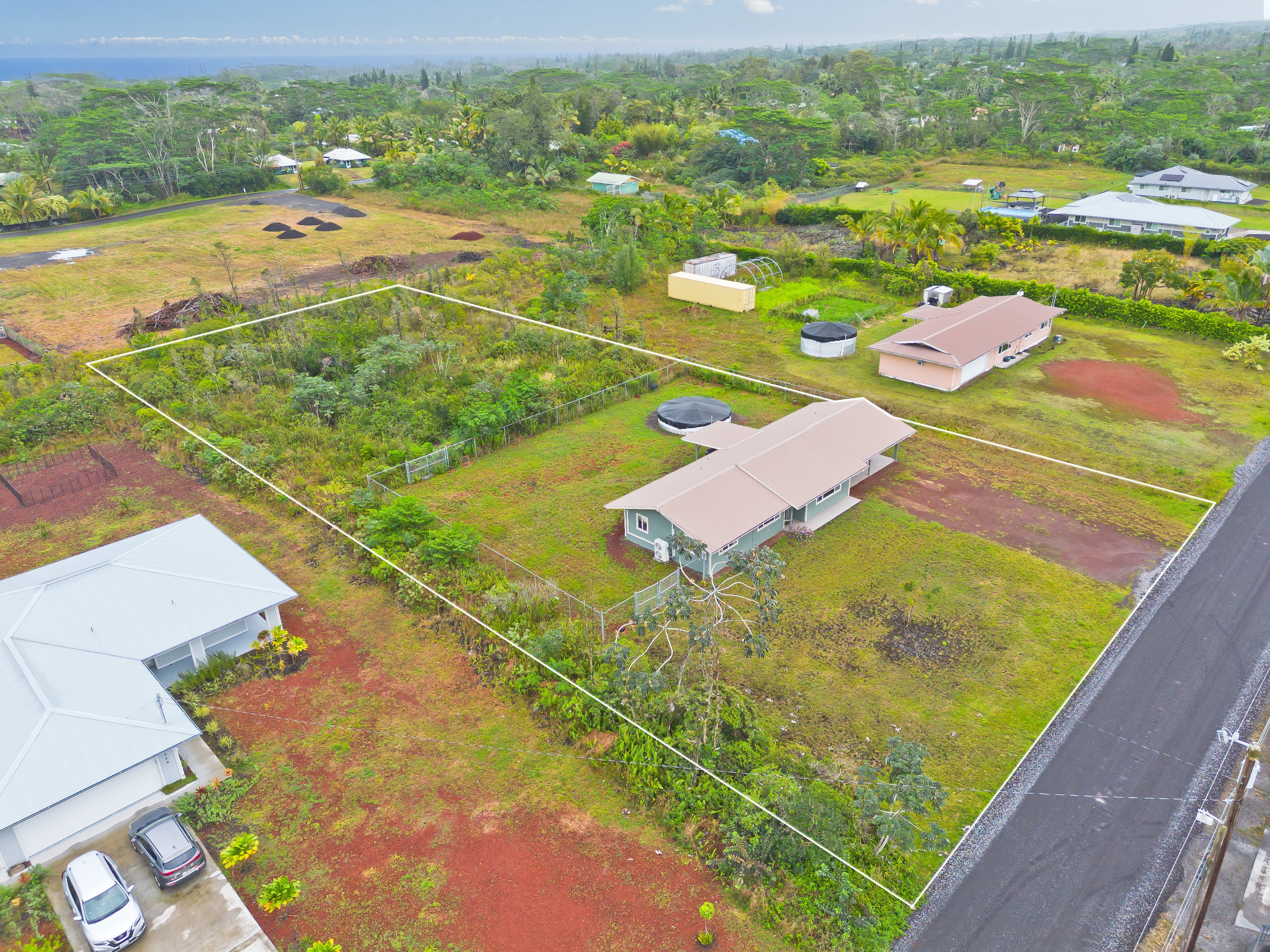 Welcome home to this beautifully maintained 3-bedroom, 3-bath residence on 8th Avenue in the desirable Hawaiian Paradise Park subdivision. This home offers comfort, convenience, and the true essence of island living — move-in ready and thoughtfully updated throughout.Step inside to find upgraded flooring and a bright, open layout designed for entertaining. Split AC units in the main living areas and bedrooms keep the interior cool year-round, while a freshly painted exterior lends a modern touch that blends perfectly with the tropical surroundings.Outside, you’ll appreciate the previously cleared acre and fully fenced area in the back-yard, ready for you to create your dream garden or even build an Accessory Dwelling Unit (ADU) if you choose. Stakes are visible, and there are no large trees to worry about — offering both safety and flexibility for future expansion. The laundry area and additional bath are conveniently located just off the carport, perfect for easy cleanup after yard work or island adventures.Recent updates include a new catchment liner and cover plus a freshly coated roof for added peace of mind. Nestled among other well-maintained homes and located just off the pavement near Paradise Drive, this property provides an ideal blend of privacy and community.This HPP gem is truly a must-see — beautifully updated, perfectly maintained, and ready for your next island chapter.
