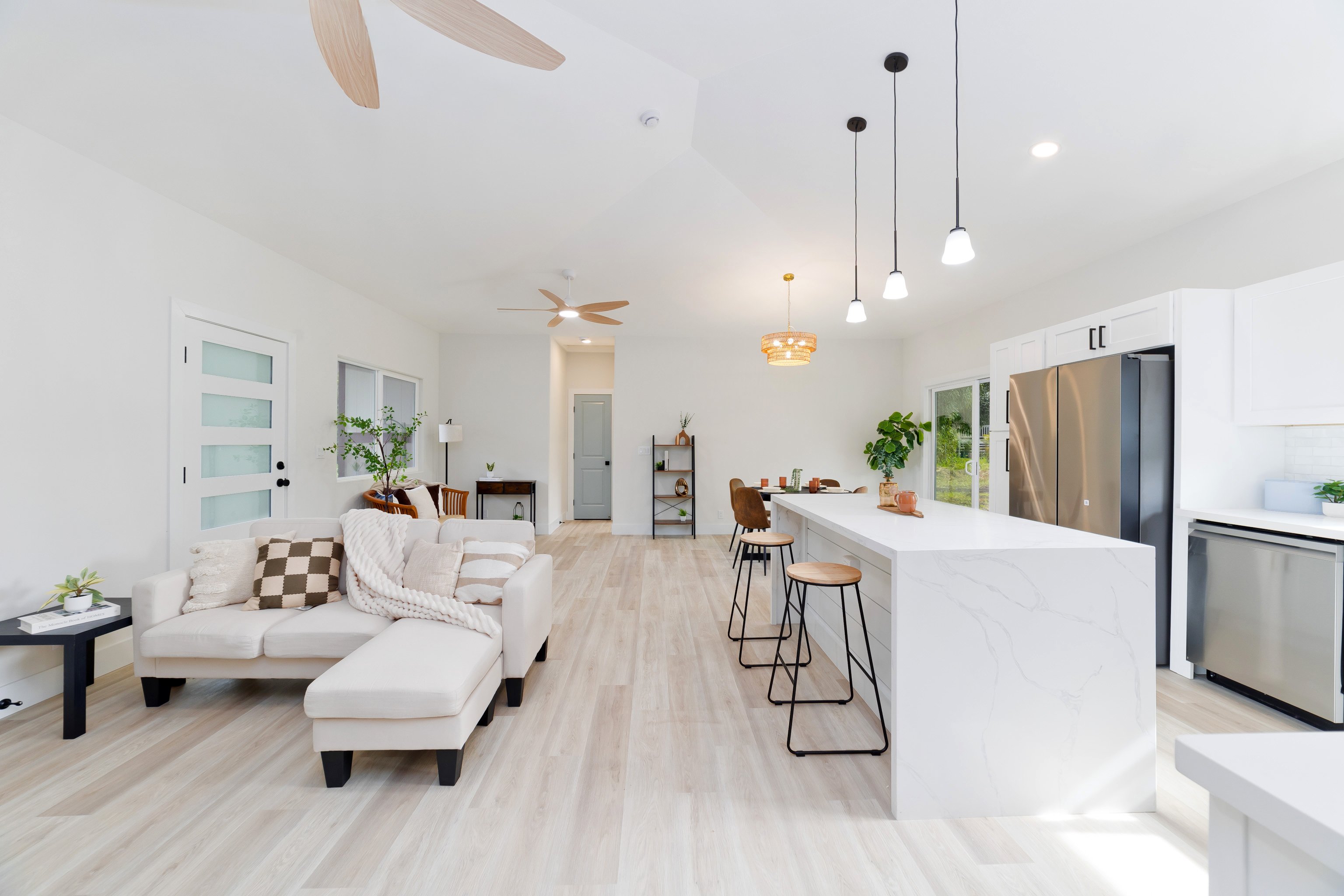 Newly Built 3-Bedroom Home on 1 Acre in Hawaiian Paradise Park Welcome to your brand-new home in the heart of Hawaiian Paradise Park! This beautifully crafted 3-bedroom, 2-bathroom residence offers modern comfort, thoughtful design, and high-end finishes—all nestled on a spacious one-acre lot. Step inside to discover an open-concept layout featuring sleek quartz countertops, modern fixtures, and stainless steel kitchen appliances that make entertaining a breeze. The kitchen flows seamlessly into the living and dining areas, creating a light-filled space perfect for gatherings and everyday living. The primary suite is a true retreat, complete with a generous walk-in closet, a luxurious split vanity, and a large glass door shower that exudes spa-like elegance. Additional features include: Washer and dryer for ultimate convenience Garage door opener for secure, easy access Contemporary lighting and hardware throughout 4 year extended warranty available Expansive one-acre property offering privacy, space to garden, and potential for future improvements Located just a short drive from Hilo, beaches, and local amenities, this home combines the tranquility of island living with the convenience of modern construction. Don’t miss your opportunity to own a piece of paradise