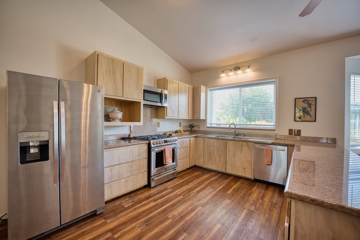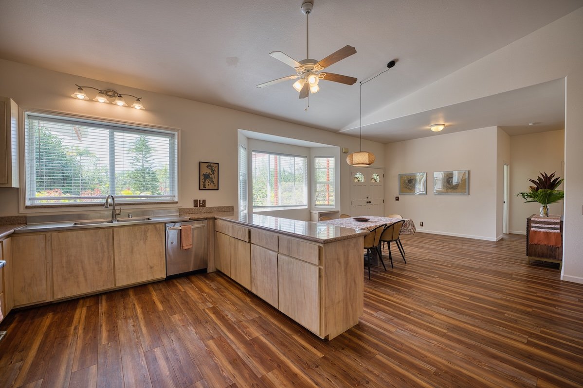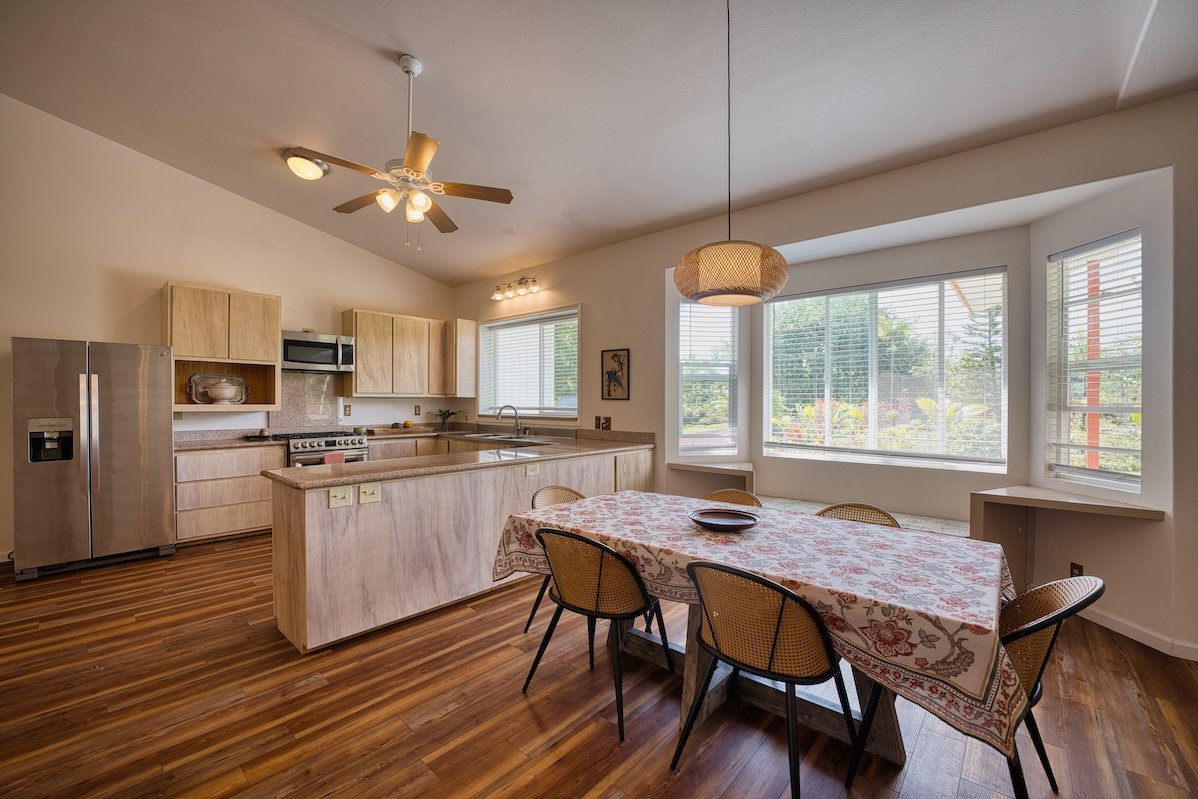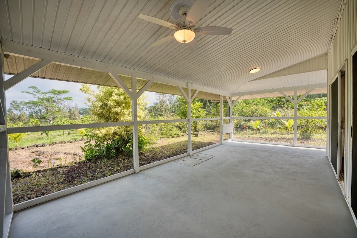 Welcome to your island sanctuary on 2nd Avenue, just moments from the ocean in Hawaiian Paradise Park. This thoughtfully designed 3-bedroom, 3-bath home offers flexibility, comfort, and tropical charm throughout. Step inside to find soaring vaulted ceilings and an open, airy living space that flows seamlessly to the expansive screened-in back lanai — perfect for indoor-outdoor living and entertaining. The deck of the screened in lanai is actually the cement catchment tanks for the house. A practical, functional and aesthetically appealing way to conceal the catchment tank. This innovative catchment system built under the concrete lanai helps maximize space and efficiency. The home features two primary suites, one upstairs and one downstairs, providing privacy and options for multi-generational living or guest accommodations. The home’s durable vinyl siding ensures low maintenance, while the indoor laundry room has tons of space, and storage potential. The home has easy access to the back of the property where you will discover a detached accessory building currently used as a tranquil massage and acupuncture studio. Inspired by Balinese design, it offers endless potential — ideal as a home office, creative space, or guest retreat surrounded by lush tropical landscaping. The extensive landscaping features many ornamentals and fruit trees including: Mango, Breadfruit, Longan, Lemon, Lime, Tangerine, Coconut, Soursop, Ice Cream Bean, Papaya, Avocado, Banana, etc.