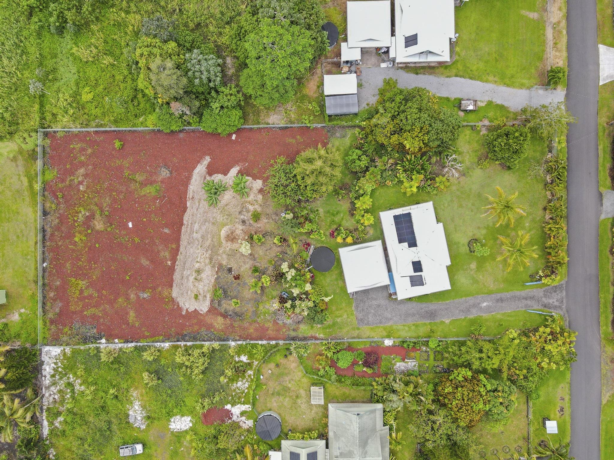 Welcome to your tropical oasis! This charming and spacious four-bedroom, three-bathroom home is nestled on a sunny acre in the desirable Hawaiian Paradise Park. This unique home features soaring 20-foot ceilings, with two generously-sized bedrooms on the main level and two more upstairs, each with vaulted ceilings. Recent upgrades include: • Fully owned photovoltaic (solar) system with battery back up • A stunning new kitchen, featuring quartz countertops, custom Alderwood cabinetry, and updated stainless appliances • A new water catchment tank, new pressure tank, and drinkable water with the Quantum Disinfection system • Split AC units in both downstairs bedrooms • Updated bathroom vanities • Recently painted exterior and interior of the home • A detached two-car garage with additional space for storage/workshop • 5-foot chain link fencing around the entire acre, complete with an automatic front gateThe fully fenced property boasts a lush lawn, beautifully landscaped with mature papayas, lime, pineapples, tangerines, bananas, coconuts, and vibrant tropical flowers. There’s even room to plant more fruit trees in the backyard for a true garden-to-table experience.Additional highlights include tiled floors downstairs, covered front lanai, solar hot water, outdoor shower, fiber optic high-speed internet, located on a paved road and can be sold furnished.Come and experience the perfect blend of island living and modern conveniences in your new home!