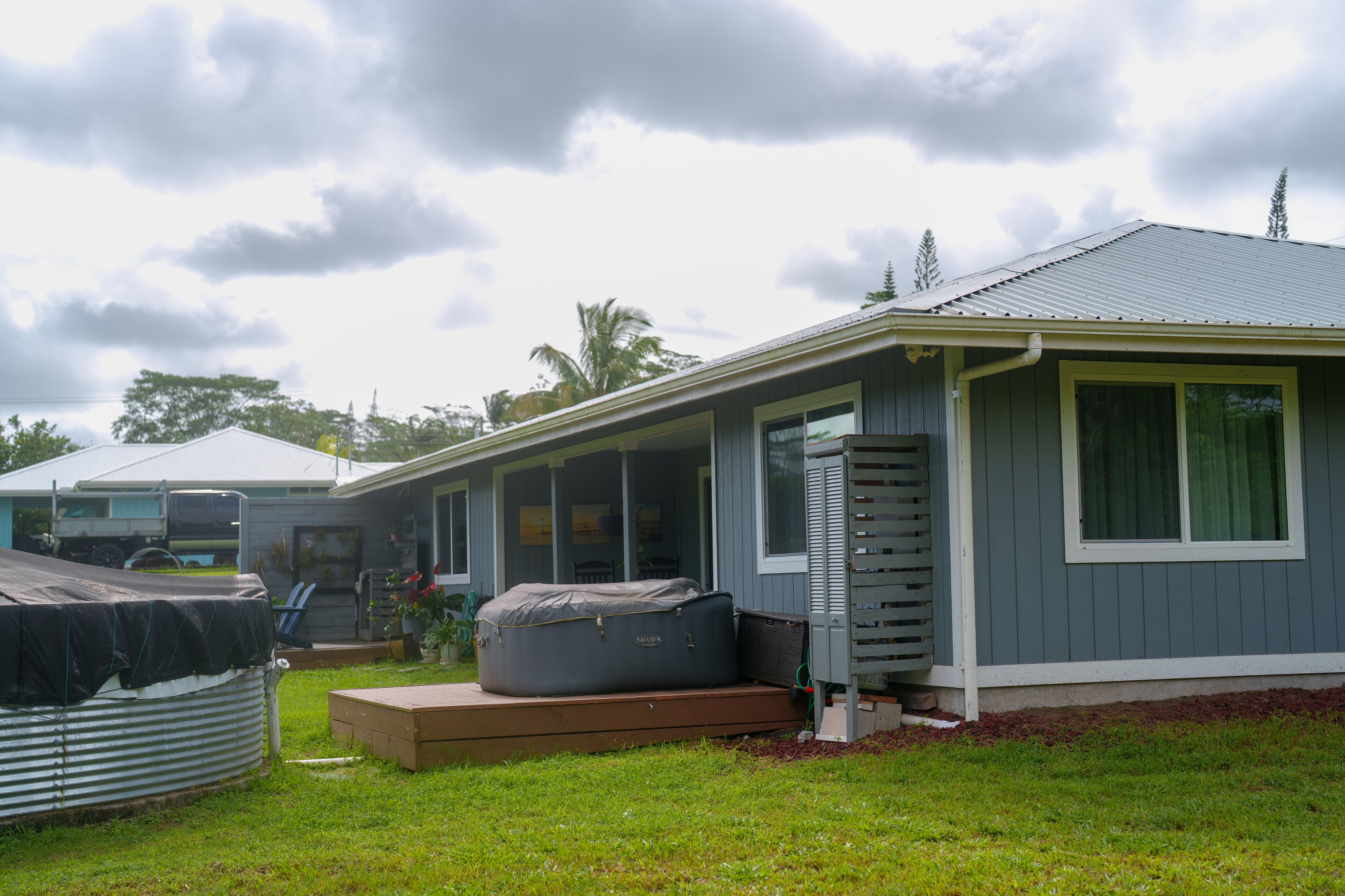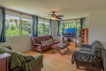 Welcome to this stunning 3 bedroom, 2 bath home just under three years young, nestled on a grassy lush 1 acre parcel in desirable Hawaiian Paradise Park just a few houses off Makuu Drive towards the top of the subdivision. This thoughtfully designed property offers great light, convenience and charm all in one. The home features a smart split floor plan with the spacious primary suite on one side complete with a spacious walk in closet and a bathroom with lovely tiled finishes and your own personal bidet. Two bedrooms are situated ons the opposite wing along with the second well appointed bathroom in between the two bedrooms with a tub and tiled shower combo. Outside enjoy a grassy yard, two relaxing decks, one with a propane heated small hot tub and plenty of parking. A roomy approx. 8x10 storage building provides extra space to store your outdoor equipment and toys. The owner thoughtfully constructed a chicken coop complete with self contained water stations for chickens to use. Behind the home you will find a banana grove and a handcrafted whale tail feature that adds a unique artistic touch to the landscape. Recent updates include a new garage door and regular pest treatment for peace of mind. This property offer flexibility for future expansion, guest quarters or creative projects.