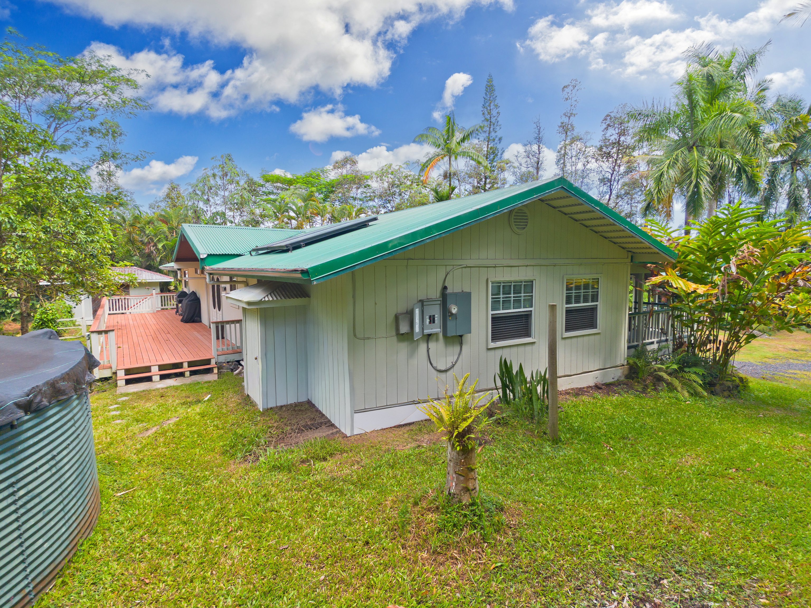 Welcome to Your Island Oasis in Hawaiian Paradise Park on a lush, one acre lot , this spacious 4-bedroom, 2-bathroom home offers the perfect blend of comfort, island living, and privacy. Surrounded by mature fruit trees—including avocado, mango, orange, and more you'll enjoy the beauty and bounty of your own tropical paradise right outside your door. Enjoy the soaring tongue-and-groove ceilings and an expansive living and dining area that provides plenty of room for gatherings, relaxation, and everyday living. The large primary bedroom features a generous walk-in closet, while a second suite includes its own private bathroom—ideal for guests or flexible living arrangements. Two additional bedrooms offer ample space for a home office, hobbies, or sleeping quarters. Outdoor living is a breeze with a spacious front lanai, a large back lanai perfect for entertaining, and a covered lanai currently being used as a home gym. There's also a detached storage shed and convenient under-home storage for all your tools, gear, and more.