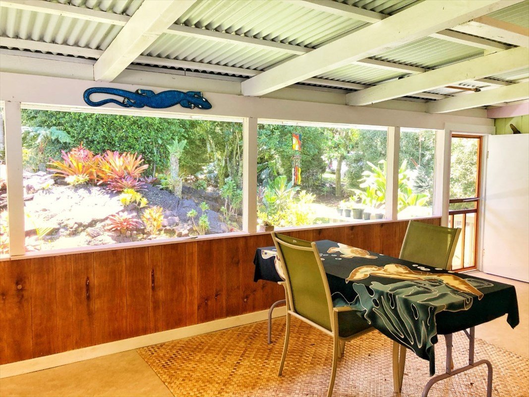 Must see! This tropical retreat is the gem you've been looking for! The property is absolutely ideal for those who appreciate a meticulously maintained garden, and a beautifully furnished, turnkey home with Teak and Bamboo island-style decor. This property is fully fenced with bamboo privacy hedges, a natural Pahoehoe lava kipuka with a relaxing water fountain, colorful plants and flowers, towering exotic palms, a few fruit trees and open grassy areas. So much color, texture, sounds and smells to stimulate the peace within you! You just can't put a price on all this sweat equity but for just $225,000 this home and property could be yours! The large screened-in lanai is perched just a few steps off of the ground to to capture trade wind breezes and views of the beauty in the back yard. The home boasts 3 bedrooms and 2 bathrooms with large windows and bamboo blinds, there's an interior washer/dryer, new vinyl wood-look flooring in the living room and bedrooms, solid granite countertops in the kitchen and bathrooms, all major appliances (the fridge is only 1 yr young and washer is 2 yrs), a 2 car-carport with multiple exterior storage areas, a security camera system that links to your phone/computer and so much more! Not only is this home fully equipped with everything you need to move right in, it also has the convenience of piped water, mail delivery service, high speed cable and internet service through Spectrum, overhead electricity, and the recreational park nearby with a pool, party area, playground, tennis, soccer, horseshoes and more! The location of this home is just a few minutes drive up to the growing and bustling Pahoa town that offers all of your essential amenities, and a 30 minute drive to the city of Hilo where our airport and University is located. A few minutes down the road from this property brings you to county oceanfront parks where you can enjoy the sights, smells and sounds of the ocean!