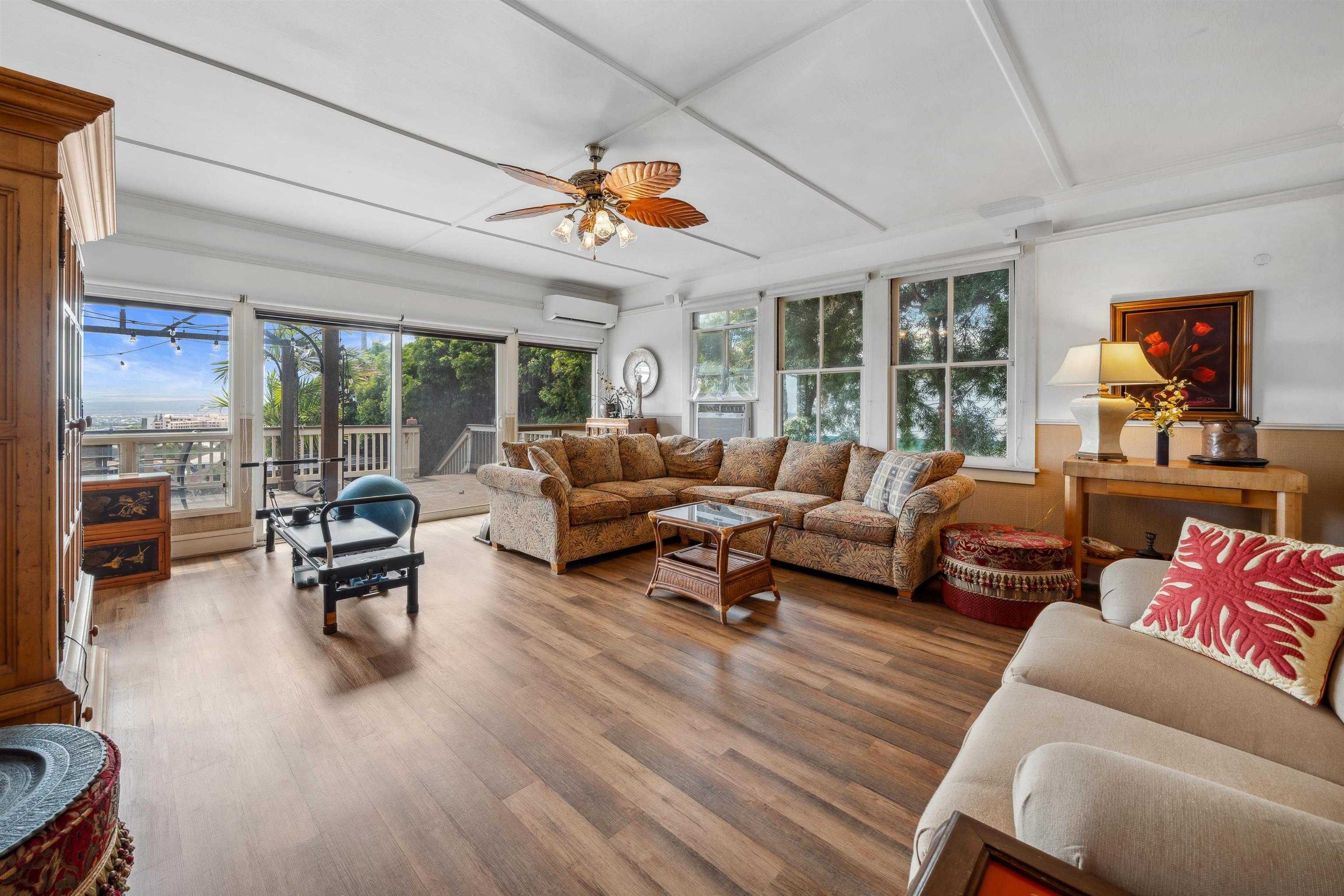Charming “Plantation Style” home situated on a fully landscaped ½ acre lot with views galore! The current R-3 zoning offers potential. The property has a Photovoltaic system consisting of 55 panels and is owner owned. You will appreciate the ocean, mountain and harbor views. The open living room leads out onto the upstairs patio and the stairway takes you down to the 1st story family room, kitchenette and enclosed patio. The kitchen is bright with white cabinets and Quartz counter tops with 2 sinks. Other Features include: glass door knobs, crown molding, wood hung windows, and Split AC units built in cabinets with glass doors & a cozy breakfast nook and a comfortable dining room. The seller will be leaving some furniture items. The seller had the house tented for termites and the warranty will be provided to the buyer at closing. There’s a Koi fish pond that is no longer being used. But, materials are there if you’d like to raise Koi again. This wonderful property is conveniently located in Wailuku near schools, churches, hospital, restaurants, shopping, and the MACC. Property is being sold in As-Is condition to qualified buyers. Two days notice to show.Thanks!