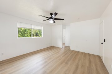 Inside, the home has been completely updated from top to bottom. Elegant wood plank porcelain flooring runs throughout, complementing the brand-new kitchen which features premium quartz countertops, updated soft-close cabinets with pull-outs for easy storage, modern fixtures, stainless steel appliances, and a charming coffee nook. An added feature is a split AC unit that runs on solar panels that are fully.owned.