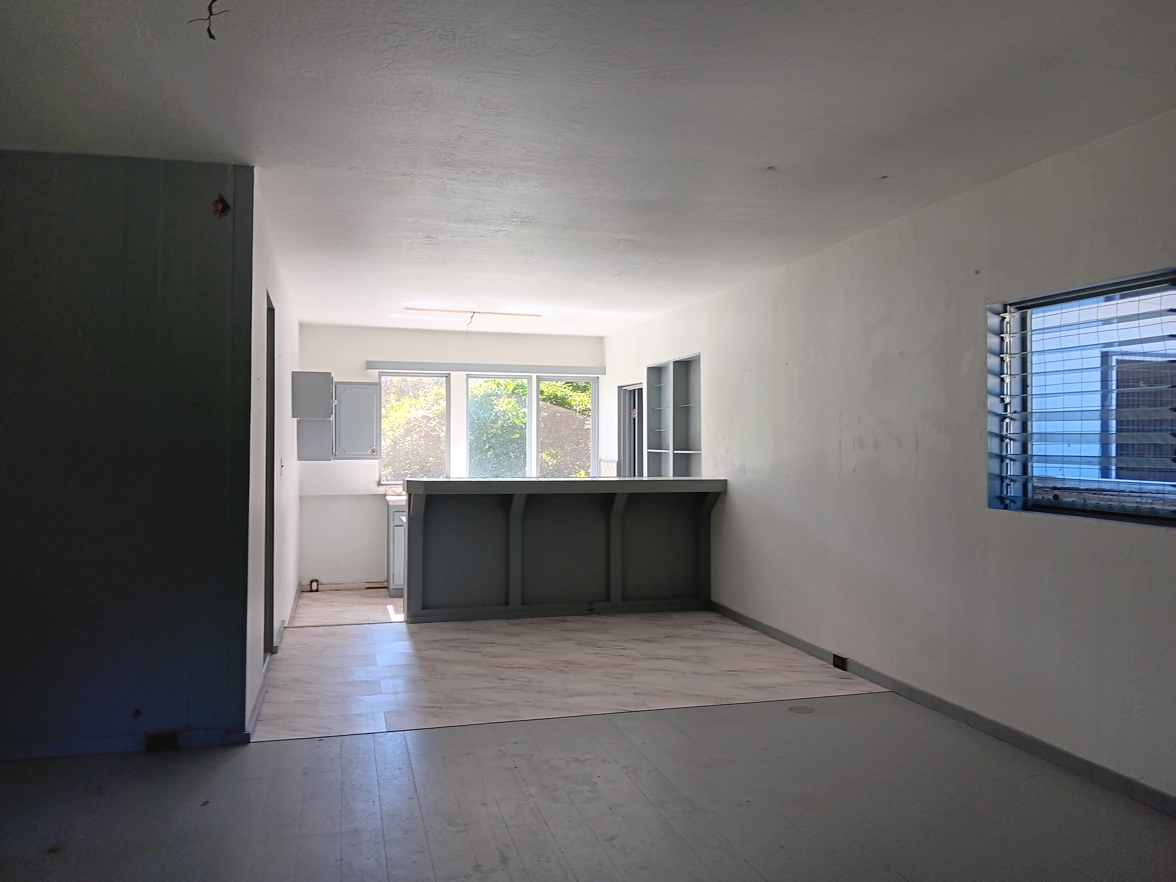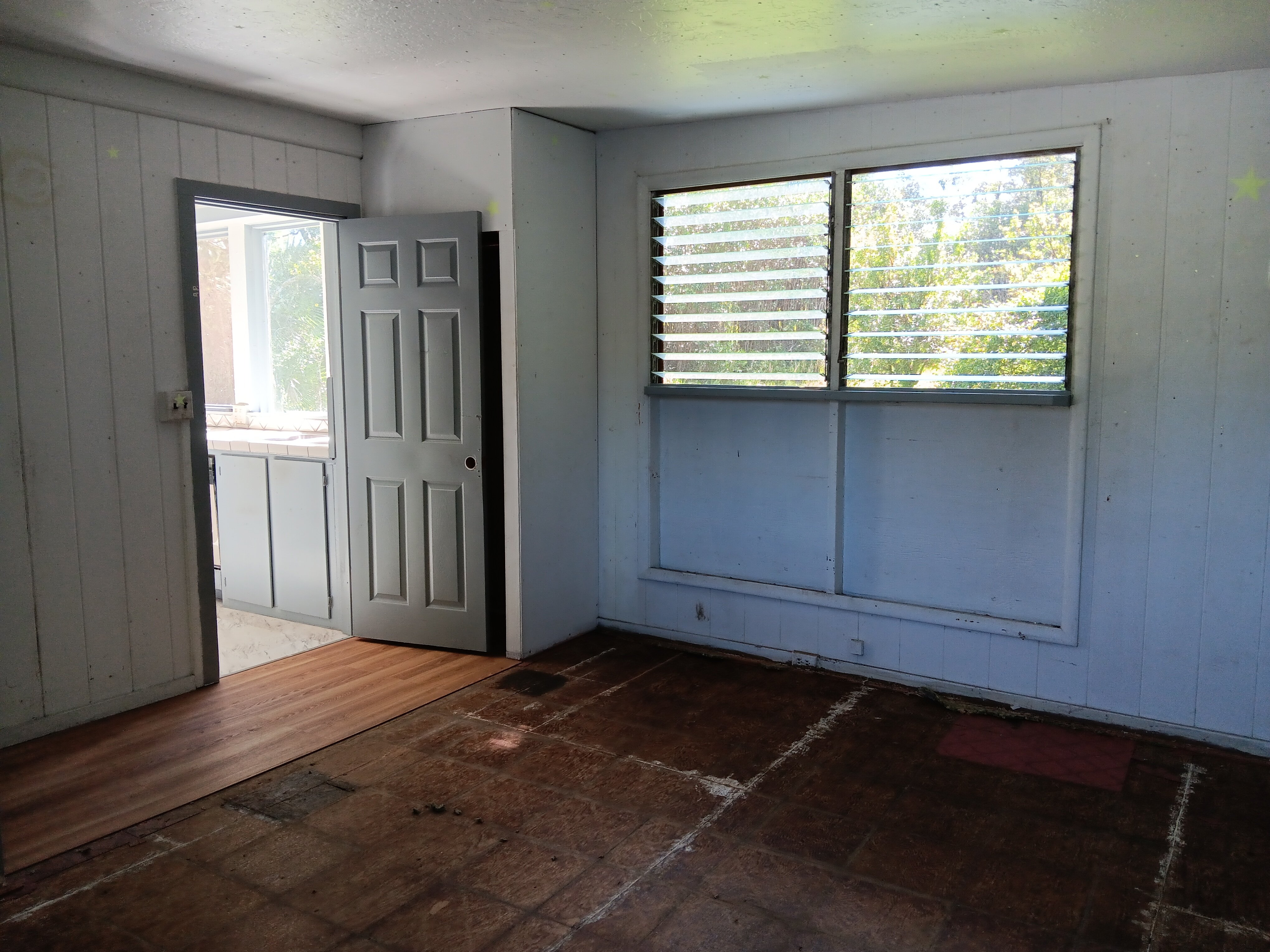 Two bedroom one bath home with open concept kitchen and living room area. Two car garage with a small enclosed deck out front for relaxation and or storage space.