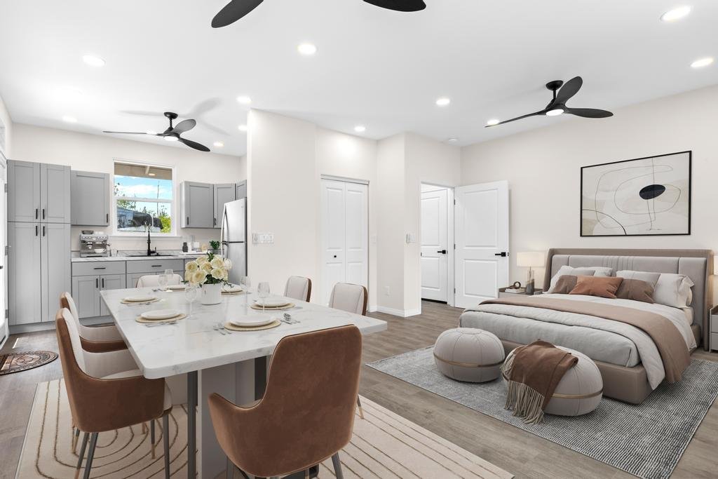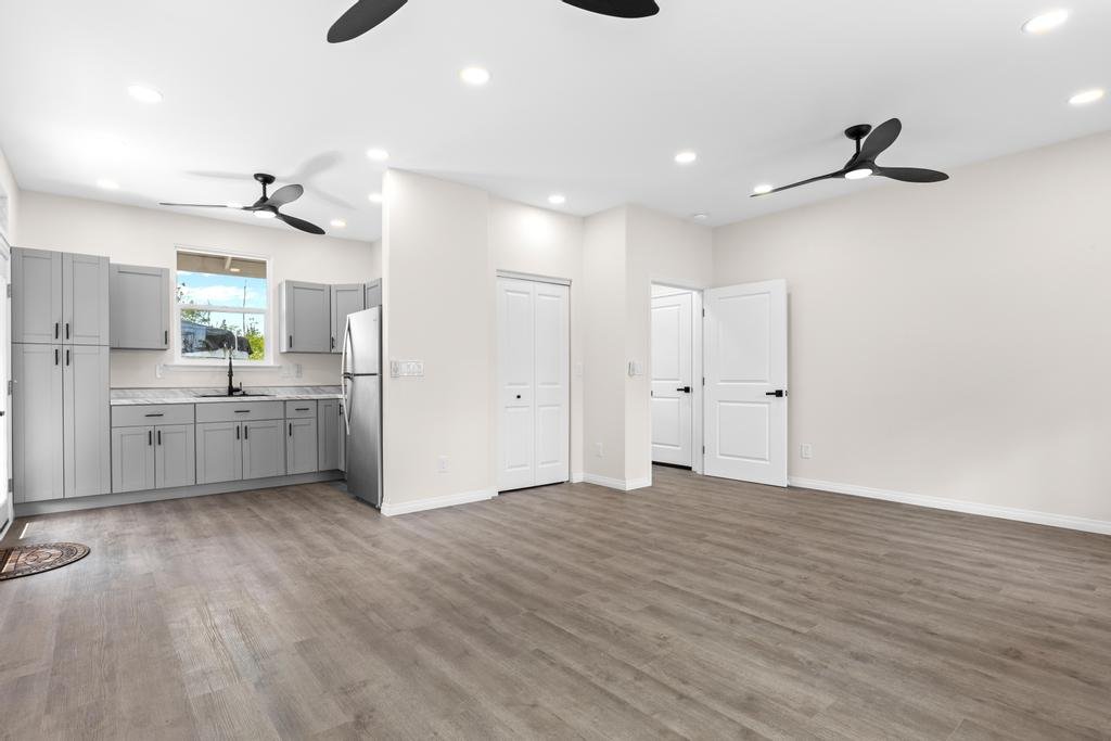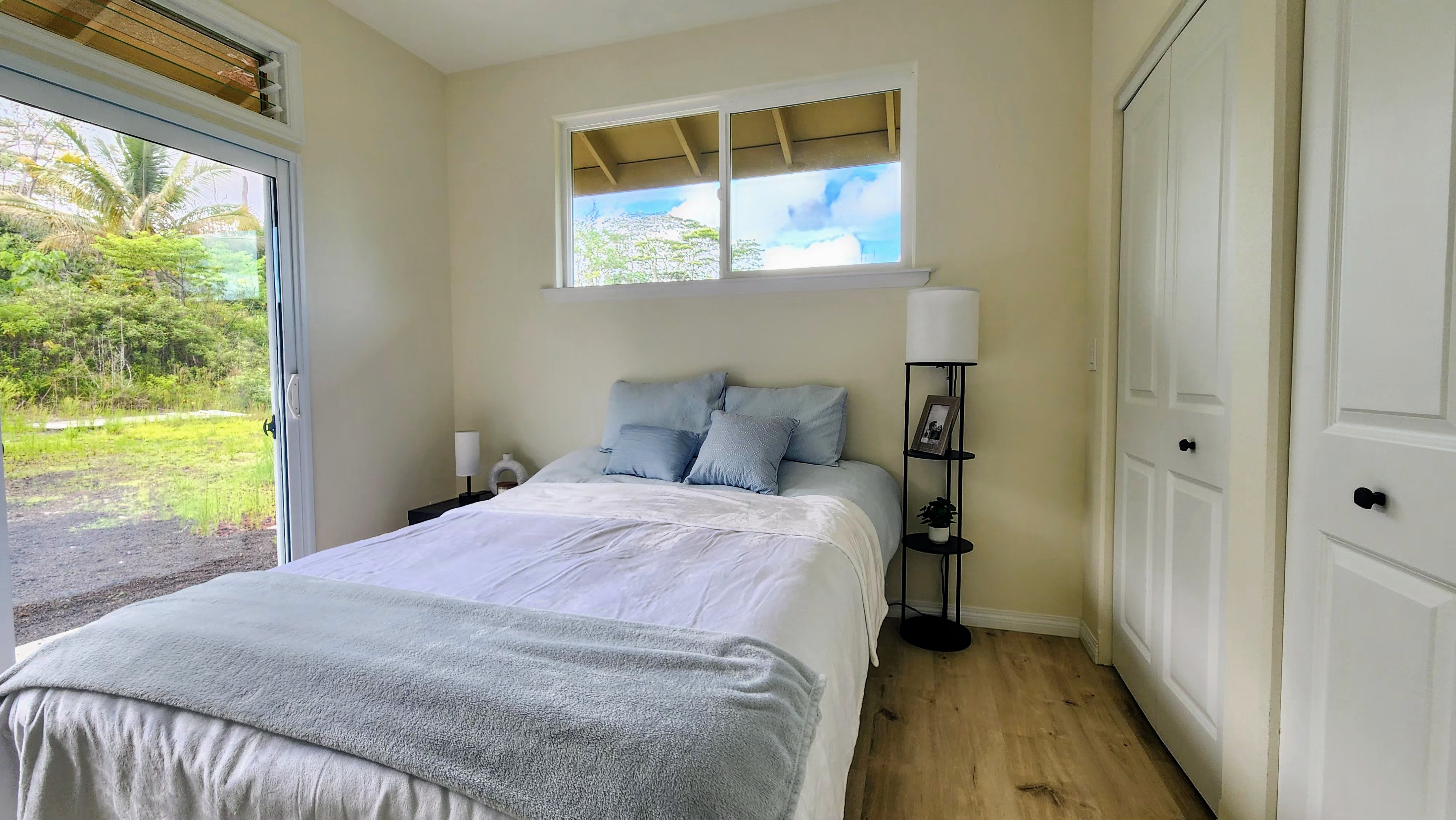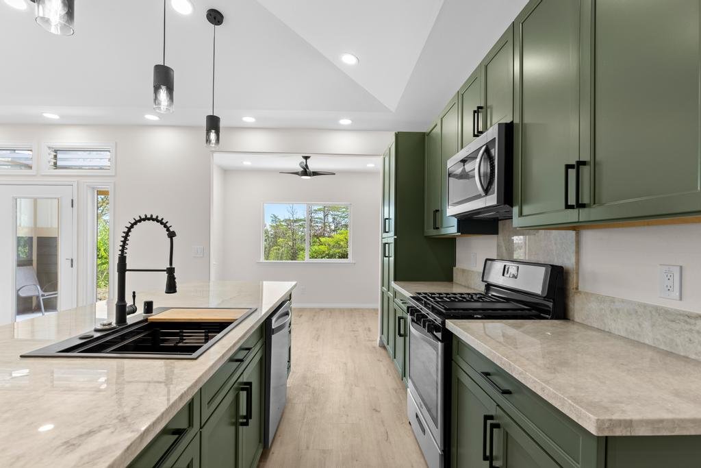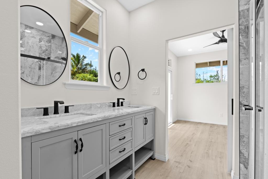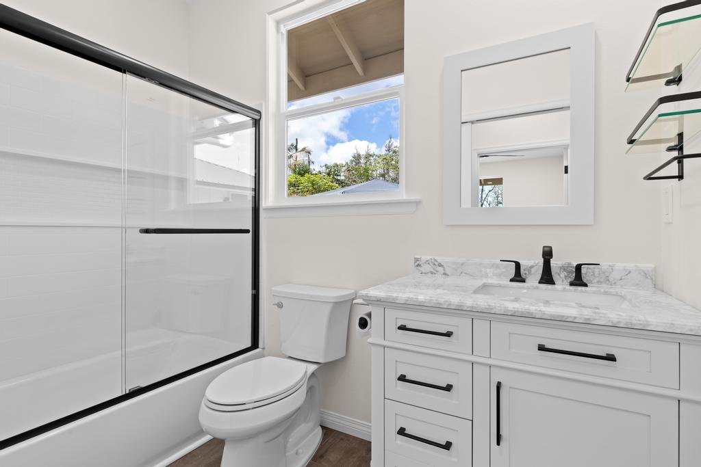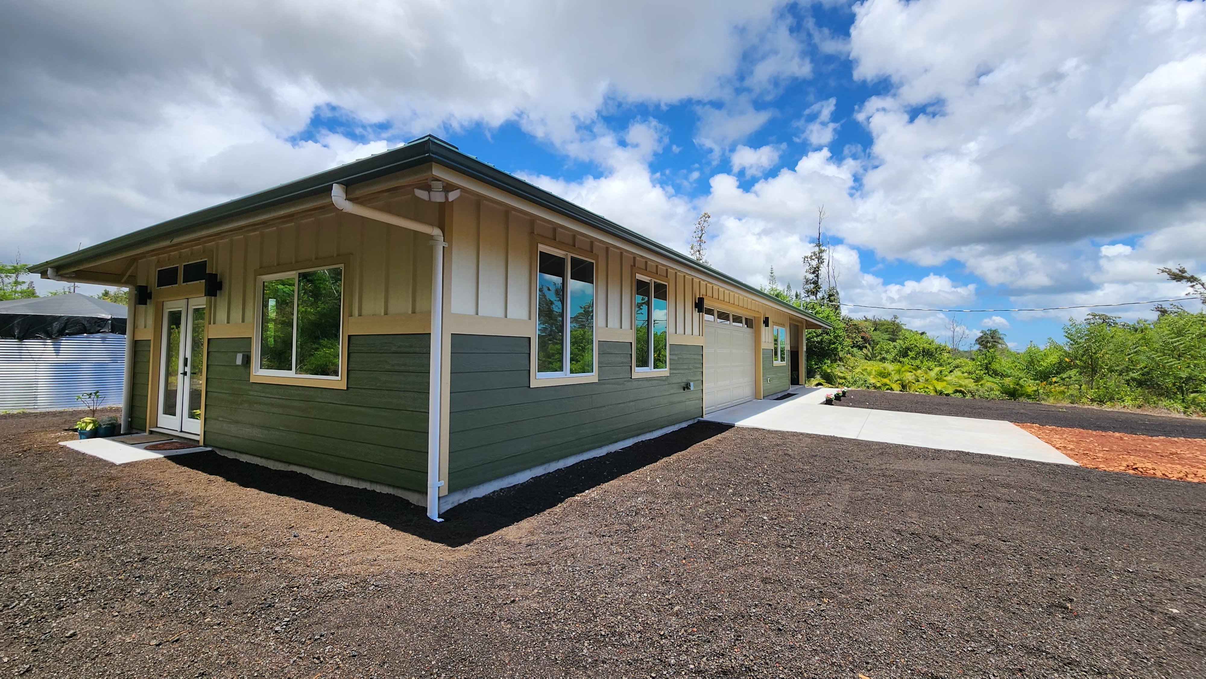 New custom-finished home. This single-level design features a welcoming main residence with 3 bedrooms and 2 bathrooms, highlighted by an open-concept living area perfect for entertaining – a spacious kitchen with an island opens into the living room. Enjoy abundant natural light throughout, including a separate dining area with views of the front yard. The primary bedroom offers direct access to the backyard, ready for your personal landscaping touch. The attached garage not only offers parking but also cleverly separates the main home from the ohana/studio. Inside the garage, you'll find a storage closet, washer/dryer, utility sink, and a dedicated electric vehicle charging outlet. The studio presents spacious living with a full bathroom, kitchenette, and its own private entry – offering incredible flexibility as a home office, rental unit, or comfortable accommodations for visitors. Come enjoy island living in this new home!