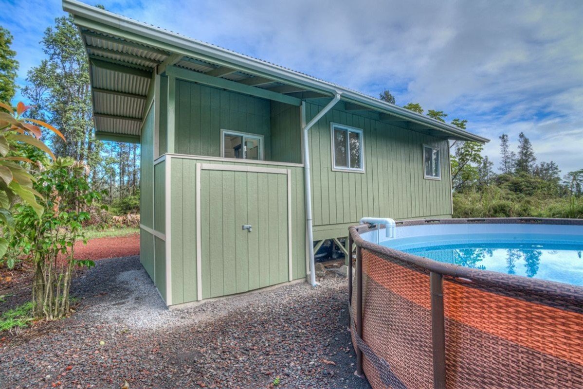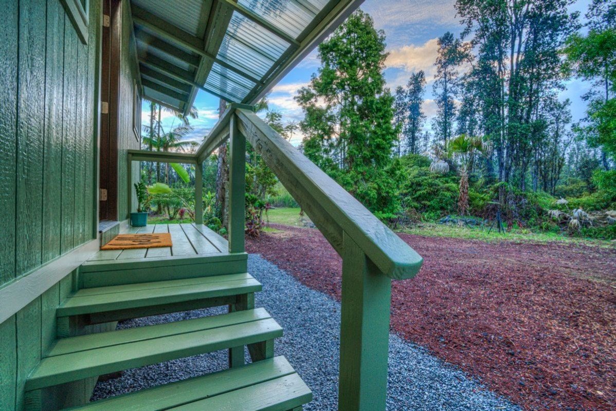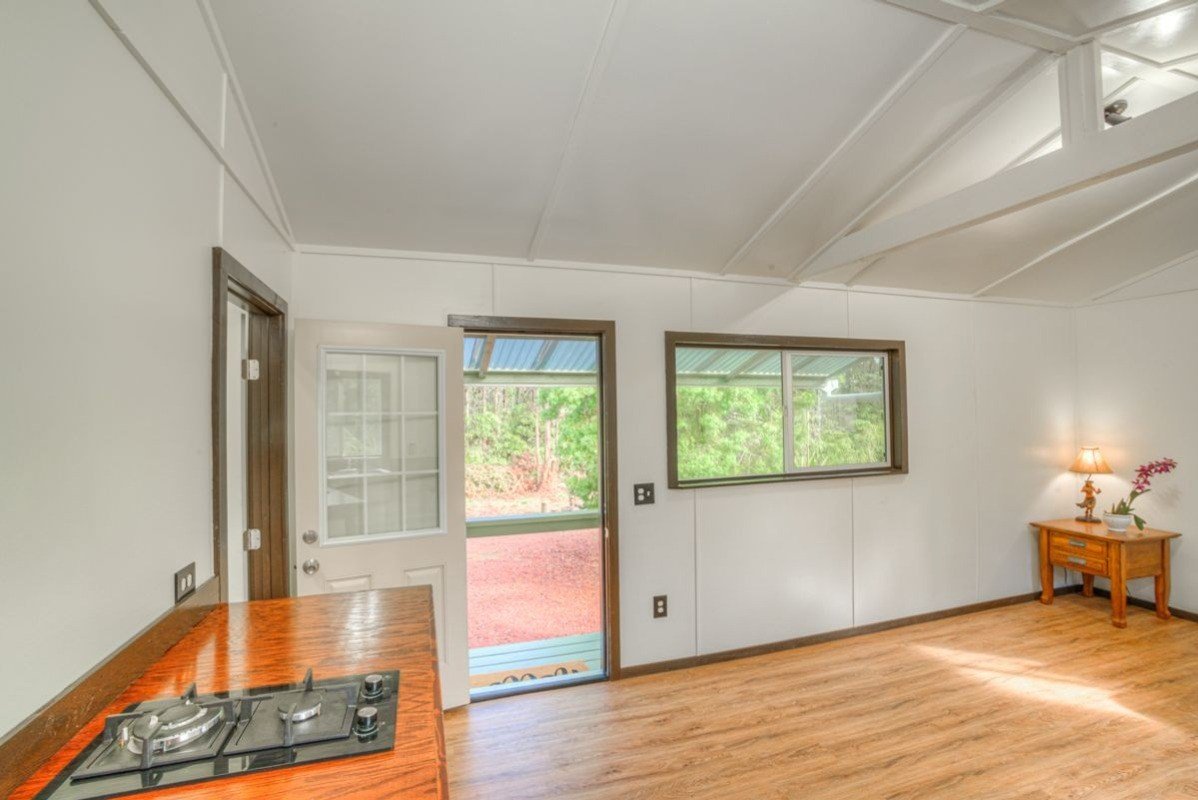 Located on 3 wooded acres in Hawaiian Acres is this adorable little, off grid cabin. Completely remodeled in 2021, this tiny home is like brand new. This studio home has 324 sq ft of living space with a full bathroom. Tiled shower and laminate flooring throughout. The power is via generator but is set up for you to add your solar panels and invertor. There is a 12 volt refrigerator and propane, on demand hot water heater. The catchment tank is brand new and roughly 5,000 gallons. The 3 acre property is fenced and gated at the front and has some mature landscaping including podocarpus, avocado, coffee, palms and many native ohia trees. The interior of the lot had been previously bulldozed but is now overgrown so clearing more land for your desired uses would be fairly easy.Seller is willing to consider seller financing with half down and terms to be negotiated.