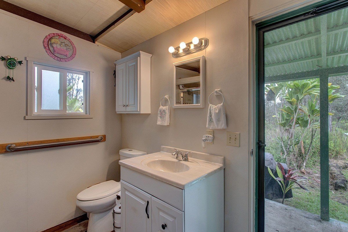 Move-in Ready Cabin on 3 acres, completely off grid. Nestled in Native Ohia Forest on post & pier, the 24 x 6 covered lanai looks out to a large Mango tree,2 large Puakenikeni trees, and a Palm lined driveway. The functional kitchen has a gas range, conventional refrigerator is frost free (3 yrs old), microwave, pantry, everything in the kitchen stays. The ceilings are insulated, bathroom has lots of storage for all your linens, tiled shower, with a back door to a covered lanai where you can grill dinners on your new propane grill and watch TV on a 32" Samsung. In the back yard there is a 1,000 gallon catchment tank (4yrs old),pump house (self contained), 300w solar control, 2-6 volt batteries, 12 volt pump, pressure tank and filters. A large 24 x 14 storage area where you will find a new washer and dryer, 10-6 volt battery bank wired for 12 volt operation, 2000w, 12v/120v inverter, 2-400w, 1-220w system with controllers (total 1020w), back up generator included in the sale as well as all the furnishing, riding mower, weed eater, yard tools and more. The current owners has done many upgrades since they bought this home 4 yrs ago. It is definitely one of the cutest cabins in the area, and if you decide to build another home on the property there is a 100 x 100 house pad with 10 truck loads of back field.Telephone line runs to the cabin. Cabin built without a permit. To be Sold with AS IS Addendum.