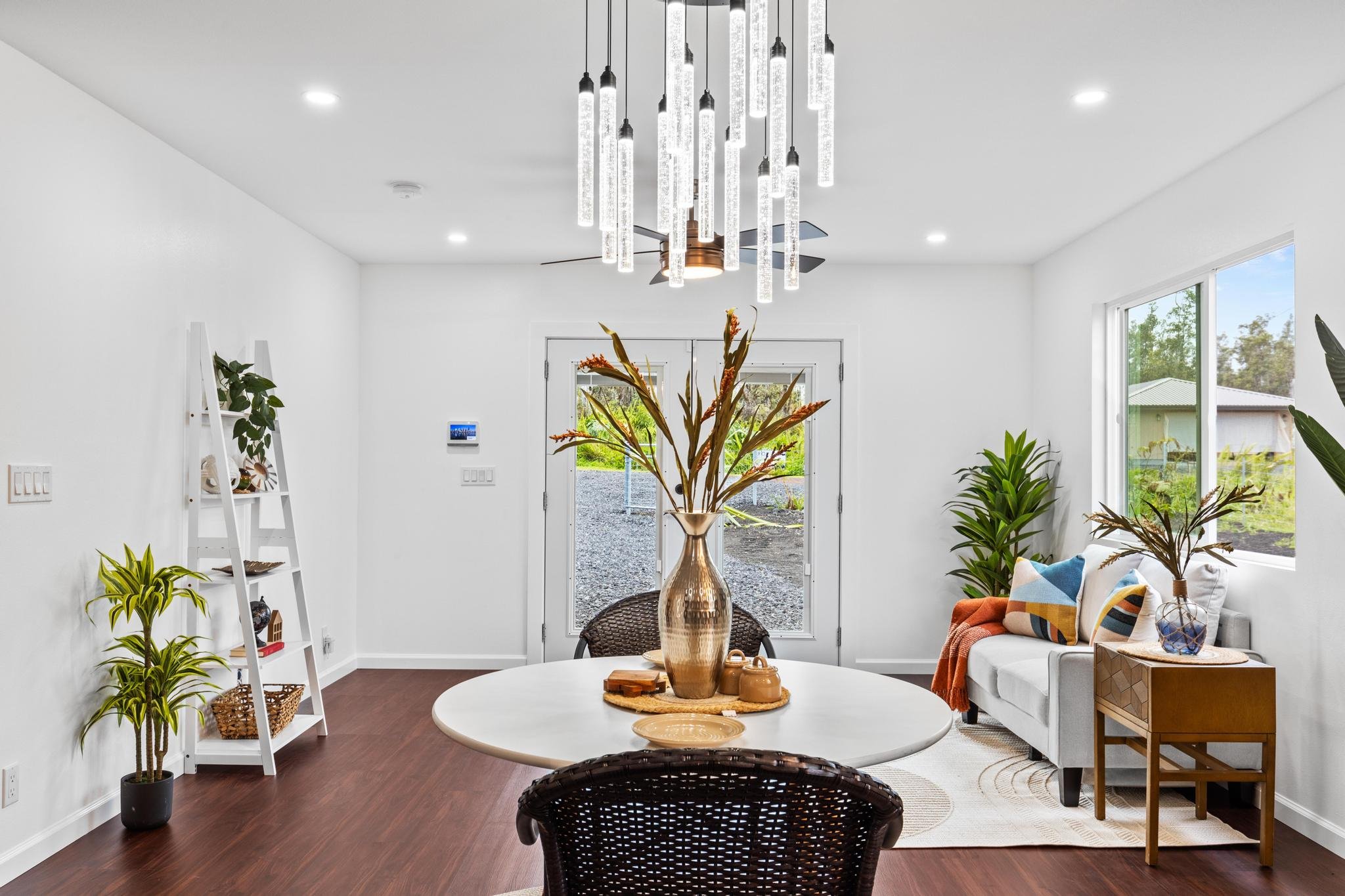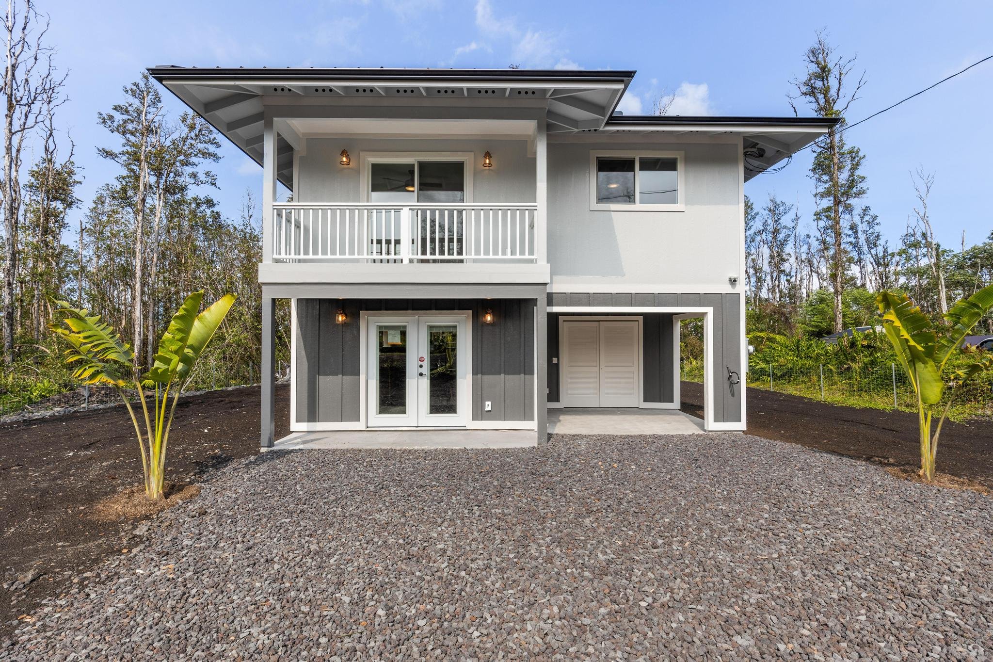 One of a kind! Every detail in this custom-designed home has been thoughtfully crafted to blend luxury with natural beauty. As you arrive, you’re greeted by a low-maintenance yard featuring natural cinder landscaping, beautifully complemented by native Hawaiian flora, including iconic Ohia trees. The setting offers a serene and authentic island ambiance, reflecting the beauty of Hawaii's natural environment. Property is fully fenced and comes with a pre-wired MPI home security system, providing privacy and security to your peaceful retreat.