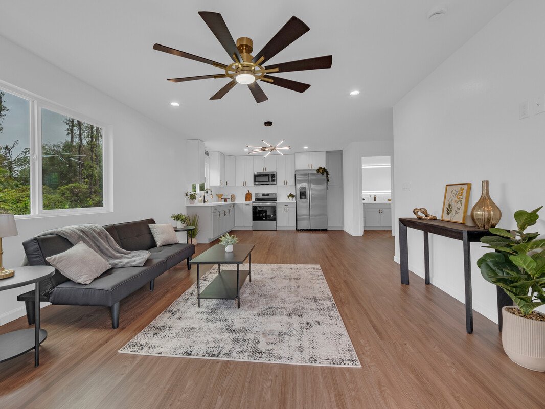 Welcome to your brand new home in Ainaloa, Hawaii. Enter through the double doors into your central hub; the living room, dining room, kitchen & downstairs full bathroom. The kitchen comes fully equipped with brand new appliances and beautiful granite. The spacious under stair closet is perfect for additional storage or for use as a desired food pantry.Upstairs you will find 3 bedrooms, a full bathroom and the laundry room fully equipped with a front loader washer and dryer. Step out onto the charming upper-level lanai, ideal for sipping your morning coffee or showcasing your favorite potted plants.This fully fenced property offers privacy and peace of mind, complete with MPI security services. With ample outdoor space, you have the freedom to personalize. Whether you envision raised garden beds, a storage shed, or a custom BBQ area, the possibilities are endless.Located in Ainaloa, you’re about 6 miles away from Pahoa town. Current real property tax is for land only, house not yet assessed for taxes.