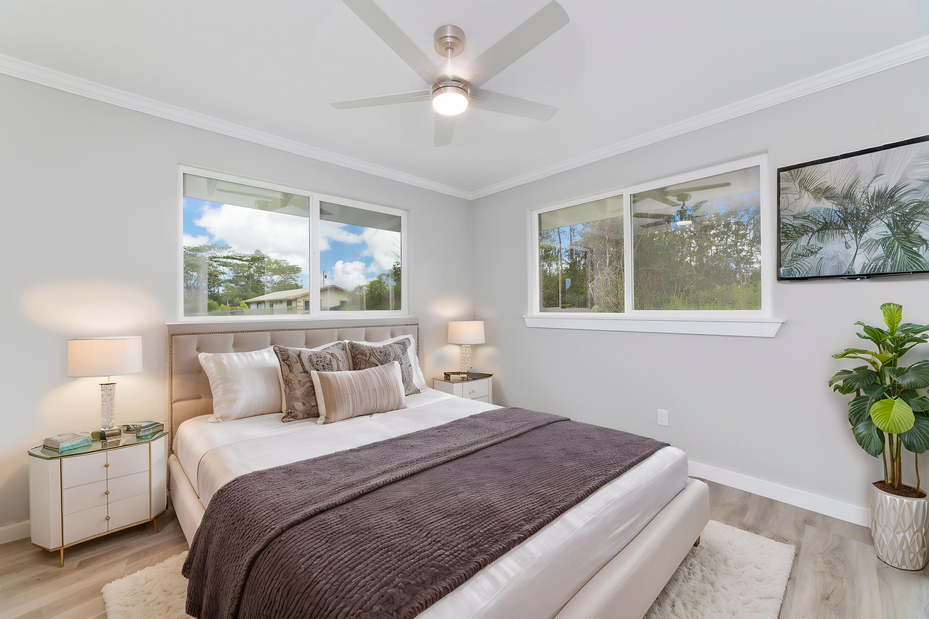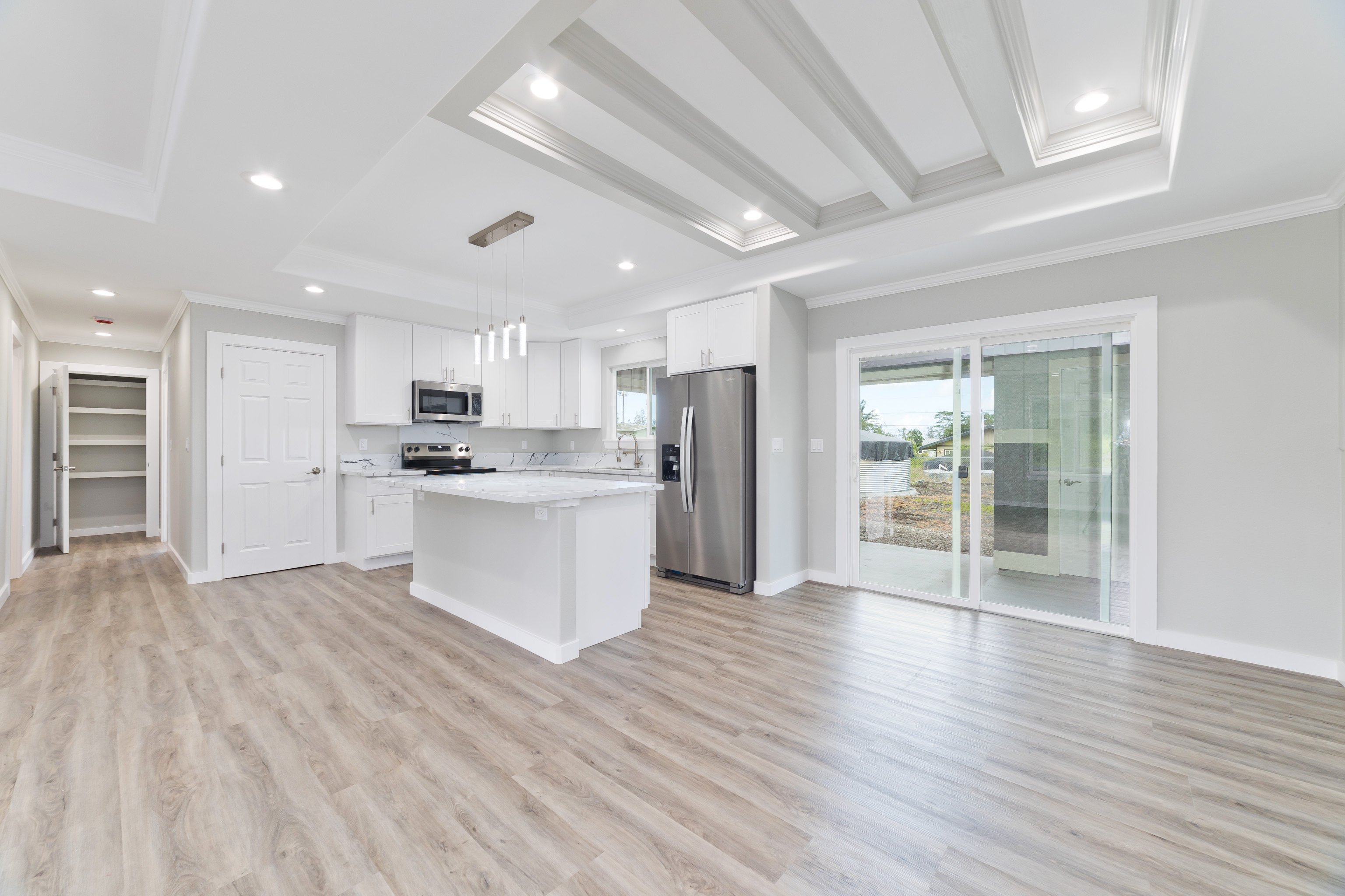 Stunning Custom Home in Ainaloa EstatesWelcome to your dream home, a beautifully designed custom residence nestled in the desirable Ainaloa Estates subdivision. This exceptional property boasts high-end finishes and thoughtful details throughout, offering both luxury and comfort in over 2,200 sq ft of under roof space.Step inside to discover a spacious kitchen, featuring ceiling height cabinets, a walk-in pantry with custom shelving, and a striking double tray ceiling above the island, complete with LED lighting that sets a warm ambiance. The adjoining living room is perfect for entertaining, highlighted by an elegant electric fireplace that adds a cozy touch.Enjoy the outdoors with an amazing covered entry patio and an expansive back lanai, ideal for gatherings or enjoying dinner with cool afternoon breezes. The well-planned layout includes a split floor plan for added privacy. The primary suite is a serene retreat, showcasing a walk-in closet and a luxurious bathroom with a beautifully tiled stand-up shower.On the opposite wing of the home, you'll find two additional bedrooms equipped with custom built-in shelving and a full bathroom. The indoor laundry room is a functional space that includes a half bath, ceiling height cabinets, and a convenient hanging rod.Additional features include an oversized garage with ample storage space housing the water heater and pump, ensuring your home remains organized and clutter-free. The septic and catchment tank located at the back of the property opens up endless possibilities for landscaping and outdoor enhancements in the front.This stunning home is not just a place to live; it's a lifestyle choice.