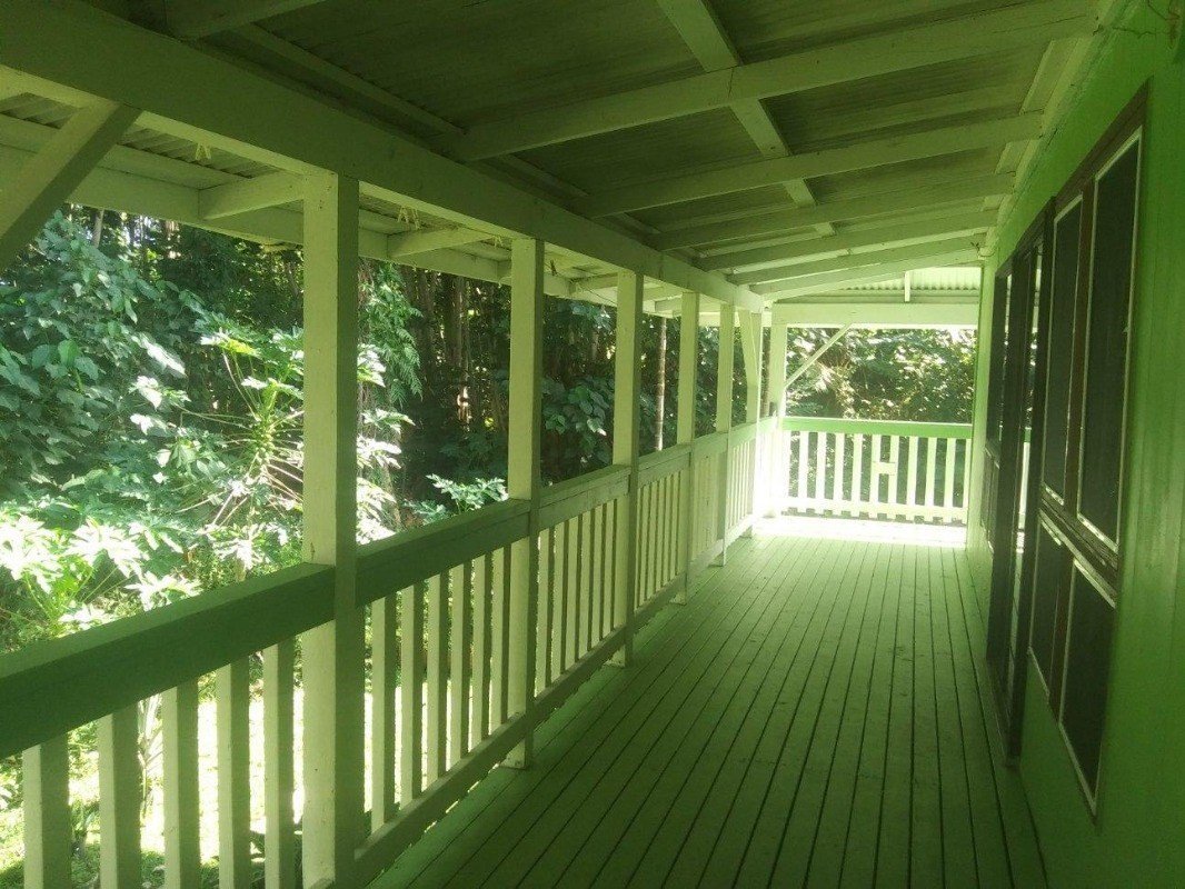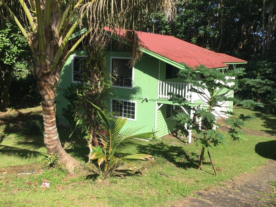A stellar opportunity to pick up an open beam cedar T&G 2 story, 2 bed 1.5 bath home in the quiet and centrally located town of Kea`au. The upstairs is a 2/1, and has been recently renovated. The downstairs is basically the same sq. ft. and a 2/.5, waiting for your finishing touches. This is effectively double the listed sq. ft. of living area, and is priced to sell! Nestled on a nice sized lot with old growth palms and fruit trees including: orange, papaya, coconut, a massive lychee, and an exotic mamey sapote (Google that one!). You can easily forget you are actually in town, yet it's only about 3 blocks and an easy walk to the Kea`au shopping center! Termite Warranty good until 5/21/21. To be sold As-Is. Staking was recently completed, no staking or survey by seller. Owner occupied, 24 hr. notice required, no showings before 10am. From Old Volcano Rd. in Keaau, go down Milo St, right on Ohe, left on Uhiuhi St, house at the end.