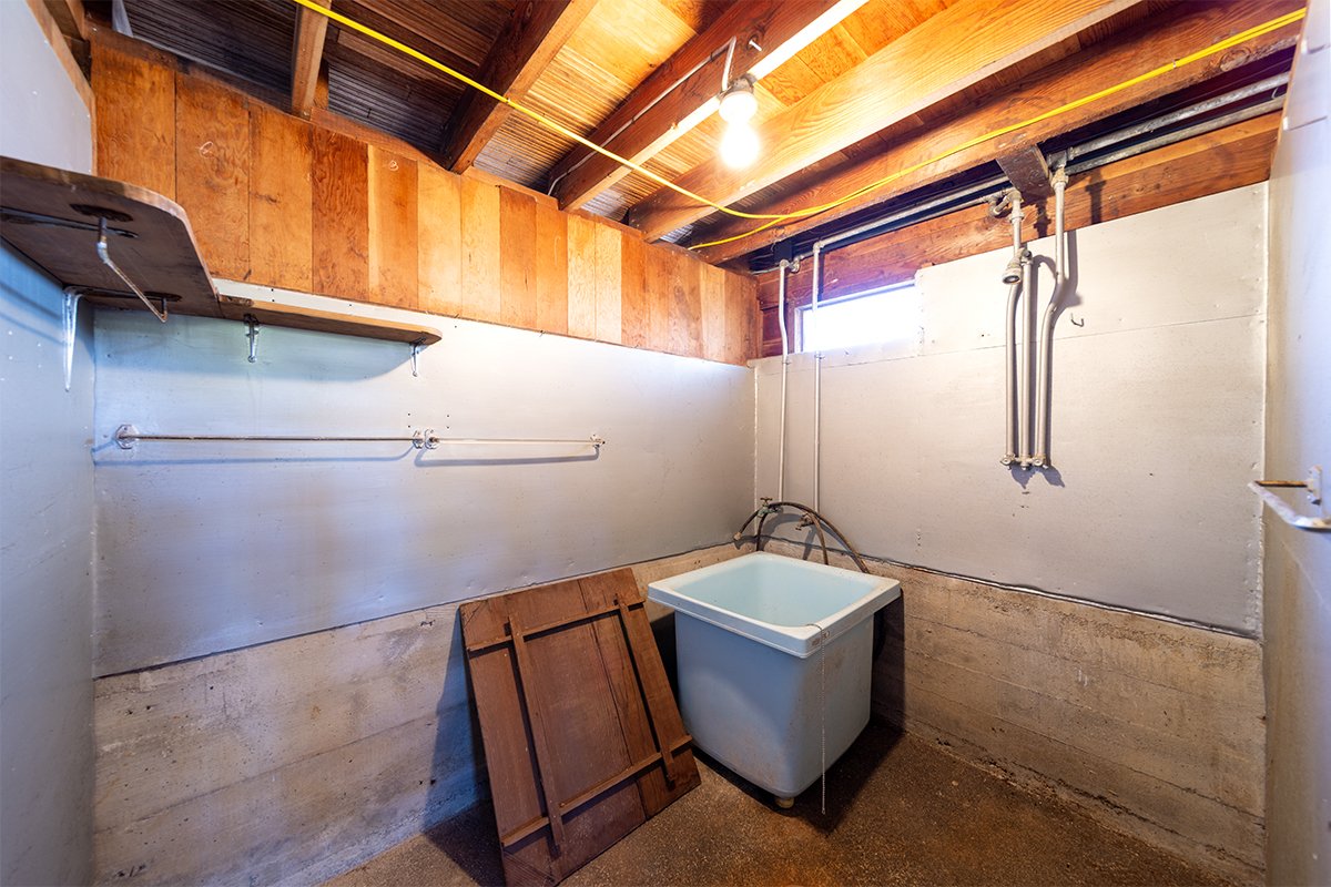 Downstairs, the lower level includes a laundry room, vintage shower and toilet, and ample storage, making it perfect for hobbies or extra workspace. A covered back lanai offers a peaceful spot to relax or for family gatherings. The large grassy backyard also has anthuriums and tropical foliage, creating a serene and open space..