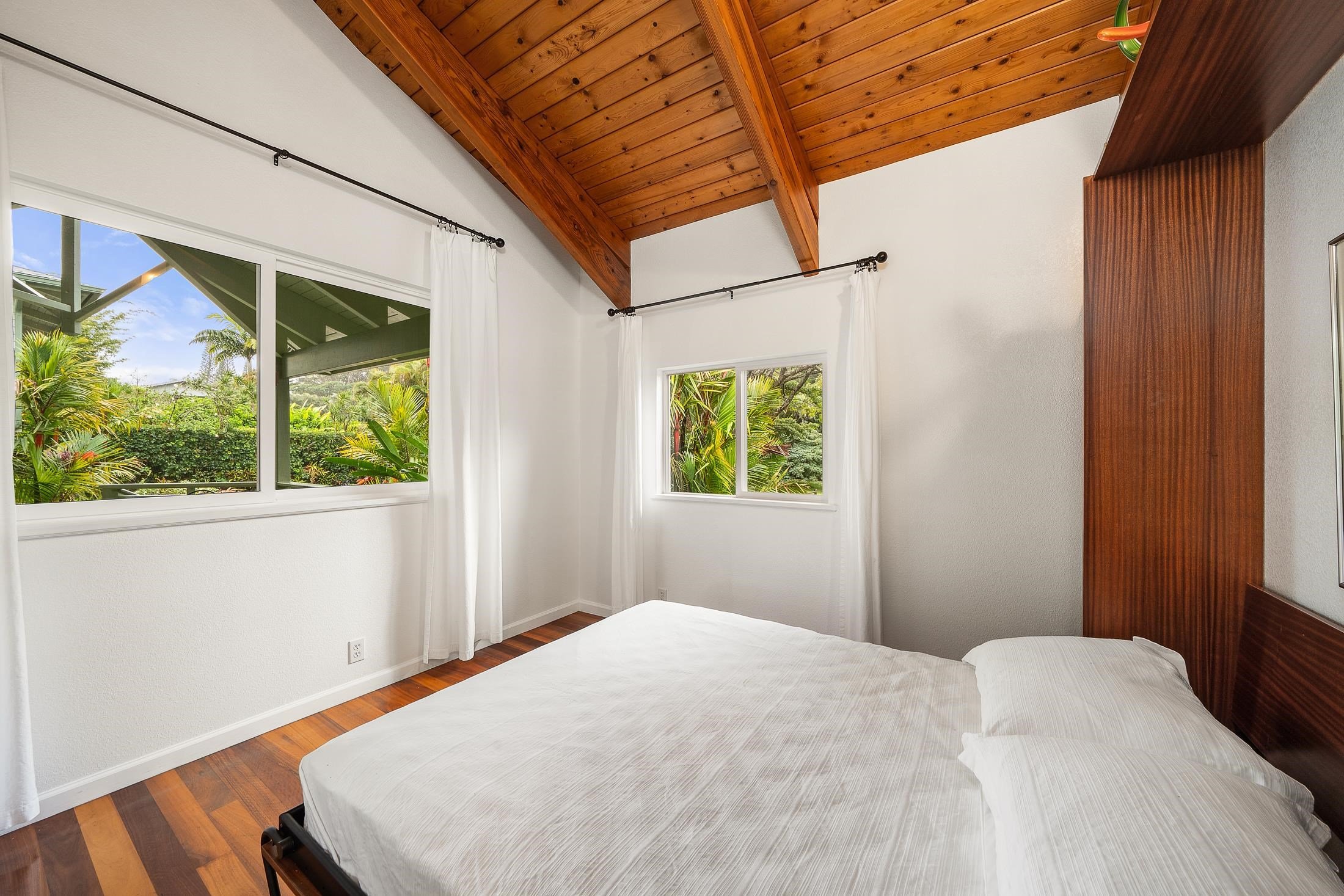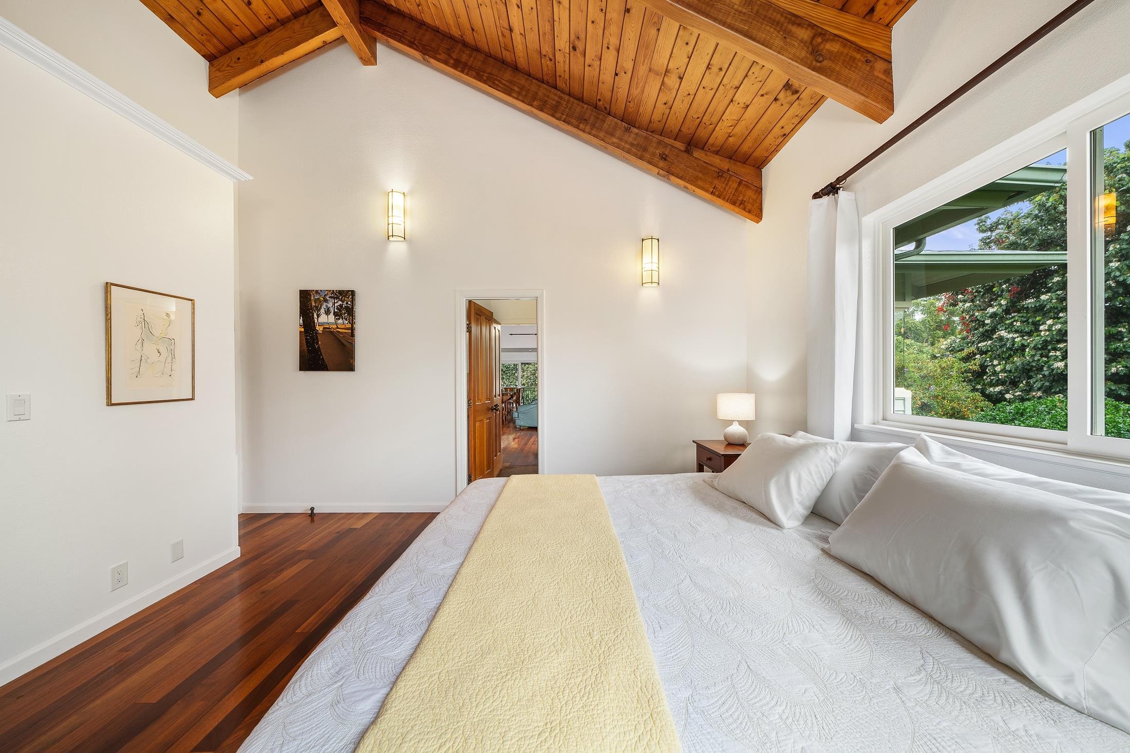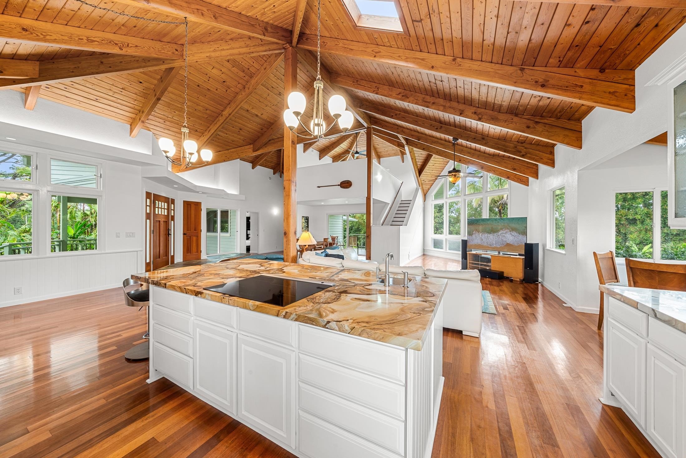 Architect, Ken L. Morin, perfectly captures contemporary Hawaiian style in this spacious and dramatic home located behind gates in southwest Haiku near the end of a quiet cul-de-sac. This 4 bedroom, 3 ½ bath home is 3430 sq. ft. of living space plus 760 sq. ft. of covered deck space. Natural interior finishes of granite, marble, slate, travertine and eucalyptus fuse with natural light from the many windows and skylights to bring the feel of Maui’s nature indoors. The lush tropical landscape of flowers and fruit trees on the gently-sloping, 2 acre parcel affords natural privacy with bucolic garden views. Solar hot water and an owned photo-voltaic system with backup batteries provide reliable, affordable power. Open-concept living begins with 17’ cathedral ceilings. A large island with prep sink houses the induction range and overlooks the main living space. View the garden through the glass-to-glass corner window behind the main sink. Custom indirect lighting in colors of your choice bathe the living and dining areas. Retreat to the light and airy loft cantilevered over the main living area. Cathedral ceilings, a mini split AC unit, built-in dressers, and customized closet elevate the primary bedroom. Relax on its private, covered deck and watch the butterflies or perhaps in the ensuite bath’s soaking tub surrounded by Calcutta marble. Other primary bath features include a spacious shower with dual shower heads, dual sinks, towel warmers and custom medicine cabinets. The fourth bedroom may serve as a suite for extended family as it includes a ensuite bath, private lanai, kitchenette, and a separate entrance. An 18’ X 15’ greenhouse provides optimum growing conditions for a variety of vegetables and flowers. A central vacuum system makes vacuuming easy. There is more yet to discover. The roof is new (Sept. 2024). The home was tented in 2024 and includes a warranty. A survey was conducted in December 2024. Seller will provide Buyer with a home warranty policy for one year. Seller is a licensed Realtor® in Hawaii, Listor is Seller.