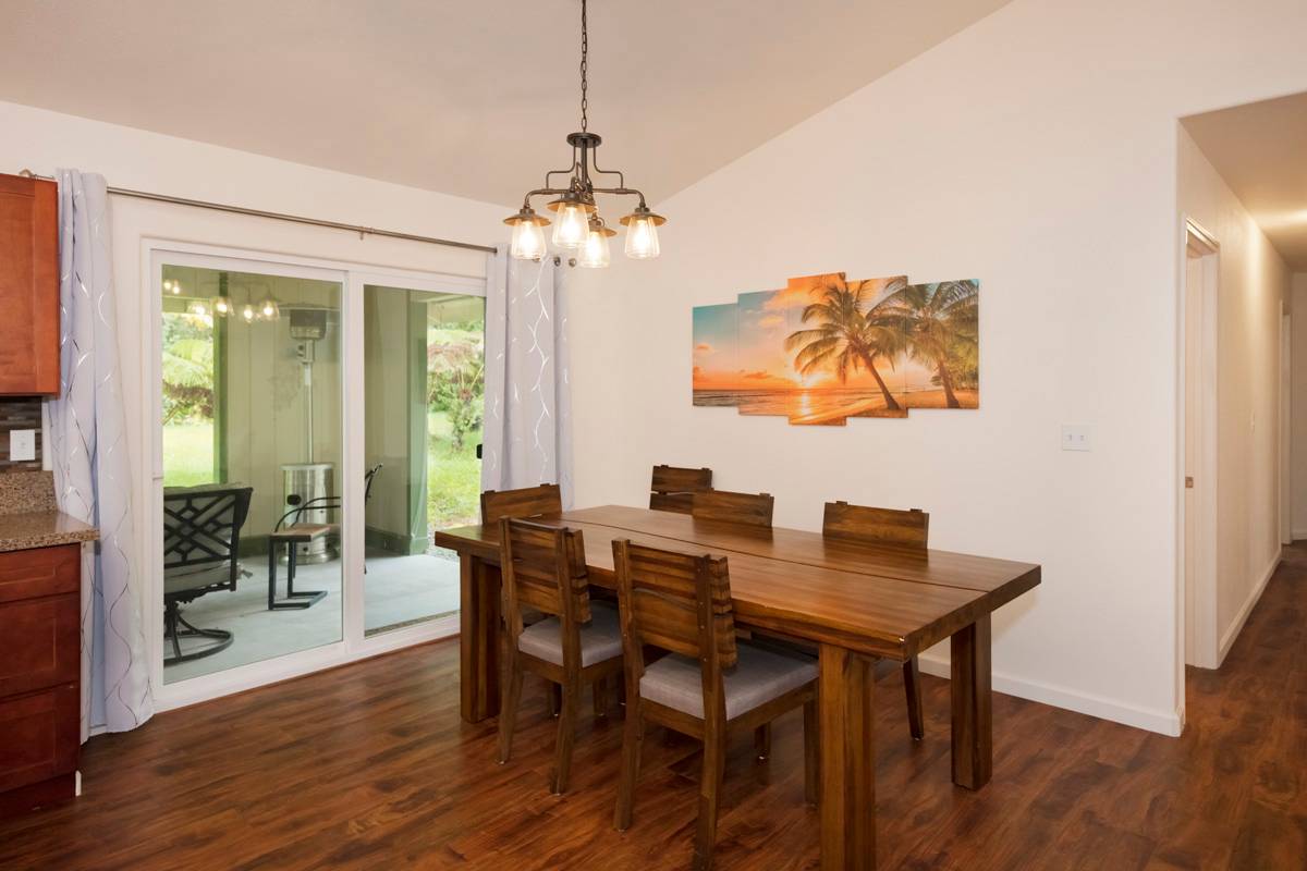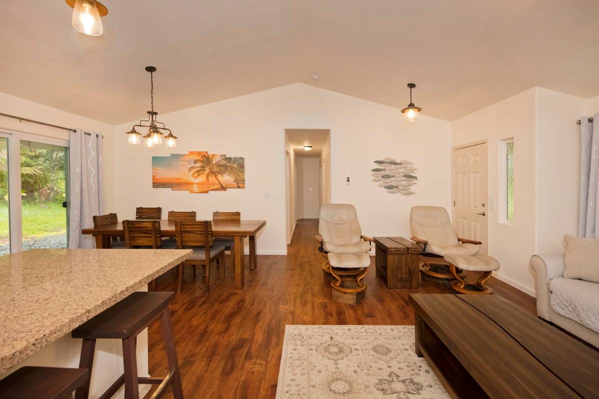 Wake up to enjoying breathtaking sounds of the rain forest from your cozy home or lanai in the Village where at sunset, the sky sometimes glows in shades of red, pink and gold! Comfort and warmth is felt in this lovingly cared for 3bd 2 ba home and garage in Volcano Village! This is such a convenient location for many who feel it is so important to easily go over to the farmers market or just enjoy this special neighborhood. This home is thoughtfully laid out & has three bedrooms and two full baths all on one level. The main great room has forest and lanai views and is large and comfortable with propane fireplace. This room flows into the dining area and on to the well designed kitchen which will make any chef happy. Off the kitchen is a large Pantry. Then a door to the 2 car garage with a utility room with washer and dryer and water filtration system. Out the back is a covered lanai ideal for entertaining! Just minutes from what the Village has to offer including local restaurants, and shopping at the vintage store. This home places you in the heart of Volcano’s vibrant community. The property embodies the essence of Hawaiian living—a relaxed lifestyle surrounded by natural rainforest beauty and modern convenience. Whether you're looking for a full-time residence or a vacation getaway, this home is worth the look.