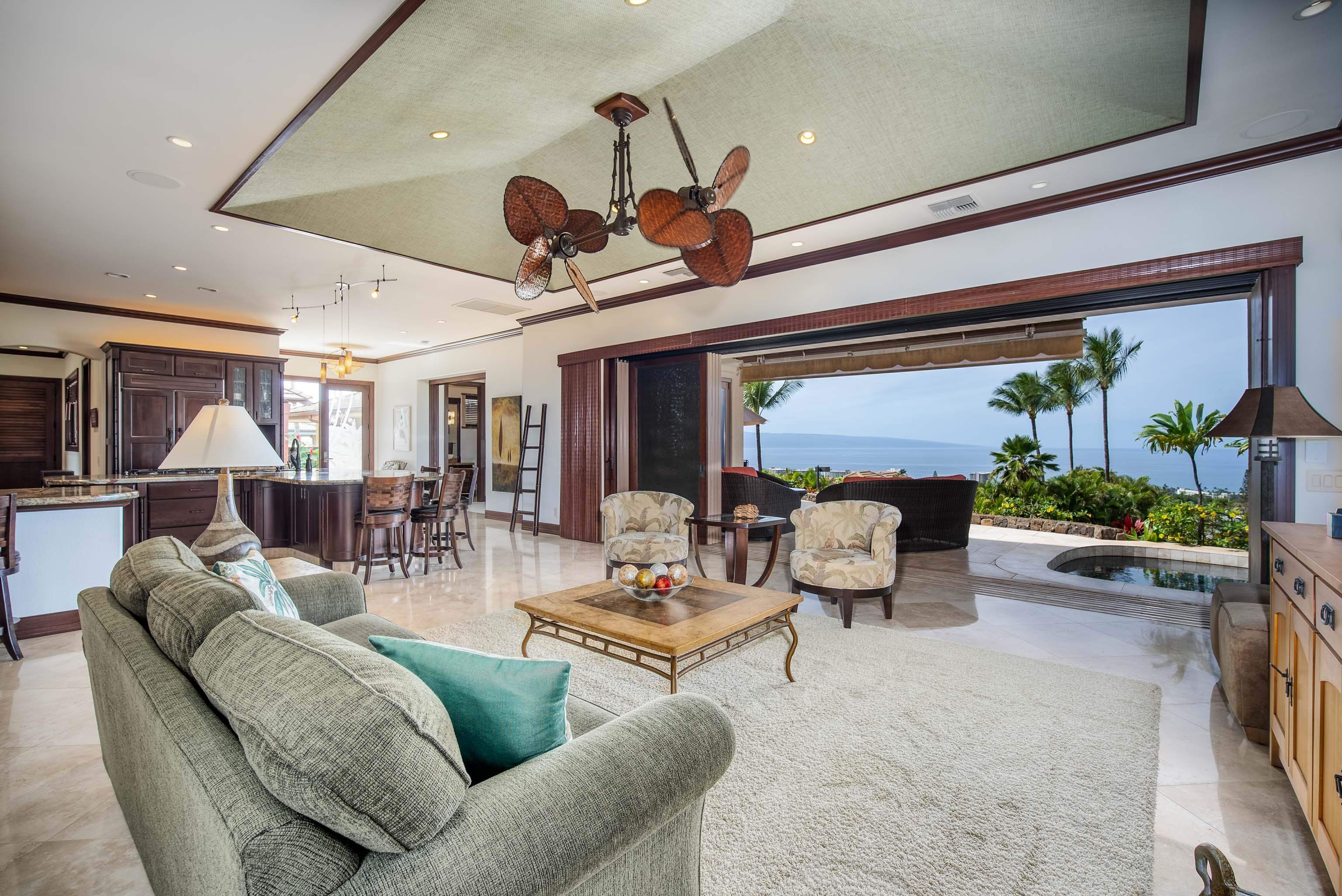 Welcome to this exquisite one level three-bedroom, four-and-a-half-bath single family home located in the prestigious Kaanapali Golf Estates on the enchanting island of Maui. It overlooks the world famous Kaanapali resort area and a Humpback Whale National Marine Sanctuary. This custom-built residence exudes the unmistakable charm of Hawaiiana island ambience while offering modern comforts and breathtaking ocean views. Upon entering this remarkable home, you'll be greeted by an open floor plan that seamlessly blends the main living areas, creating an inviting and spacious atmosphere. The large kitchen, the heart of the home, is a culinary enthusiast's dream with expansive counter space, a large pantry and custom cabinetry that provides both functionality and elegance. Whether you're preparing a casual meal or hosting a grand gathering, this well-appointed kitchen is sure to impress. The living and dining areas flow effortlessly from the kitchen, bathed in an abundance of natural light that streams in through expansive sliding glass doors and windows, revealing panoramic views of the Pacific Ocean, Lanai and Molokai. The high ceilings, adorned with mat inserts, pay homage to traditional Hawaiian craftsmanship, adding a touch of cultural authenticity to the living and dining spaces. Every detail has been meticulously designed to create a harmonious blend of modern luxury and timeless island heritage. This single-level home offers two spacious bedrooms in the main house. Both the primary and second bedroom has a private en-suite bathroom, with a walk-in shower. In addition to the bedrooms, there is a dedicated office space with views of the ocean and islands, allowing for a convenient and comfortable area to work or study. With a bathroom, this space could also serve other uses. One of the unique features of this remarkable property is the separate guest suite, known as an Ohana, which offers privacy and comfort for visiting family and friends. Complete with a wet bar, this self-contained living space is a perfect sanctuary for guests, providing a cozy retreat amidst the island paradise.The exterior of the property is equally captivating, with beautifully landscaped grounds. Immerse yourself in the stunning surroundings as you relax on the expansive lanai, savoring the gentle trade winds and breathtaking sunsets that paint the sky in hues of orange and pink. The gardens offer a picturesque backdrop for outdoor enjoyment. Situated in the prestigious Kaanapal