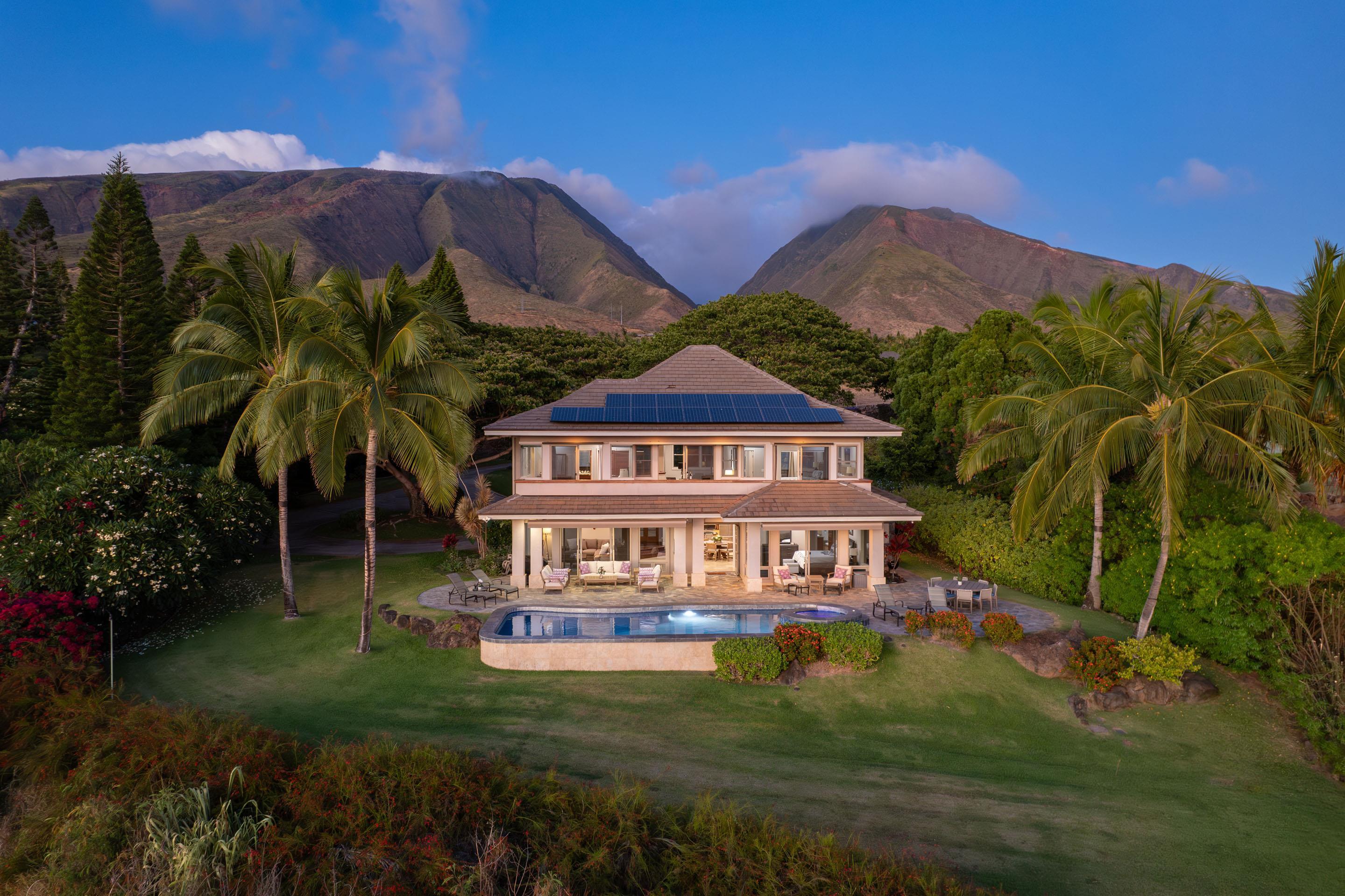 A perfectly located 2.02 acre sanctuary with massive ocean views in the heart of Launiupoko awaits. Welcome to 220 Paia Pohaku, a 4 bedroom/4 bathroom, 3,069 square foot luxury home with one of the most private and protected lots in Launiupoko. From the moment you enter the driveway the mature landscaping and Monkeypod trees on the property set the scene for this private ocean view retreat featuring a large outdoor pool/spa area with sauna and outdoor shower. Ocean views are visible everywhere inside the home as well, with the kitchen, living area, dining area, master suite, additional full bathroom and laundry room located on the first floor. On the second floor you will find a second large living area, three bedrooms, two full baths, and a second large lanai. Natural light fills the home from a variety of large, well-placed windows and each corner of the home has corner windows bringing even more of the great views inside. Electricity bills remain low with a large, 65 panel photovoltaic system and 4 Tesla backup batteries. On the property is a 'cocktail orchard' with a large variety of citrus, bananas, mangos, avocados, and more. The only way to experience this exceptional property is to come see it in person, so schedule your showing today!