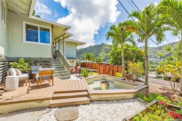 Rarely available in the "Carlos Long" neighborhood, tucked in a cool corner of Palolo Valley. This 5-bedroom, 3-bathroom (PLUS additional studio & bath) was completely rebuilt in 2012 with double wall construction, updated electrical & above ground plumbing, vinyl windows, & features over 2000sf of living space. 12 owned PV panels (on net metering)! Split A/Cs in and ceiling fans in nearly every room. Luxury vinyl plank flooring, tile, & carpet throughout. A very functional and open layout perfect for large gatherings with a fun outdoor space that features a composite deck + fire pit combo, grassy yard, and high fences for privacy. The property sits above the rest with views of the valley, Diamond Head, and a little peek-a-boo of the ocean. No neighbors to the rear. See supplements for plat map on shared driveway and contact your agent for more details. No public open house, sorry. Private appointments only.