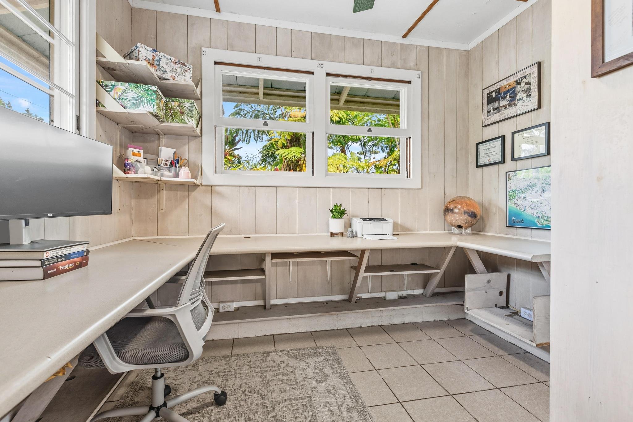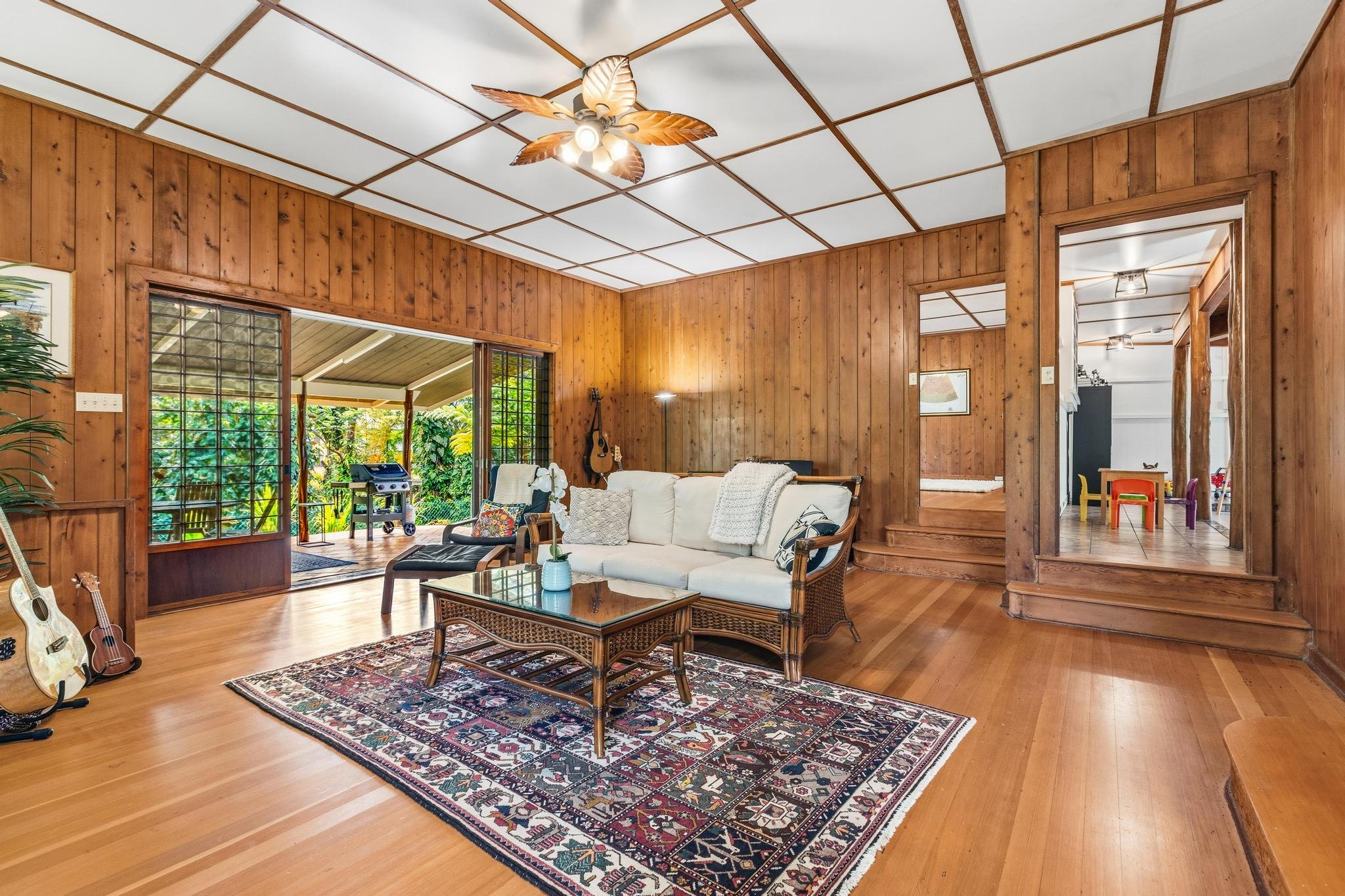 Located in the highly sought-after Reeds Island neighborhood, this classic home blends vintage quality construction with generous living spaces and modern comforts. Designed in the mid-century Hawaiian Modern style with Japanese influences, it features timeless custom details and craftsmanship, including tongue-and-groove cedar walls, original fir floors, and shoji-inspired doors that create a warm, inviting ambiance. An owned 26-panel solar system with net metering provides energy efficiency and cost savings.The great room offers a versatile layout, currently used as a children’s playroom and second home office, but easily reimagined as the home’s main gathering space. Spacious and centrally located, it connects to the kitchen, living room, primary suite, laundry, and home office. The galley kitchen features quartz countertops and modern stainless steel appliances, and for those seeking an open floor plan, it could be opened to the dining area with minimal effort.The large living room includes a wood-burning fireplace, with shoji sliding doors flowing onto a covered lanai overlooking the rainforest, enhanced by the soothing sounds of the Waikapu stream below.Upstairs, the large primary bedroom includes an en suite bath, dressing room with double closet, and built-in storage. Each guest bedroom has its own bathroom, and the third bedroom opens to a private lanai. The full-height lower level, accessible from the living room or a private entrance, offers a versatile fourth bedroom/studio with a bathroom and kitchenette.This 1.25-acre parcel extends to the middle of the stream. The surrounding yard is a tropical retreat, landscaped with flowering ornamentals and pineapple stands. A terraced lawn features a mature fruit orchard with oranges, mountain apples, avocado, and rare water apples. A circular driveway provides overflow parking, complemented by a two-car carport and exterior storage.