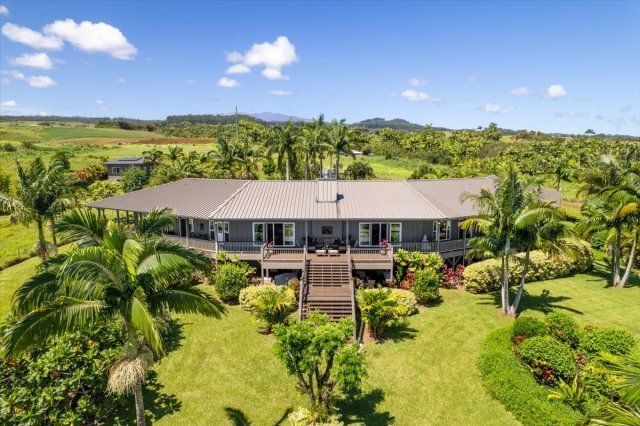 A self-sufficient Hamakua Coast ranch estate with expansive ocean & Mauna Kea views with a year-round stream. Only 8 miles from Hilo, located in the gated subdivision of Onomea Bay Ranch Estates, this thoughtfully designed residence offers a lifestyle in harmony with nature without sacrificing convenience. Privately nestled within the property beyond two automated gate entries, the residence showcases quality materials and construction. A sweeping covered lanai with sliding door access from every room allows for seamless indoor/outdoor living. The timeless home design features a natural color theme and 3/4” tongue & groove clear oak flooring throughout. The lifetime roof is 18 gauge standing seam metal construction. The primary suite is located on the south wing of the home and features a luxurious bathroom with a deluxe soaking tub, step-in shower, double sinks and walk-in closets. The great room impresses with its vaulted ceiling and a wood- burning fireplace. The kitchen offers a gas range, Belmont custom cabinets, quartz countertops, island and a walk-in pantry. Guests en-suites are located on the north end of the home adjacent to the large double bay garage with 20’ ceiling, laundry room and a loft. Outdoor amenities include an outdoor shower, covered BBQ area with picnic table and an additional full bathroom. The property is equipped with an 18K-gallon water collection storage system and two efficient tankless water heaters. Harnessing solar power, the estate features a powerful off-grid solar array with two Blue Ion battery storage systems and a whole-house Kohler generator back-up system. Positioned at an ideal elevation between 730 and 811 feet above sea level, you will enjoy cooling trade winds year round. With a mature orchard of cacao trees & coffee trees, various citrus & tropical fruits trees, a raised bed garden and greenhouse, the estate offers a bounty of organic produce. Flowering trees and ornamentals create a park-like setting.