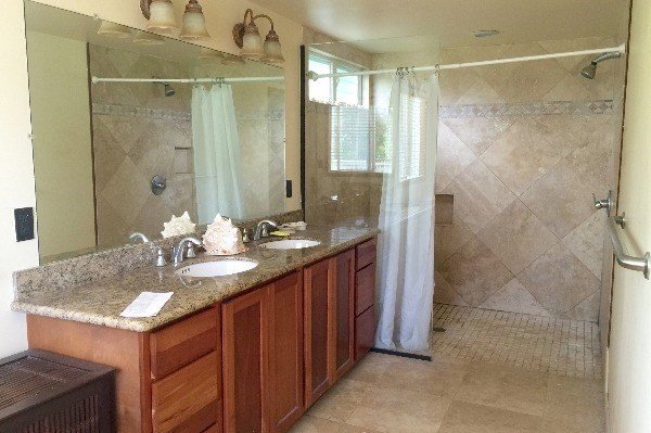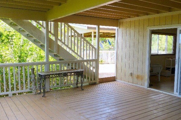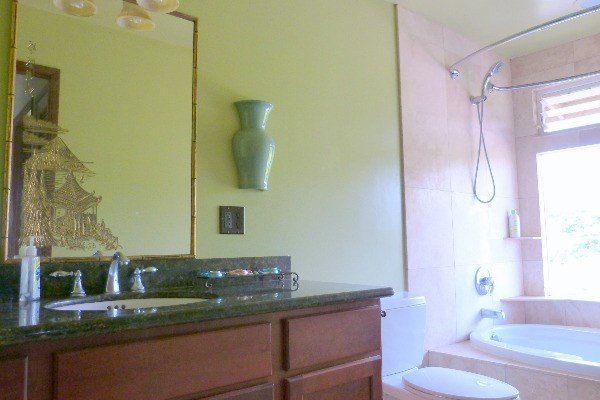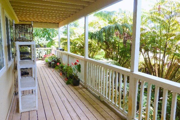 The home has 3 bedrooms 3 baths, each with granite counter tops, as well as the kitchen having a granite counter top. Wake up in the morning to views of Mauna Kea from one of the bedrooms, or while soaking in the large bathtub. You can enjoy your morning coffee with ocean views from the deck, kitchen, living room, or bedroom. There is a 2 car garage plus large work area, and a guest room with full bath downstairs. Listen to the waterfall from the house or yard. If some trees were trimmed or removed from the gulch, as in the past, you could view the gulch and a large waterfall. (Waterfall is on neighbor’s property.) Go Green - be self sufficient with photovoltaic panels producing your power. A large catchment tank collects your water.