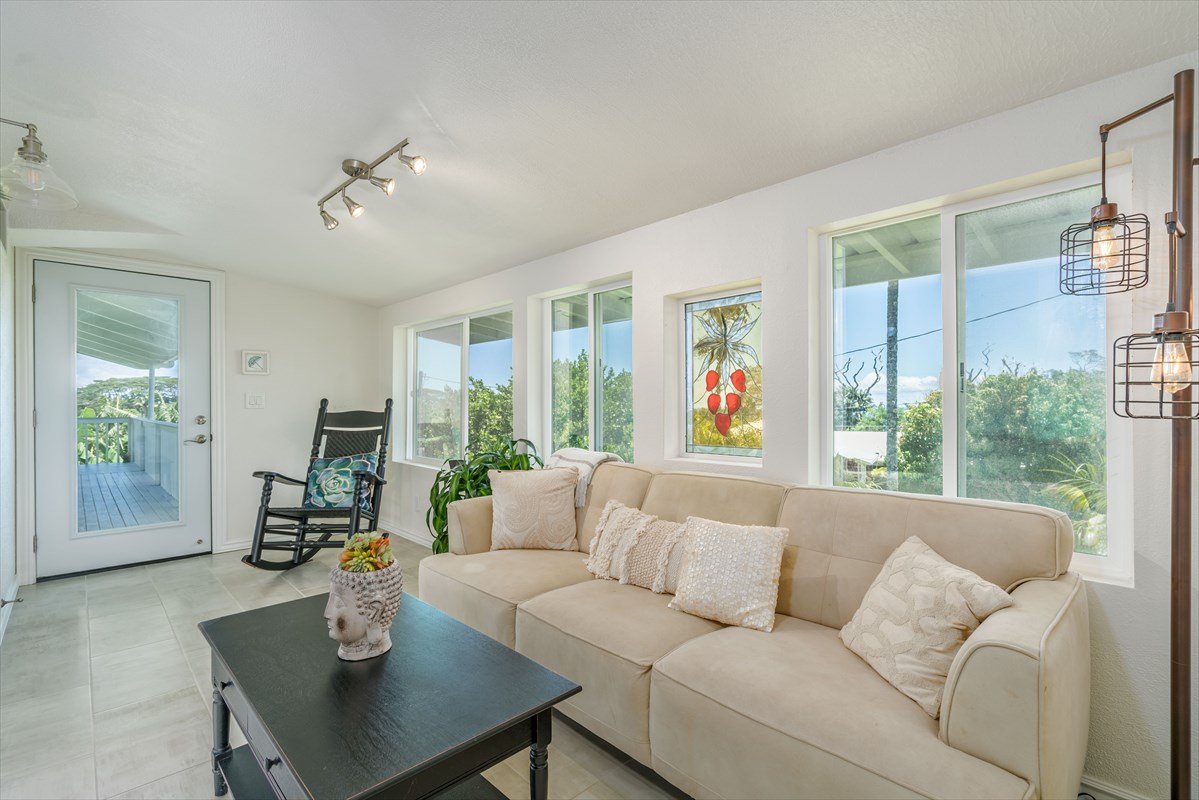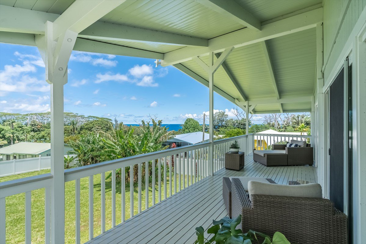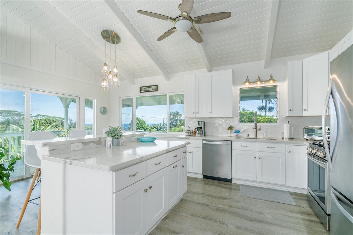 Large modern farmhouse in Honomu with ocean views and tasteful renovations. Completely remodeled in 2018, everything was rebuilt with high-quality materials and furnishings. Designed by a team of professional interior designers, this STVR PERMITTED profitable vacation rental is a MUST SEE! ALL furniture and appliances are included, TURN KEY!Featuring~ -Total of 3768 sq. ft. under roof! On large parcel that can be subdivided or have a guest home built. -5 bedroom/ 3 bathroom, 2 masters “bedrooms”, sunroom, 1 kitchen, 1 kitchenette, large indoor laundry room, lots of closet storage! -Brand new custom white cabinets, modern off white honeycomb backsplash, off white grey vein quartz countertops, double wide kitchen sink, brand new top of the line appliances. -Gorgeous cool-white ship lap textured walls in the kitchen/entertainment room create a beachy farmhouse vibe. -High quality "LifeProof” grey-toned wood plank laminate throughout the entire house. -Custom tile work in all 3 bathrooms, off white Subway tile in master bath, pebble stoned showers. -Giant ceiling mounted shower head creates a waterfall effect in the master shower! -Sunroom with vintage stained glass window, ocean view, and custom stained indoor barn doors. -Large windows and extra-wide sliding glass doors upstairs offer a view from every seat in the room. -Large wrap-around ocean view deck offers plenty of space for lounge furniture, outdoor dining table, a reading nook, or crafts. -Private entrances to both master bedrooms and multiple doors in the house offer the ability to split the house into separate “units”. -Mature and valuable Hawaiian landscaping, ponytail palm, grand palms, coconuts, citrus, coffee, bananas, etc. -Well-maintained lawn (great for yoga, relaxation, hosting barbecues, kids, etc) -Outdoor Cedar gazebo w/ handmade pebble stone walkway and concrete pad perfect spot for a large outdoor dining table or hot tub.