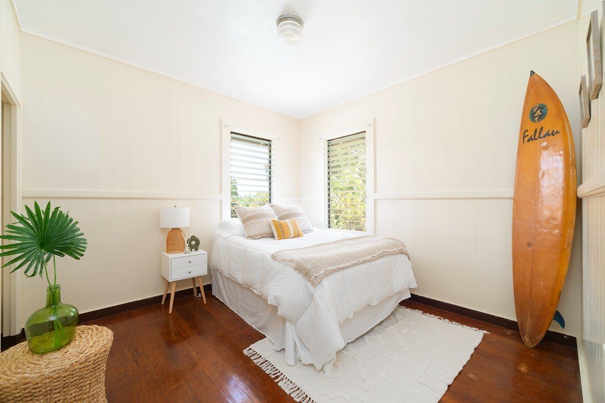 A classic 1940's planation era home with all the vintage charm! This well maintained 3 bedroom home features high ceilings, hardwood floors, unique built-in cabinetry, two large picture windows and tons of jalousie windows throughout to enjoy cool breezes or bask in natural light! The bright living room and shared dining room flow nicely into the kitchen via a convenient pass-through feature. The kitchen boasts custom hardwood cabinets, ample counter/work space and beautiful glass-pane built-in cabinets to showcase your best kitchen pieces! Bedrooms are cozy and bright located at both the front and back of the home and are separated by a shared bath; fall asleep to the soothing sound of the distant river and wake-up to peek-a-boo views of Mauna Kea on a clear day! The third bedroom can be used as an extension of the front room or as a flex space. Below the home is an unfinished open basement (convenient for storage or a workshop), laundry hook-ups, a wash room and an old fashioned cement shower!