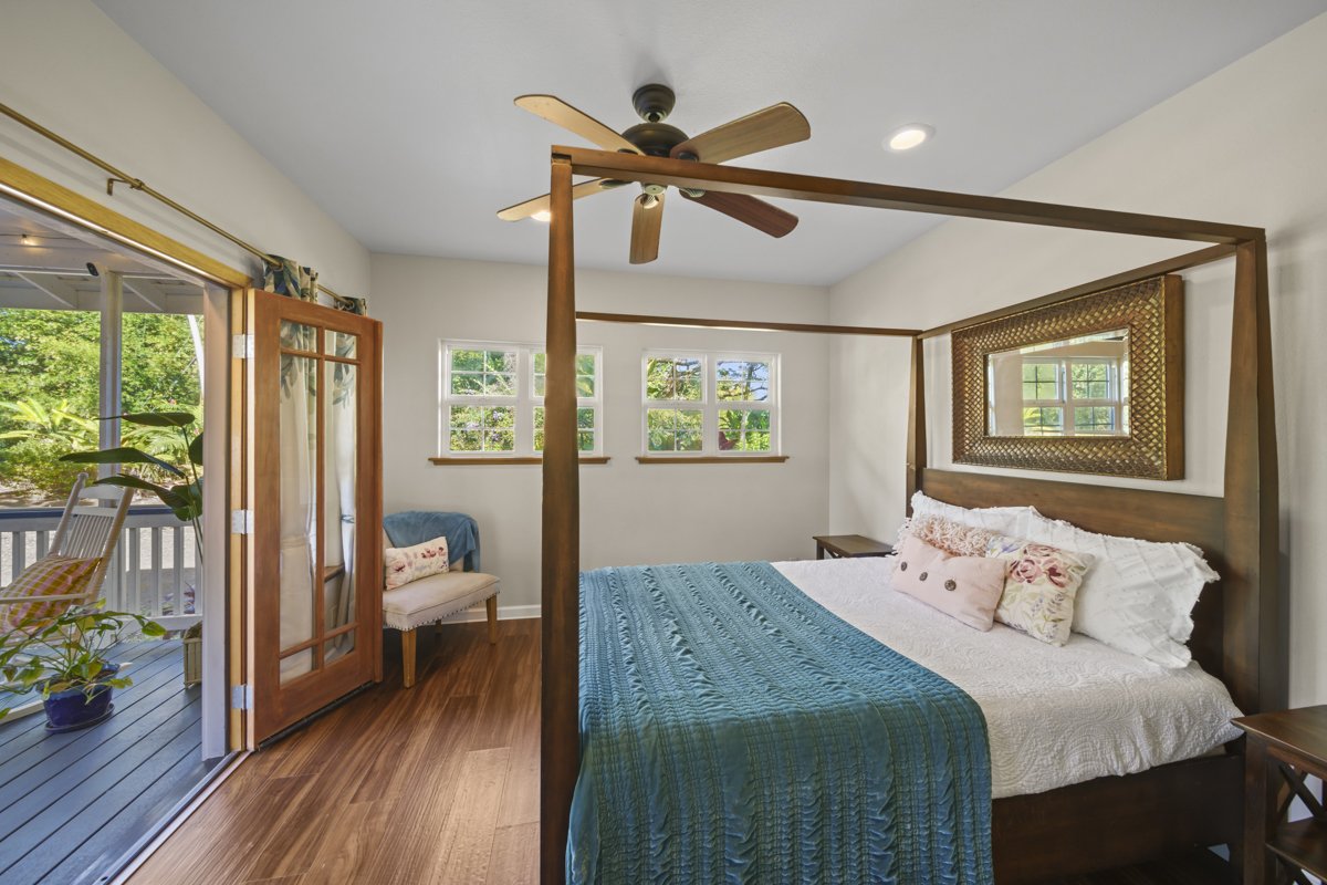 Perched along the stunning Hamakua Coast, in the Pepeekeo Point Subdivision, this majestic property offers a rare opportunity to own an estate-like retreat with ocean views, lush landscaping, & income potential. This 3.54-acre parcel is for those who appreciate privacy, security & enjoy Hawaii’s natural beauty. The main residence features an open-concept living area, vaulted ceilings with ceiling fans throughout. Large windows frame the unobstructed ocean views with cool ocean breezes. The spacious kitchen is well-equipped with ample granite counter space, stainless steel appliances, a gas cooktop. A nostalgic dutch door leads to a huge screened lanai offering a cool space for gatherings and dining. Flooring in main residence is monkeypod hardwood in living and primary bedroom spaces with tile in kitchen and baths. The primary suite is a retreat of its own, complete with a private lanai made of teak wood, where you can watch the sunrise over the ocean. The ensuite bathroom features a walk-in shower and raw edge wood vanity. The two additional bedrooms and an additional full bathroom offer flexibility for guests or a home office. Another half-bath is located off kitchen area. Another standout feature is the separate 'ohana unit, previously a hosted Short-Term Vacation Rental. This private space includes high ceilings, ample natural light, and modern amenities, making it ideal for guests, extended family, or rental income. The deluxe bathroom overlooks a seasonal creek, surrounded by mango trees and banana grove making you feel one with nature. Outside, the landscaped grounds are teeming with tropical flowers and a medley of fruit trees including: orange, lemon, soursop, jackfruit, papaya, pineapple, avocado and more. The acreage offers plenty of room for gardening and outdoor activities, along with ocean access. Located in a gated community, this property provides privacy while still being convenient to Hilo’s amenities, shopping, and dining.