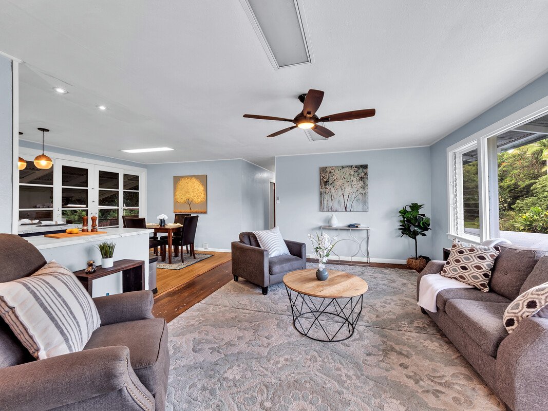 Enchanting property will weave it's way into your heart! With almost 7 acres of tastefully manicured greenways, the property hosts fruit trees, florals, and a vintage home which could be 2 separate units. Did I mention it also offers a place to host to your own 3 hole golf tournament? A producing avocado and white pineapple patch greet you as you enter the long driveway where you will find a home built by a master carpenter for his own use. The original carport has been screened in to create a fun space to relax, and live the way we love to live in Hawaii! Enter the home up a few steps to the upper area where the original kitchen area has been opened to a great room, where oversized windows look out at the private setting beyond. The original oak floors have been exposed and are ready for your finishing touches. Down the hall where 4 bedrooms are now 3, the main bath has been completely updated to modern standards. At the rear of the home, a primary bedroom has been created by removing the wall between two smaller bedrooms. Downstairs a wetbar area and bath (also updated), large sitting area and bedroom could easily be accessed thru the exterior entrance, making it possible for guests or even tenants to have their own private space. Exit this space to find an oversized carport area and enclosed workshop. Don't be fooled by the square footage, this home lives large! The best feature by far is the unique location just a few minutes from Hilo, Keaau, Panaewa Zoo and the equestrian center. Priced so that future renovations will still be in budget, this property is ready for you and your Ohana to love for years to come!