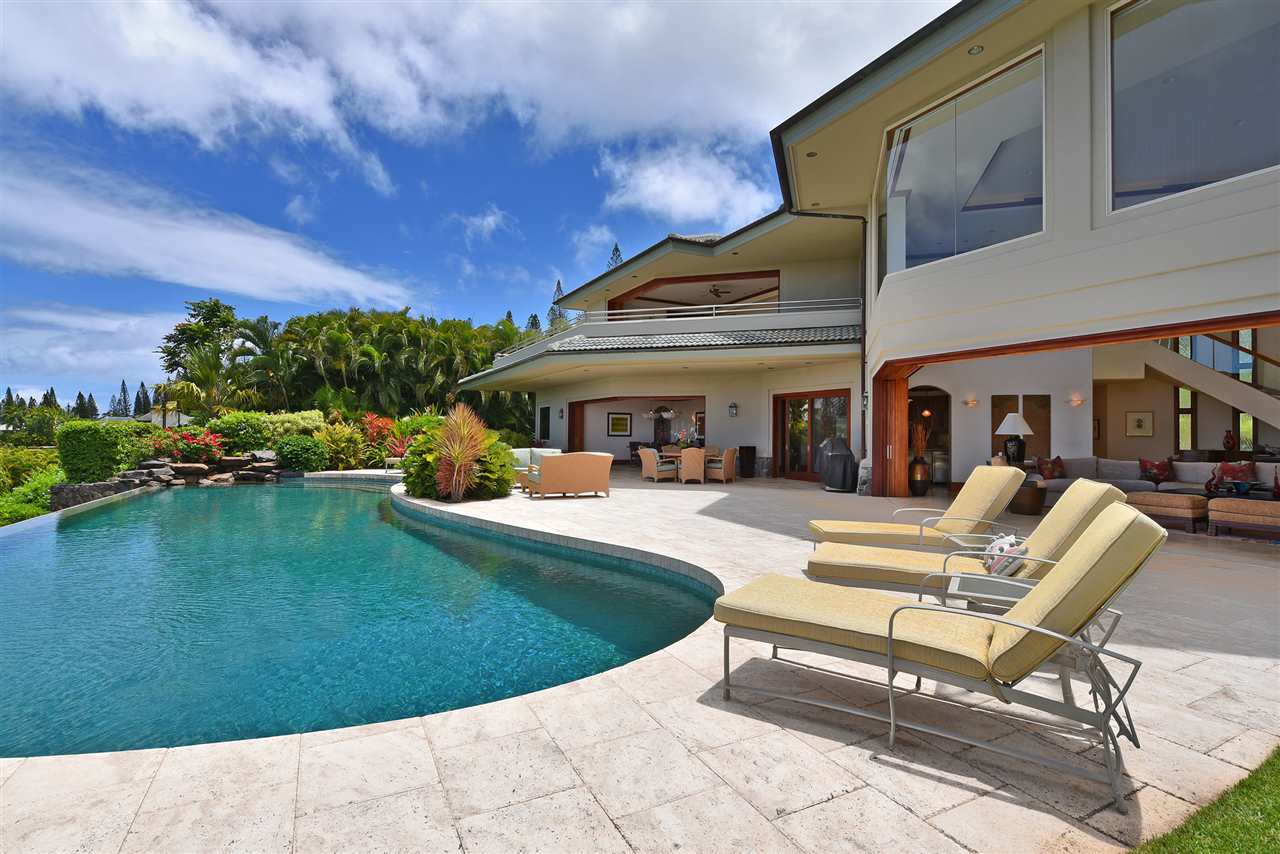 Magnificent 5 bedroom, 5 1/2 bath home with the finest craftsmanship and materials in this very distinctive home behind the gates at Pineapple Hill at Kapalua. Sprawled across 2 lots and meticulously maintained, the former home of one of music's all time favorite musicians is now available for you to enjoy. Property also includes an approximately 464 square foot building ideal for workouts or to use as an office. Beautiful pool with cascading hot tub and private landscaped area for yoga and meditation. Main level with no steps are where you will find the 4 en suite guest bedrooms plus powder room, kitchen, dining area, entertainment room, and office. The master bedroom is accessed with beautifully curved stairway with huge master bath and master closet.
