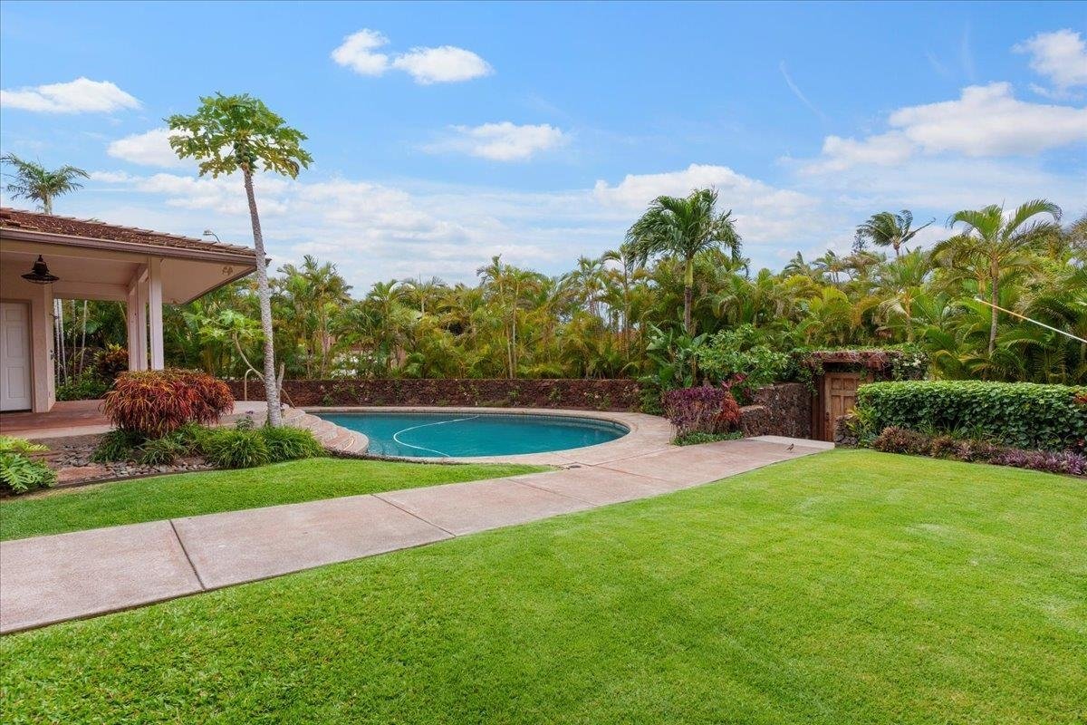 Your Secret Garden home on Maui lives at 35 Puu Hale St. in the revered community of Kaanapali Hillside. This beloved neighborhood with mostly full time residents is within walking distance or golf cart cruising distance to the golden sand shores of Airport Beach. Through the inner courtyard doors you step into a serene and private tropical sanctuary fortified by timeless lava rock walls where fruit trees, flowers, and a heated saline pool bring ultimate relaxation and sun-drenched satisfaction. This large single level home features a Spectacular Great Room with soaring 25 ft. open beam ceilings that makes it a uniquely grand and welcoming space to live and entertain. With views to the garden enclave and pool, the primary suite is spacious as is its ensuite travertine tile bathroom equipped with a jetted tub and walk-in shower with a massive window where jade or orchid plants would thrive. Just outside the primary lives an outdoor casita with a relaxation deck and the spa perfect for stargazing. The solid hardwood amber colored floors are handsome and offer great contrast to freshly painted creme walls, the lofty ceilings and invigorating natural light. Custom lighting and large walls are the perfect palette for stunning artwork to be displayed. The home features a multi-zone central A/C system along with PV electric. The home breathes very well with the cross winds through the multitude of large glass windows and sliding doors. The kitchen is simple yet picturesque and with stainless appliances, verdant natural stonework, and has pass through windows out to what would be a perfect outdoor grilling area perched over the pool. Adjacent to the kitchen area is an office/den that could easily be converted to a 4th. bedroom. This is a perfect clean slate for those looking for a fresh start in a beloved Kaanapali Home.