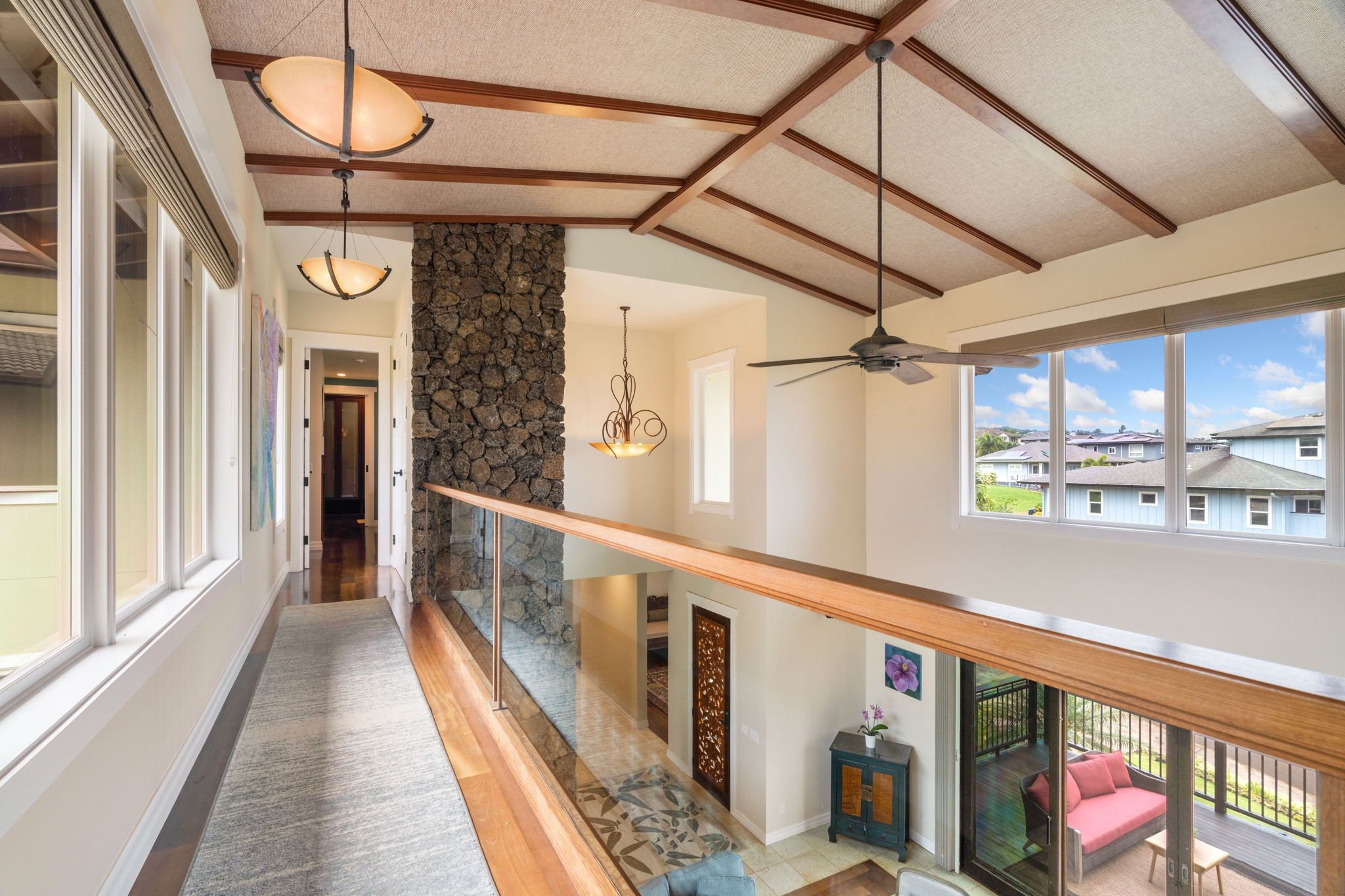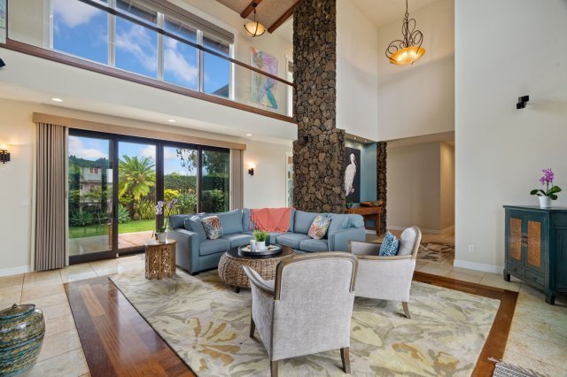 Gorgeous one-of-a-kind home with both ocean and Haupu mountain views! This unique property features two covered lanais and one large Brazilian Walnut wood lanai — all with extraordinary and expansive views. The extensive lava rock work throughout is featured in the foyer, the soaring floor-to-ceiling great room fireplace, the outdoor shower and fire pit, and the privacy wall that encloses the entire backyard!